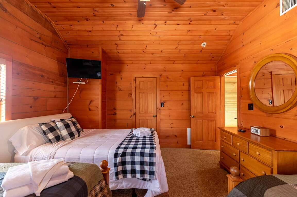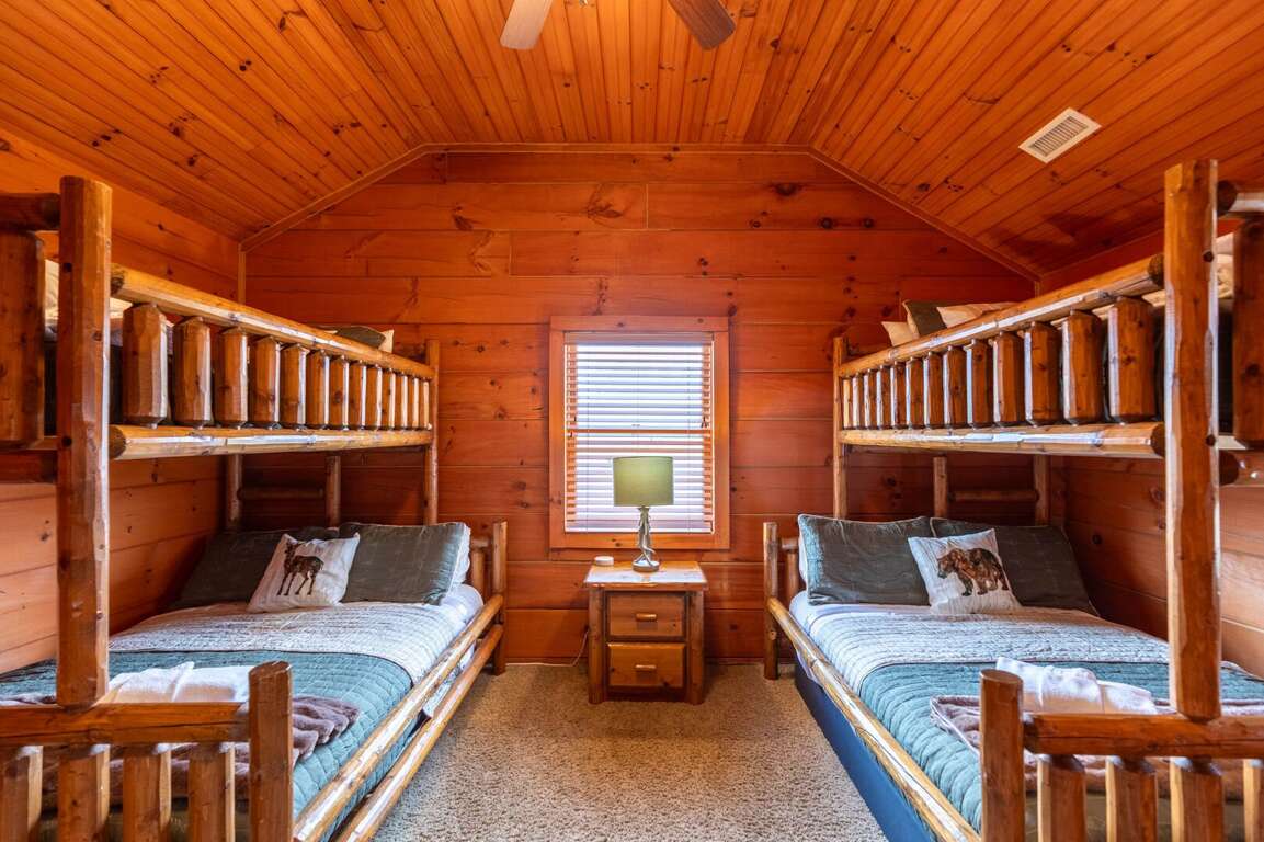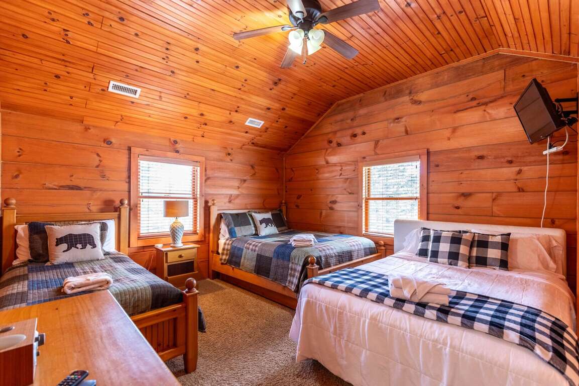 The upper level includes a large bedroom furnished with two queen beds and a twin bed, offering flexible sleeping arrangements for groups or families. Nearby is a private room with two twin-over-double bunk sets—great for kids or additional guests. A full bathroom serves this level, and each bedroom is equipped with its own TV.<br />
