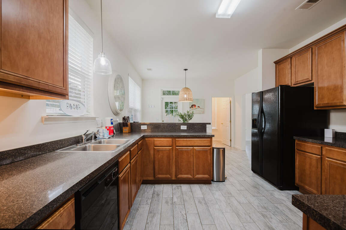 The full kitchen is fully equipped with everything you will need to enjoy a short or long term stay, and with a formal dining room, barstools, and a breakfast nook - there is no shortage of places to gather with family and friends. The open floor plan creates a spacious, inviting atmosphere, perfect for family gatherings or quiet moments of relaxation in Bluffton, SC. This short term rental also has a desk/workspace in the living room for those who may need to log-on during vacation. The primary bedroom offers a king-size bed, a smart TV, and a private en-suite bathroom, providing a peaceful sanctuary after a day of exploring. One guest room features a queen-size bed, while the other is furnished with two twin sized beds, ensuring plenty of space for everyone. For added convenience, guests have access to an on-site combination washer/dryer. Directly across from Oscar Frazier Park - which offers plenty of green space, walking paths, a playground, and seasonal splash pad - this home truly offers the best of Bluffton, SC!