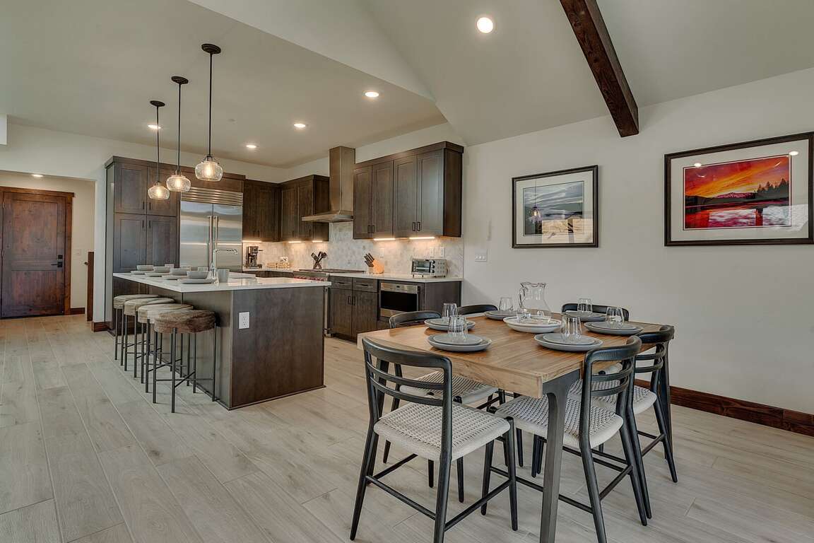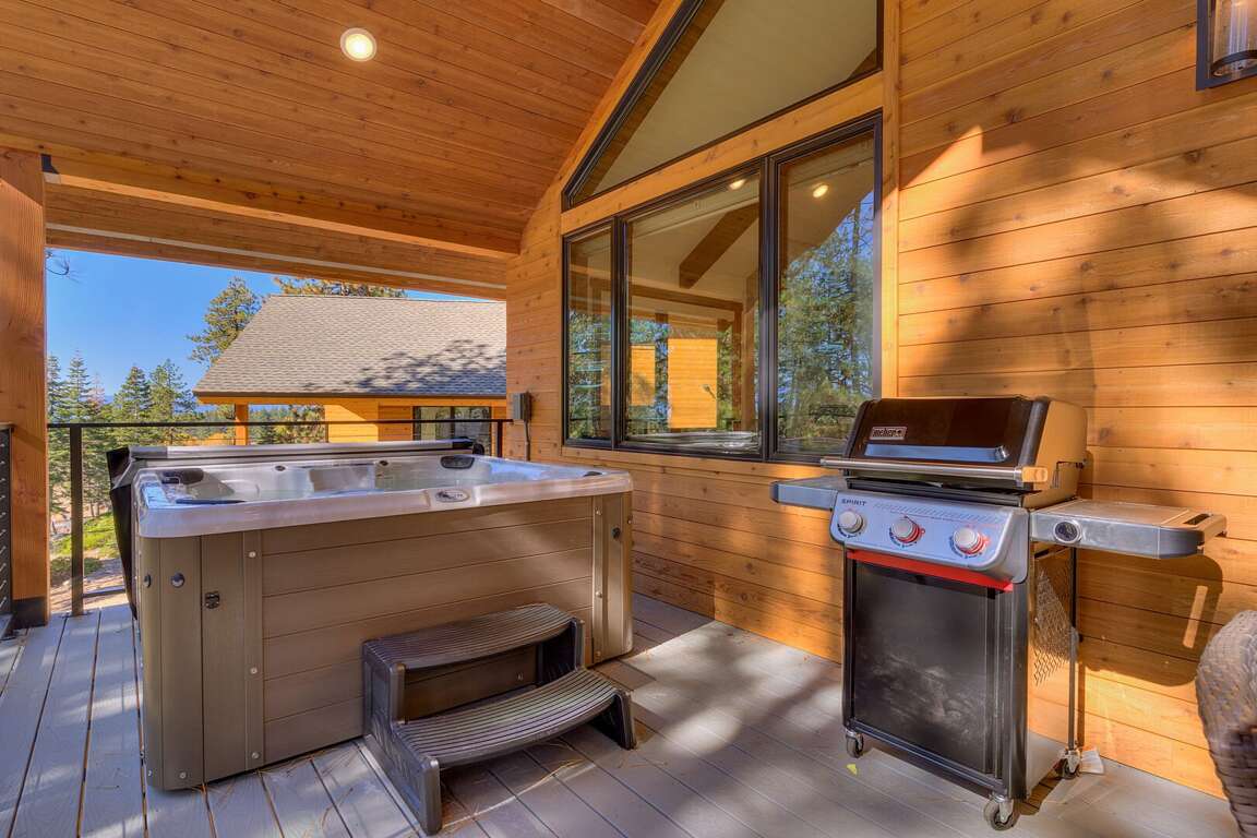 The gourmet kitchen is equally impressive, featuring a spacious island with stylish pendant lighting and high-end appliances perfect for gathering, cooking, and entertaining. An inviting outdoor deck awaits, complete with a spa, grill, and comfortable seating area overlooking the pines.<br />