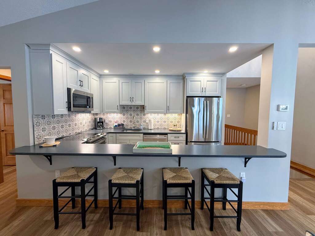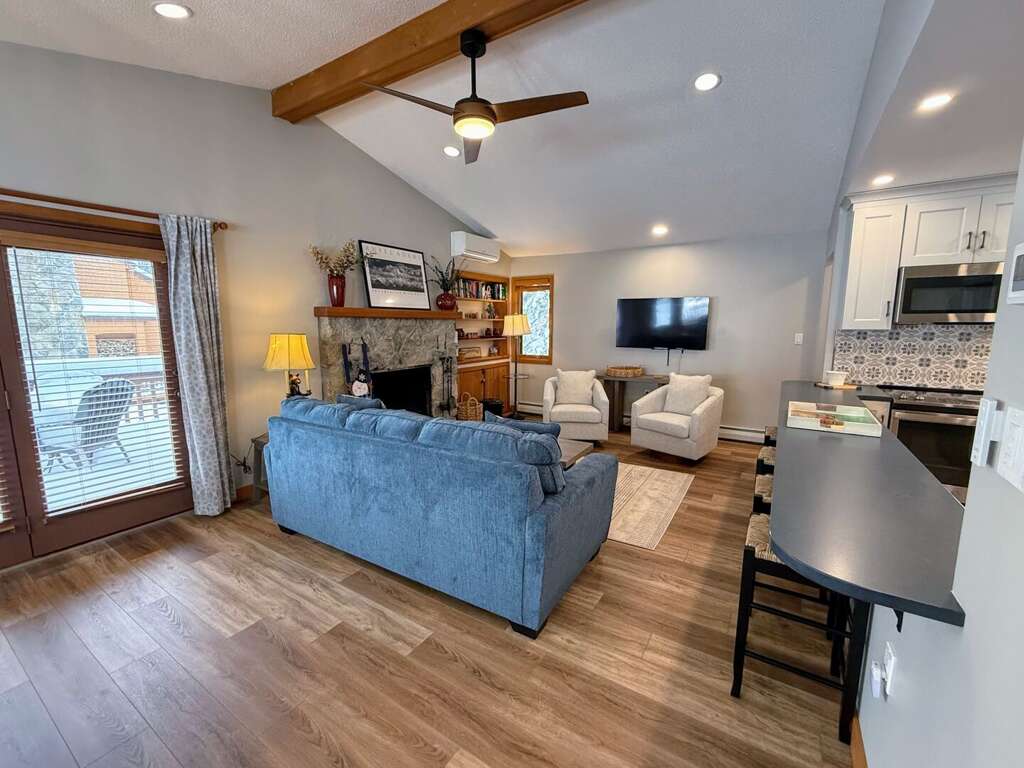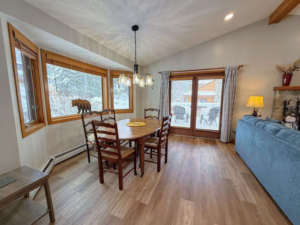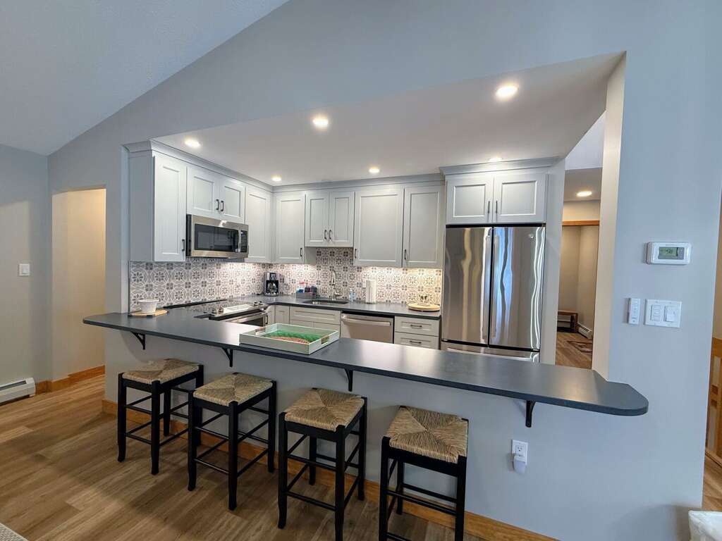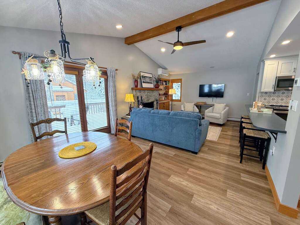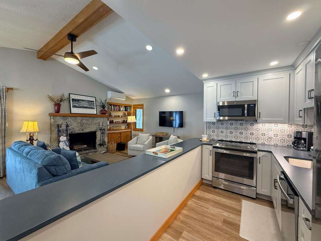 Enhancing the luxurious ambiance of this vacation rental in Bretton Woods are the well-appointed kitchen and inviting living areas designed for relaxation and entertainment. The kitchen boasts modern appliances, making meal preparation a breeze for guests looking to whip up a delicious feast. Adjacent to the kitchen, the open concept living area features cozy seating arrangements, perfect for unwinding after a day of outdoor adventures. The tastefully decorated space encourages socializing, whether it's gathering around the dining table for a shared meal or lounging on the comfortable sofas. With mountain views visible from the windows, guests can enjoy the serene surroundings while basking in the comfort of this elegantly designed vacation rental.