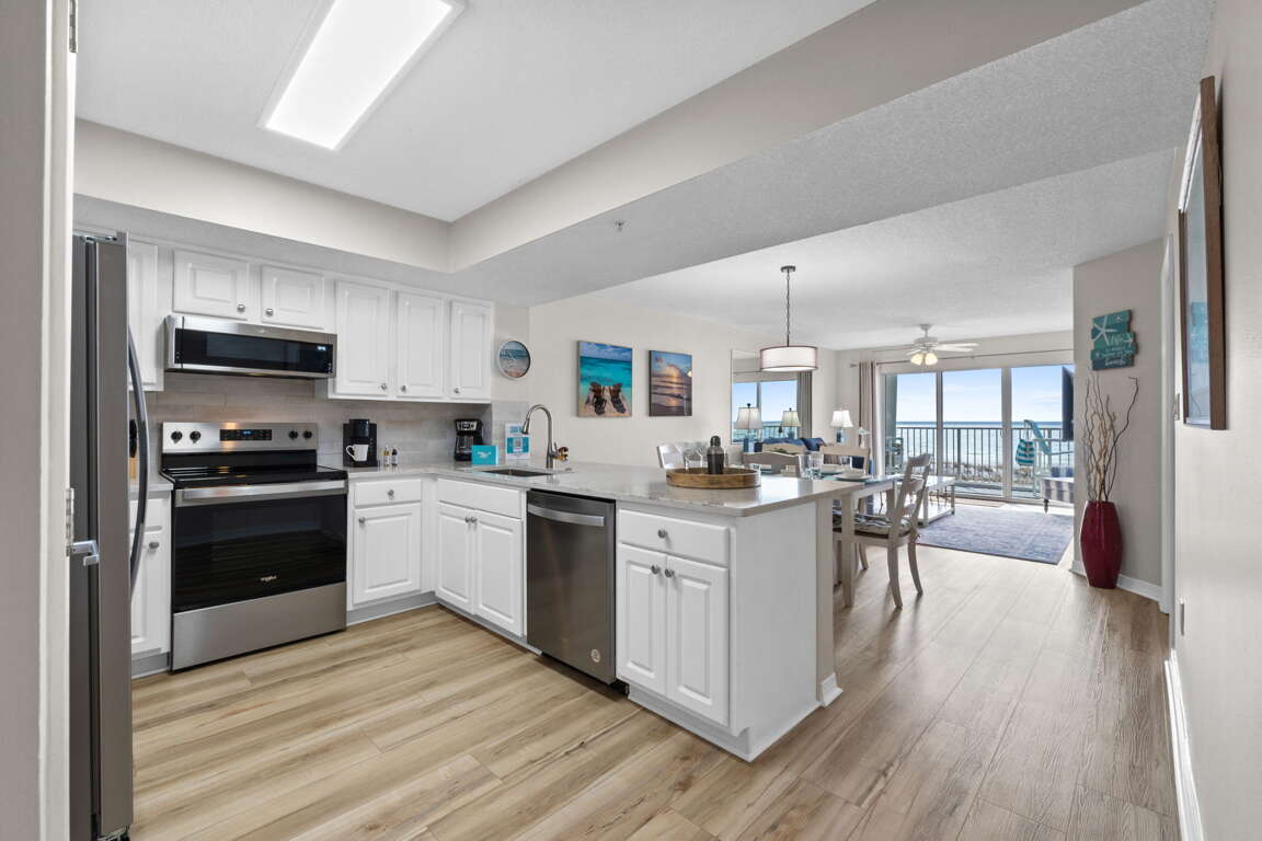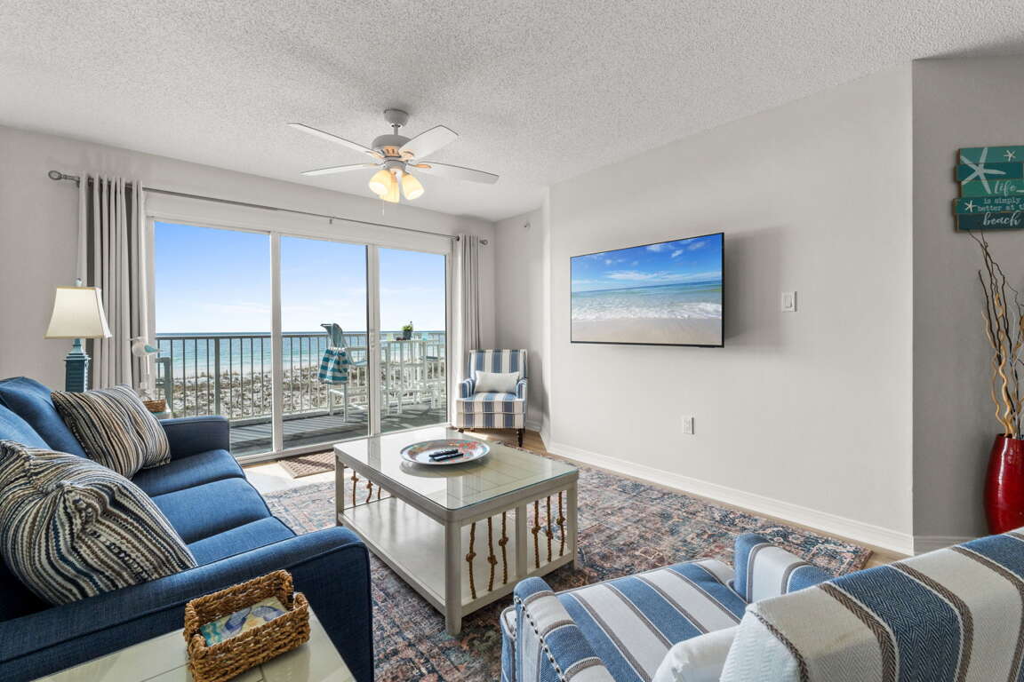 Beachfront condo vacation rental on Okaloosa Island in Fort Walton Beach with Gulf-view balcony, stocked kitchen, in-unit laundry, and sleeps 8 guests.