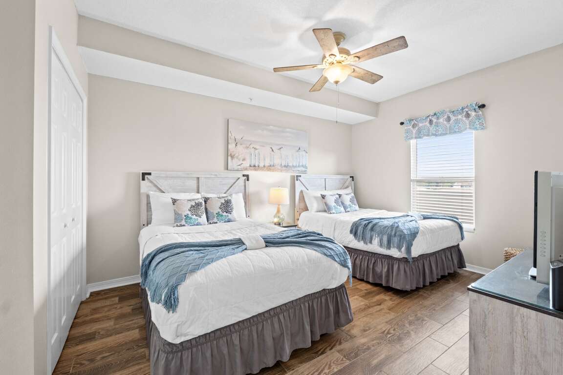 The sleeping arrangements in this unit are as follows: master bedroom - 1 king bed, 2nd bedroom - 2 double beds, 3rd bedroom with bunk beds, NO CLOSET IN THIS ROOM. Sleeper sofa in the living room. This unit sleeps 8.