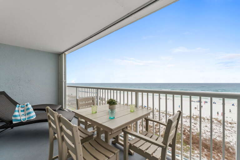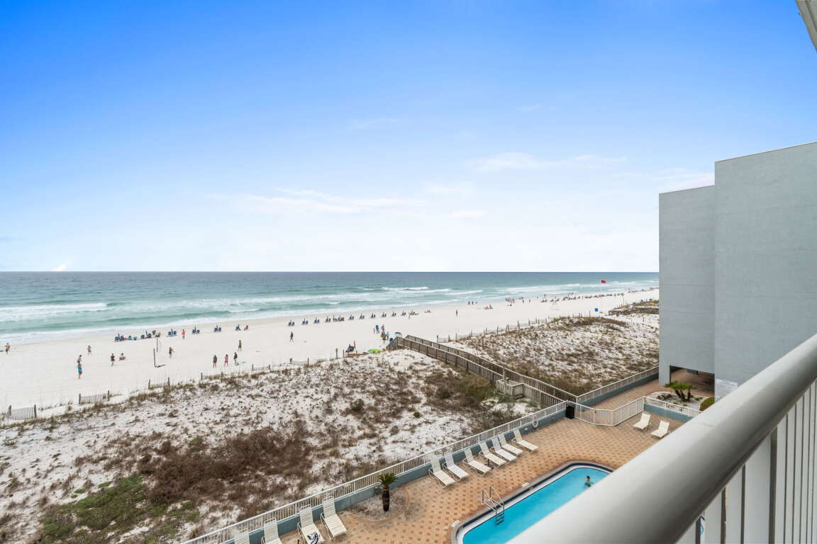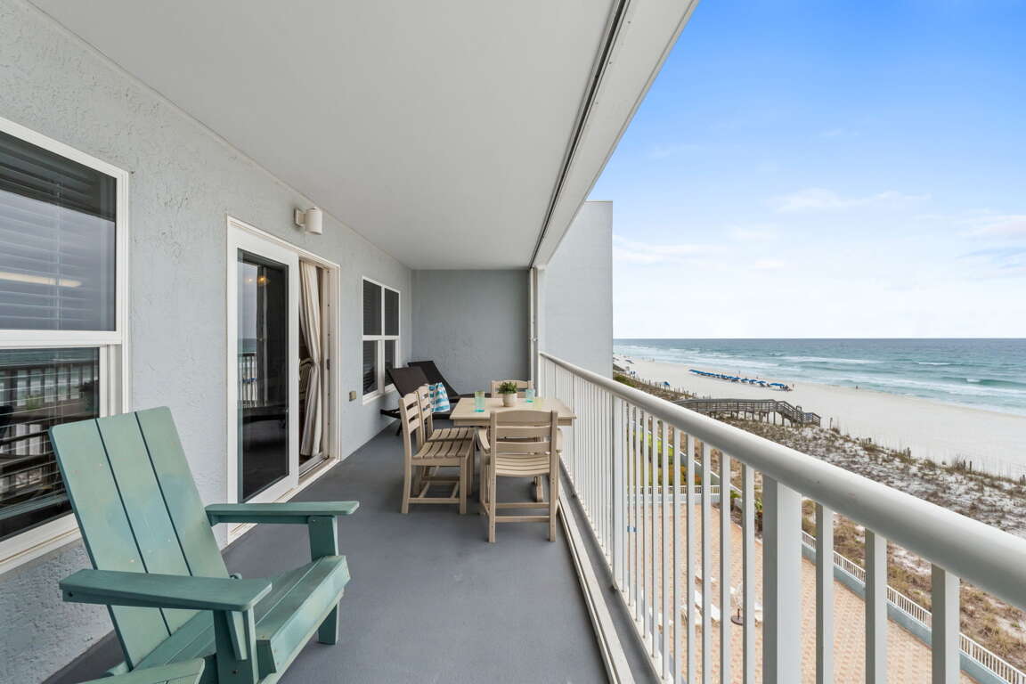 Beachfront condo vacation rental in Fort Walton Beach with 2 king bedrooms, large balcony, Gulf views, and access to a heated pool, gym, and boardwalk.