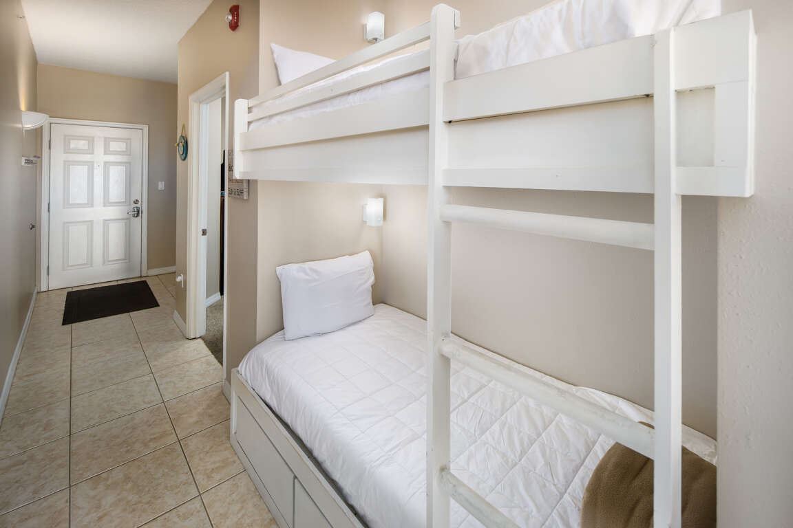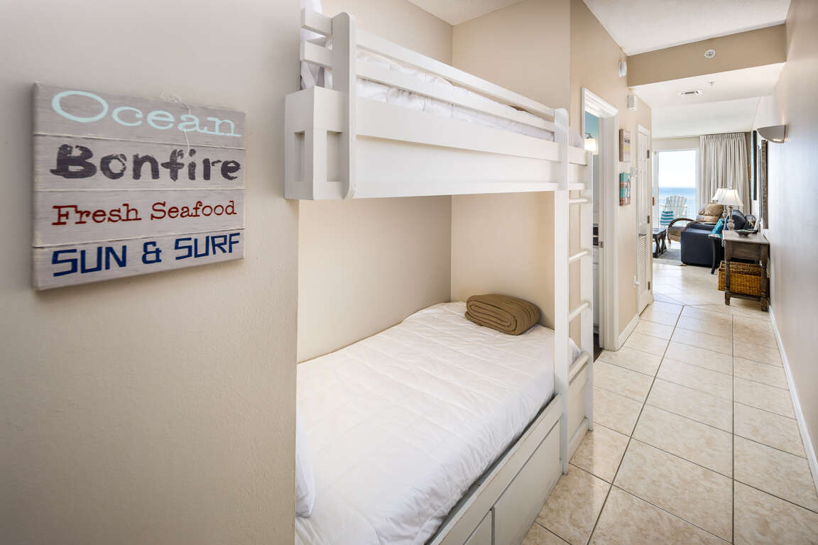 Beachfront condo vacation rental in Fort Walton Beach with a king bedroom, hallway bunks, and sleeper sofa, plus two pools, tennis, and a gym.
