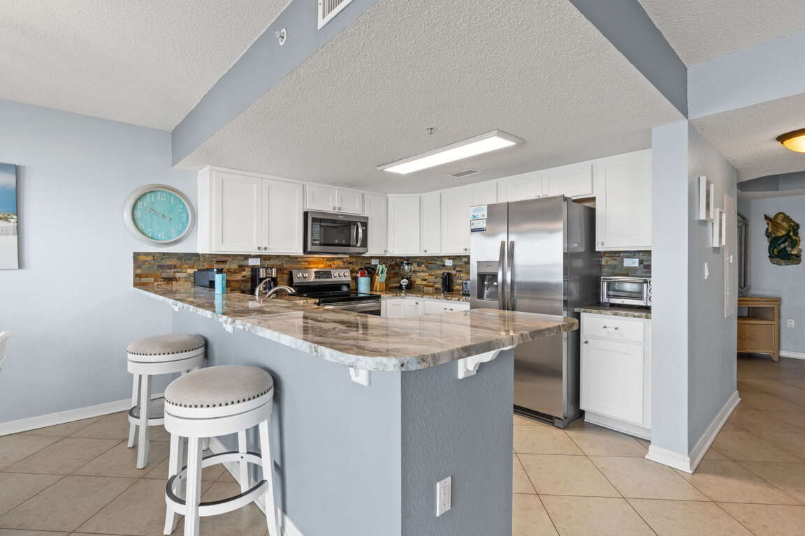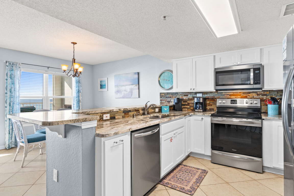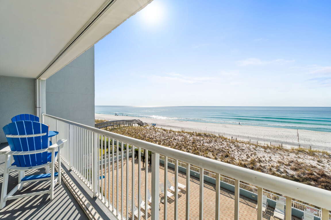 Condo on Okaloosa Island in Fort Walton Beach with direct beach access, Gulf-front balcony views, two king bedrooms, and a full kitchen for a vacation rental.