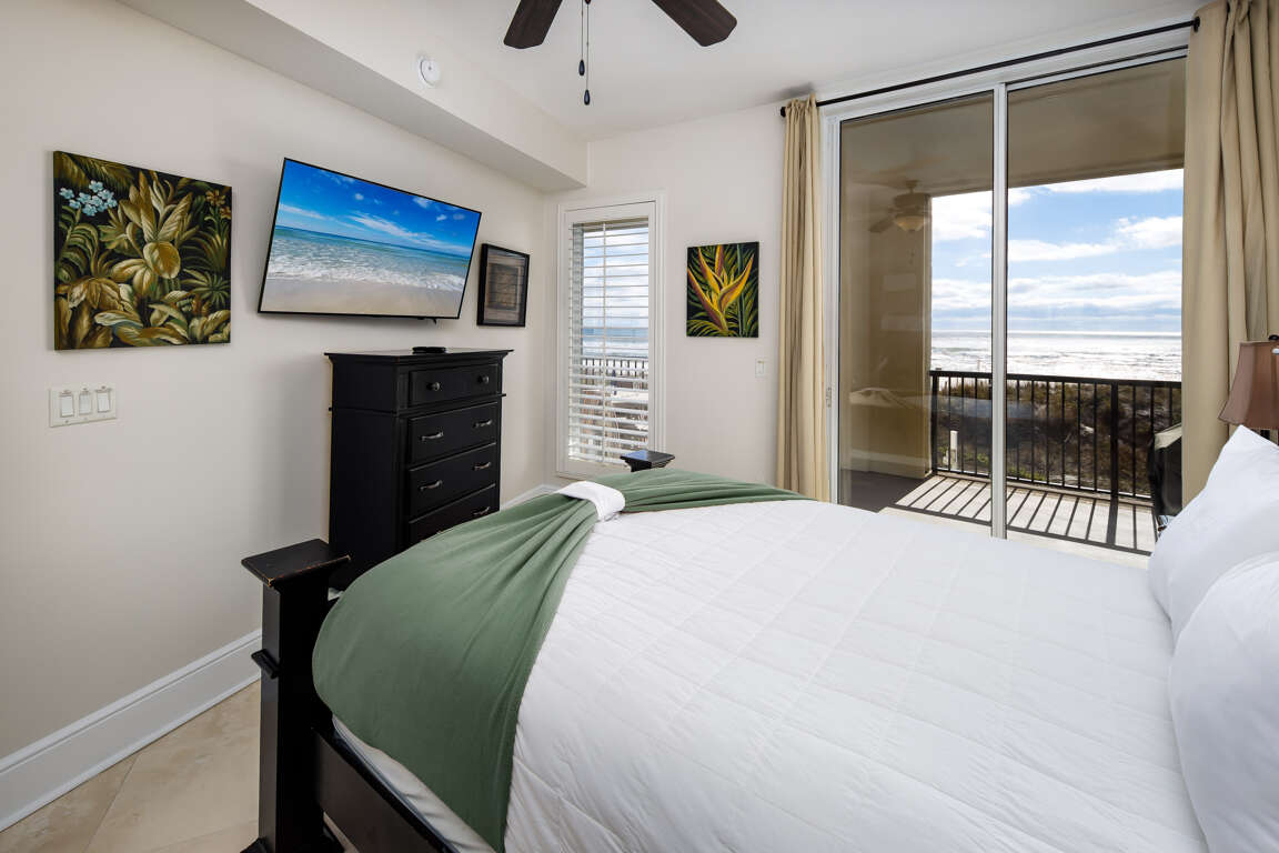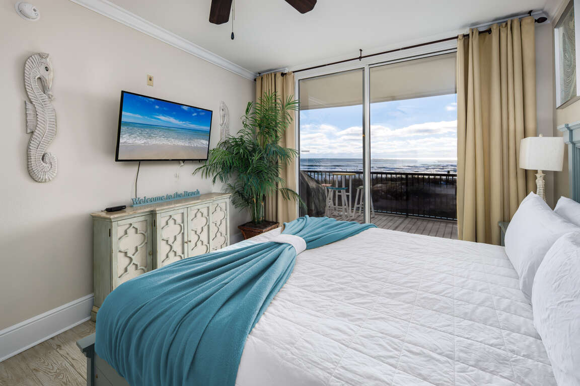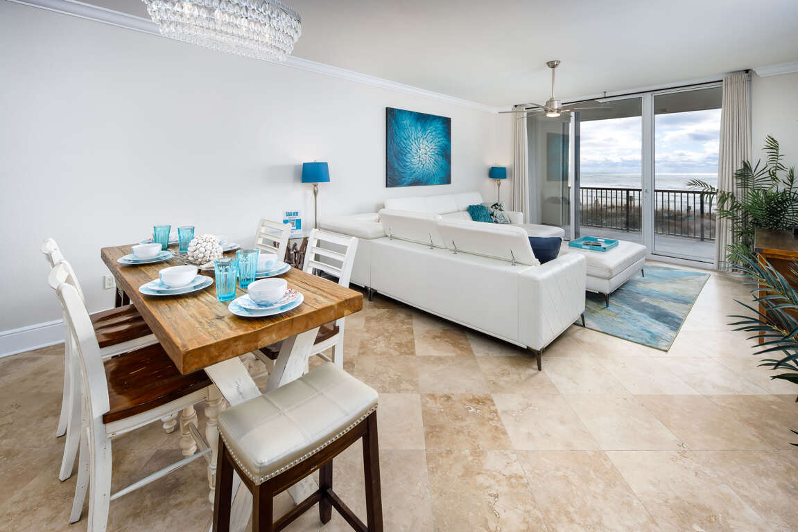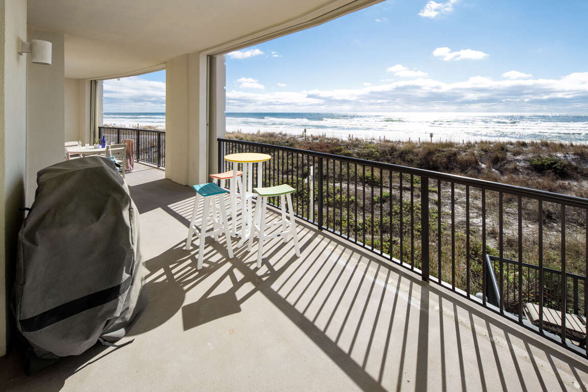 Second-level 4-bedroom condo vacation rental in Fort Walton Beach with Gulf views, large balcony, pool and hot tub access, sleeps 10 guests plus beach service for 10.
