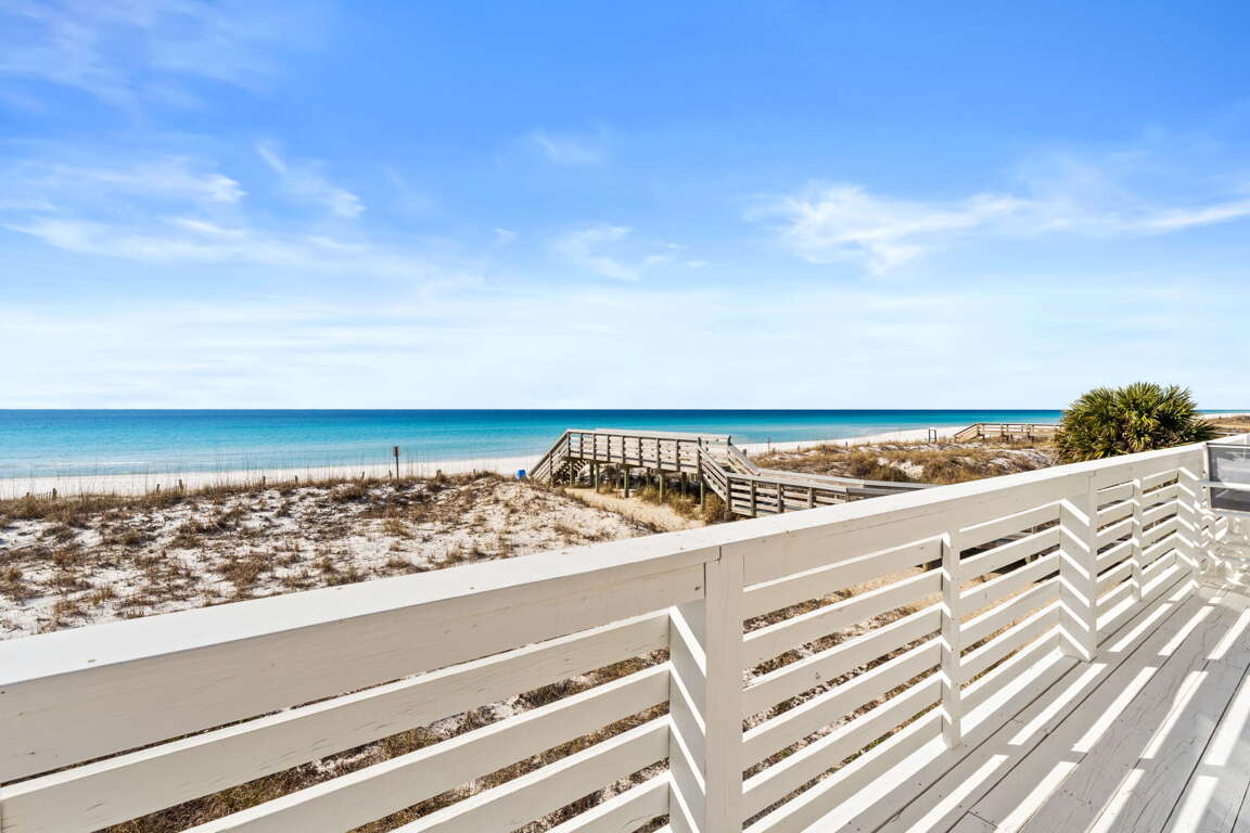 Second-floor beachfront house in Fort Walton Beach with 4 bedrooms, sleeps 12, a full kitchen, private balcony, outdoor shower, and included beach service.
