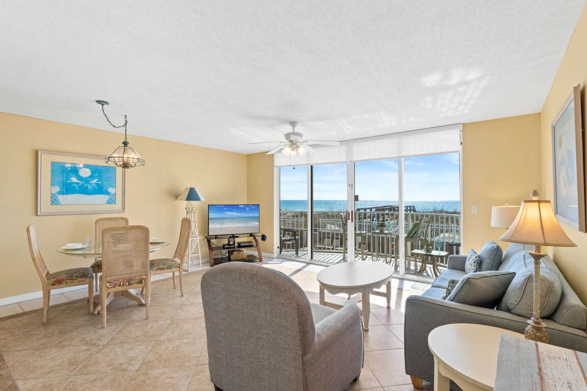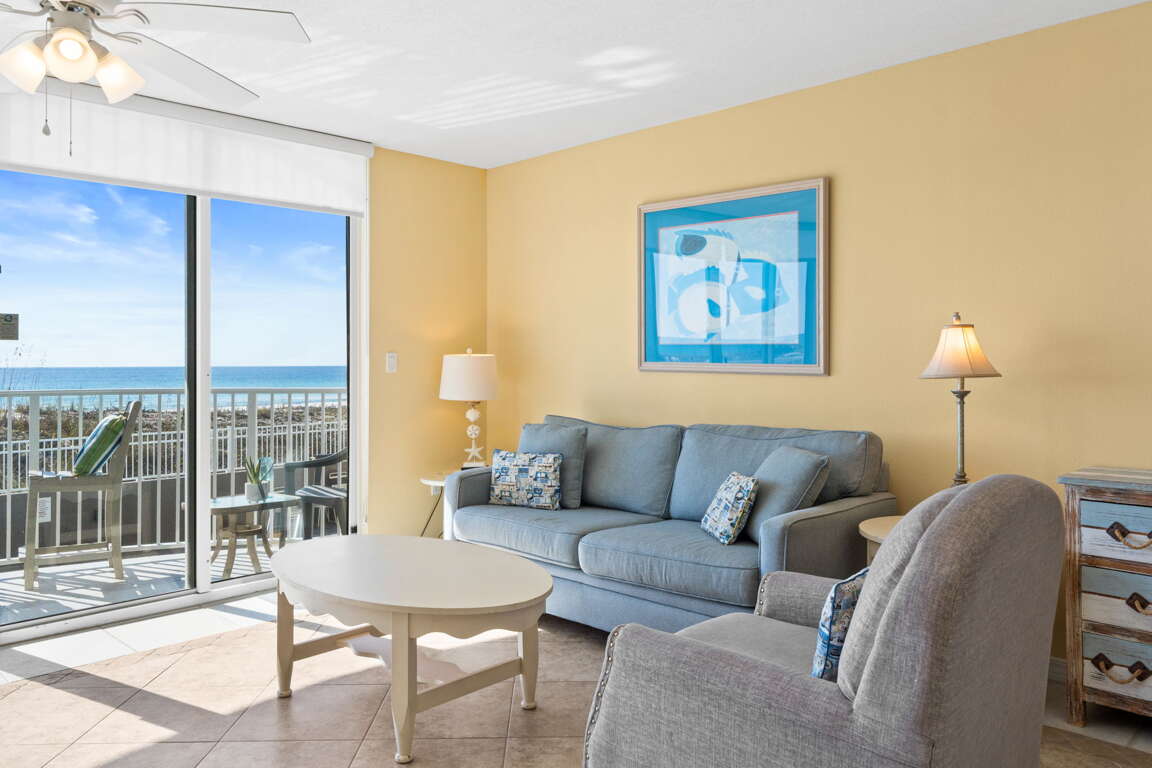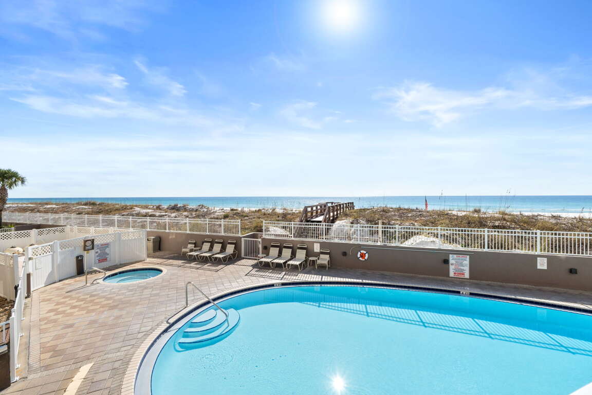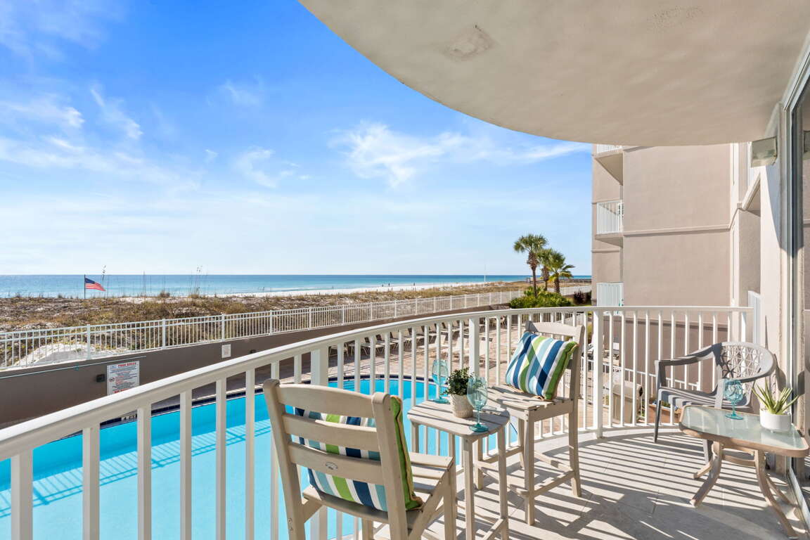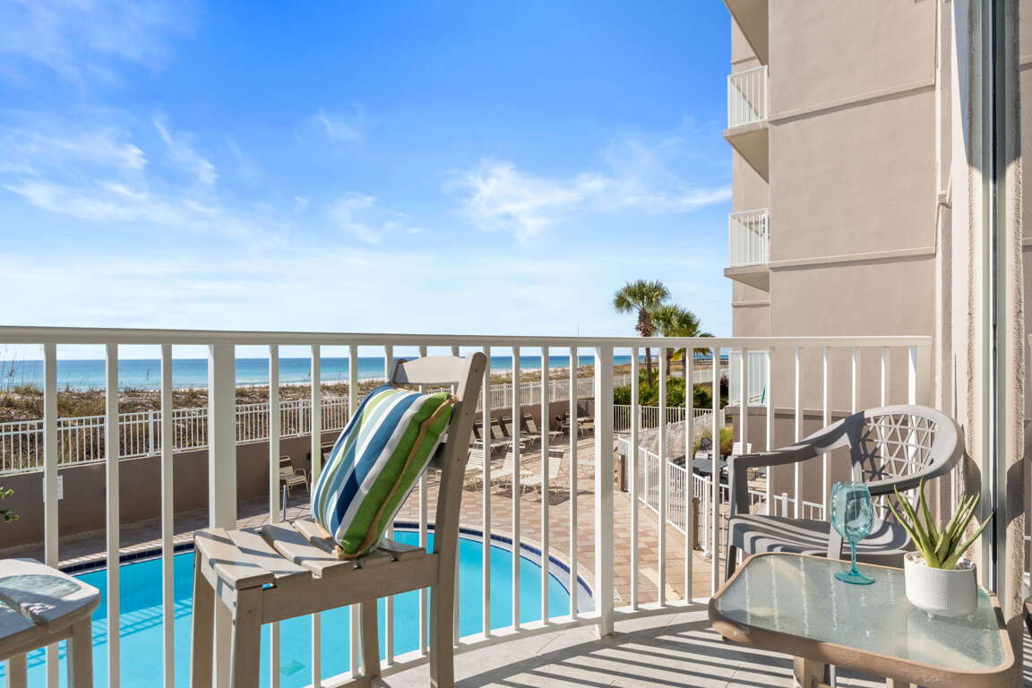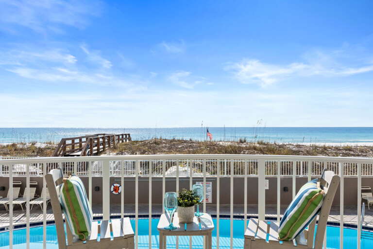 Second-floor beachfront condo in Fort Walton Beach with a balcony, king bed, bunks, and sleeper sofa; a practical vacation rental that sleeps 6 guests.