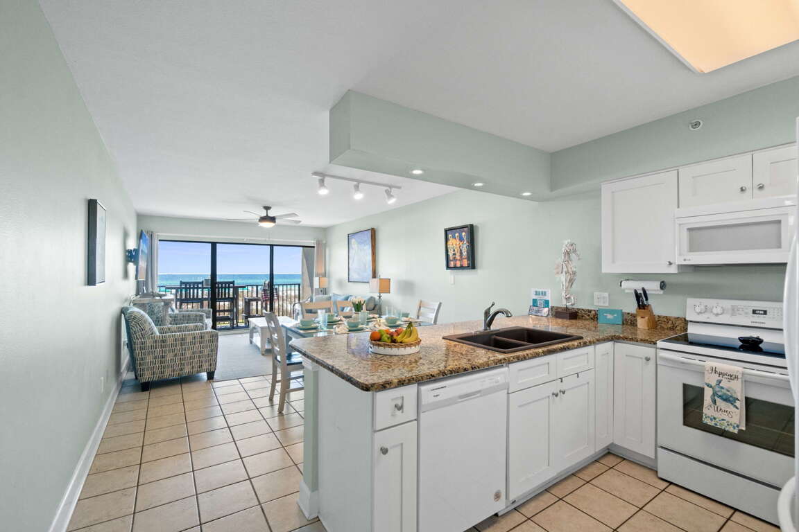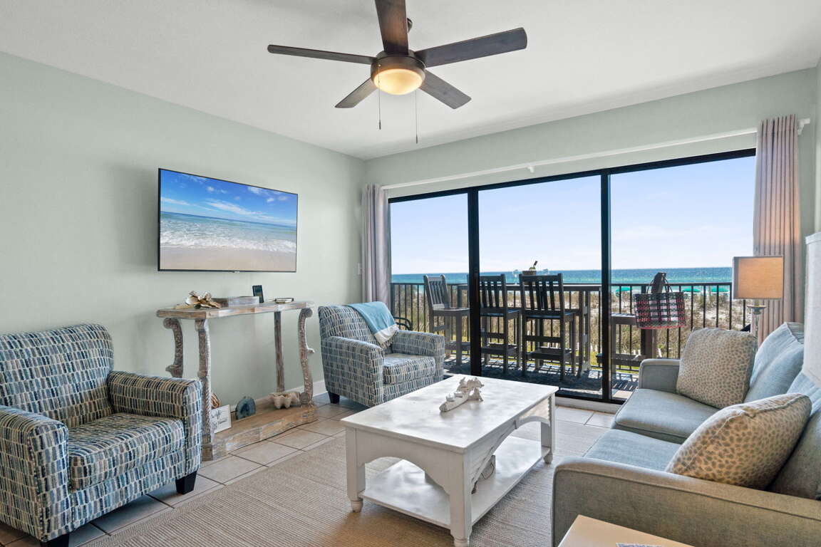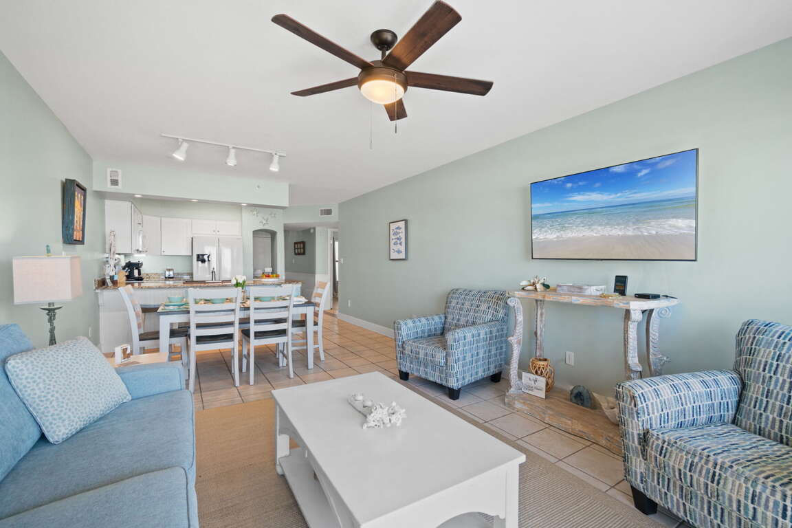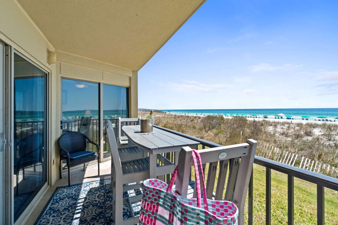 Emerald Towers West 1006 - Breezy Beachcomber is a beautifully decorated 2-bedroom, 2-bathroom beachfront condo, just steps from the Gulf of Mexico, sleeping up to 6 guests. This ground-floor unit offers easy access and convenient parking, ideal for families with children. Enjoy stunning views from the living room and master bedroom balconies. The master suite includes a desk, TV, and an updated walk-in shower. The second bedroom has a queen bed. Relax with meals at the breakfast bar, dining table, or on the balcony. This unit has everything you need for the perfect vacation!