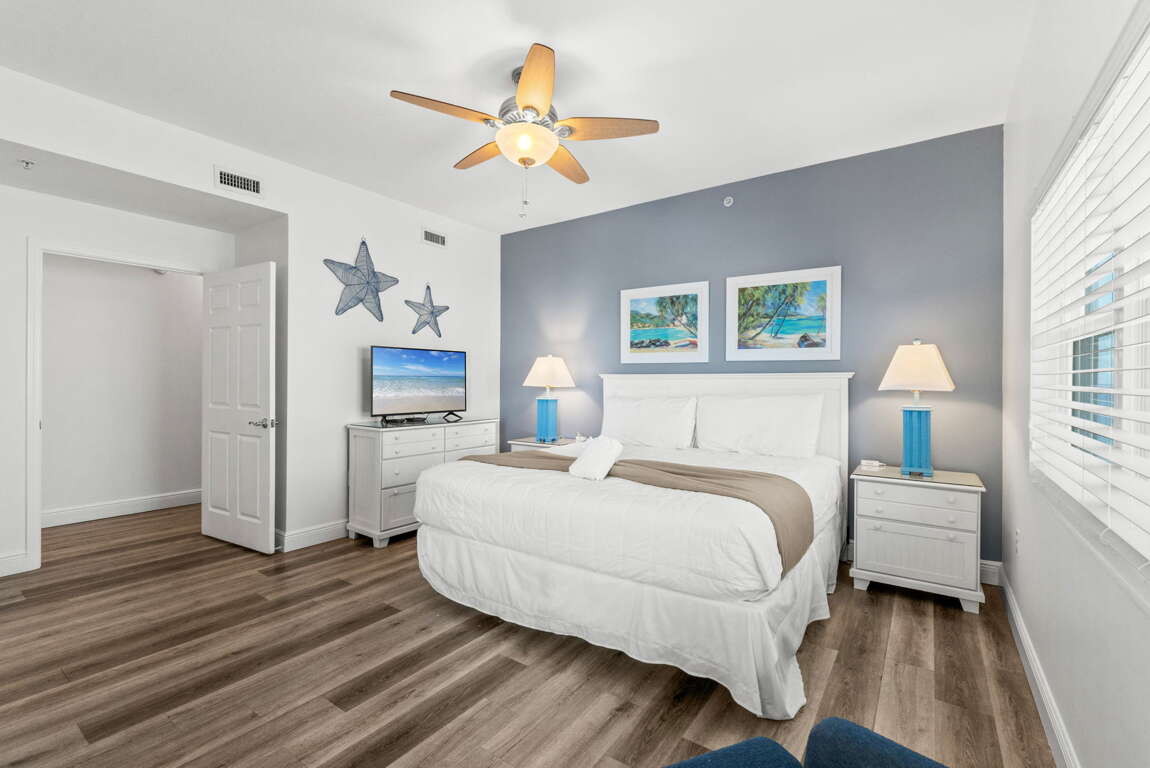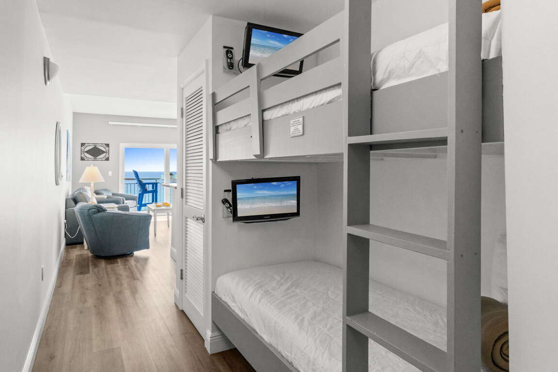 The sleeping arrangements in this unit are as follows: master bedroom - 1 king bed and 2nd bedroom - 1 king bed. Sleeper sofa in the living room, bunk beds in the hallway. This unit sleeps 8.