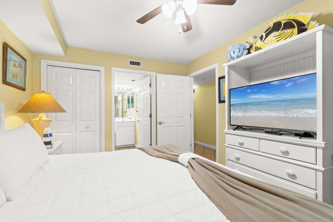 Inside, you'll find a spacious master bedroom featuring a king-size bed and a private en-suite bathroom. The guest bathroom includes a walk-in shower for added convenience. Thoughtfully designed to accommodate up to 6 guests, this condo includes built-in bunks and a queen-size sleeper sofa in the living area – perfect for families or small groups.