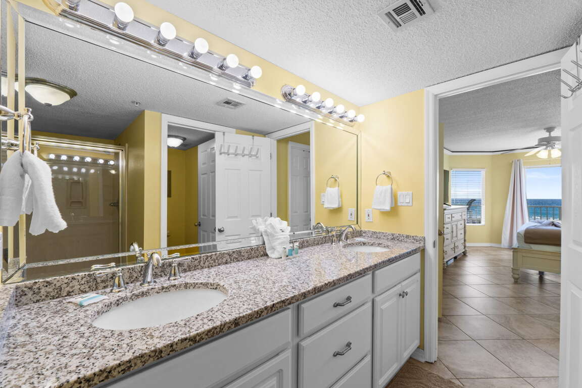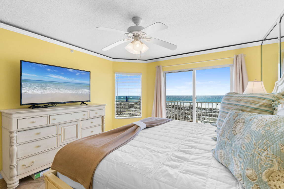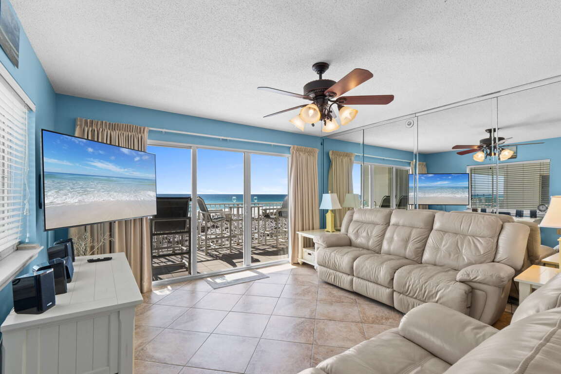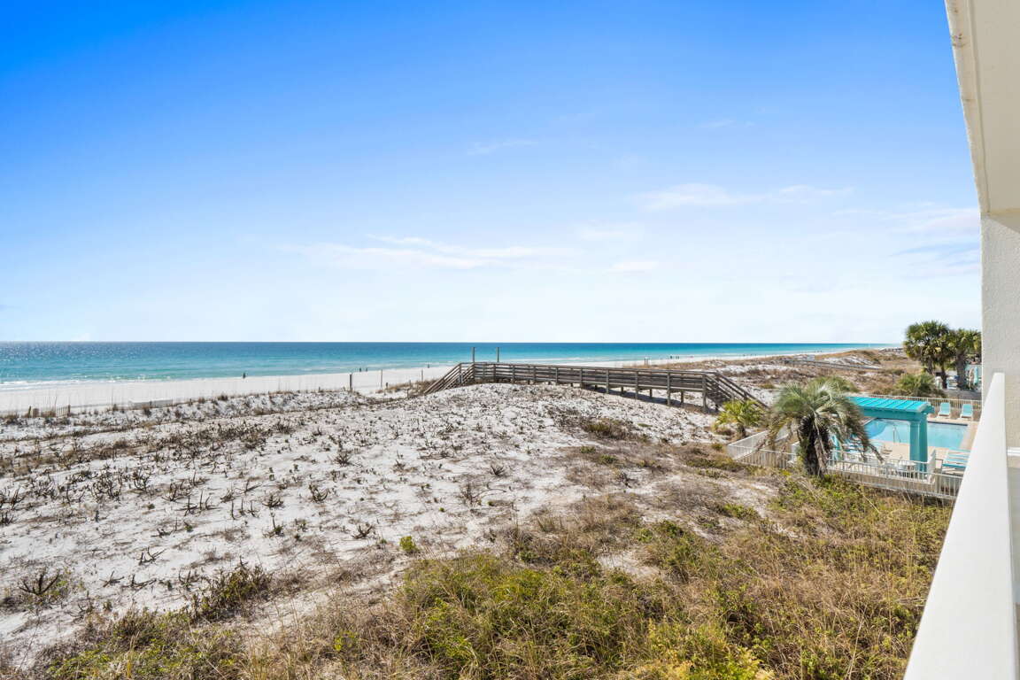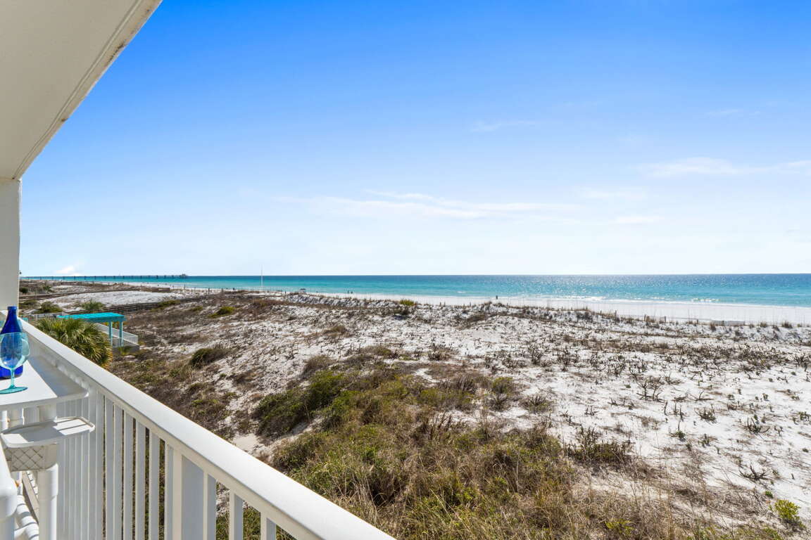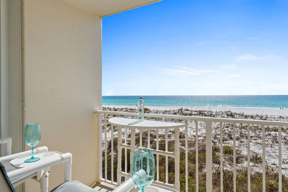 Corner 3-bedroom condo rental in Fort Walton Beach with a private balcony, Gulf views, in-unit laundry, and beach service—an easy place to stay.