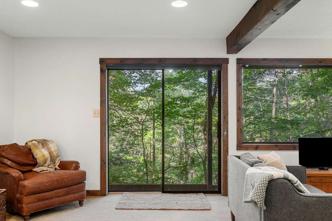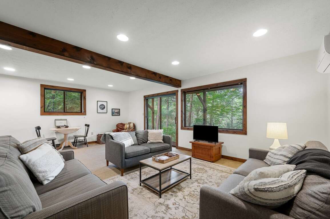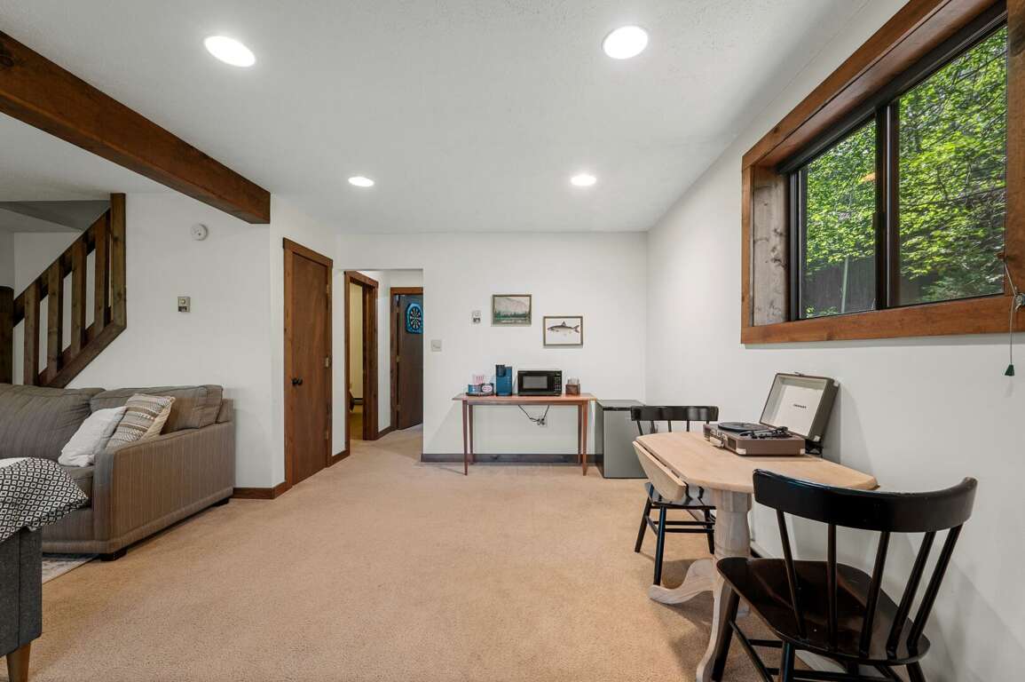 Head down stairs to a large living area with comfy furnishings, more large windows for gazing into the woods, a 50" smart TV, and a game table. For those engrossed in a big game or movie, the mini-fridge and microwave oven mean you won't miss a thing when grabbing a frosty beverage or heating up some snacks. The short hallway off the living area leads to another bedroom with queen bed, a utility room stocked with games and full-size washer & dryer, and another full bathroom. <br />