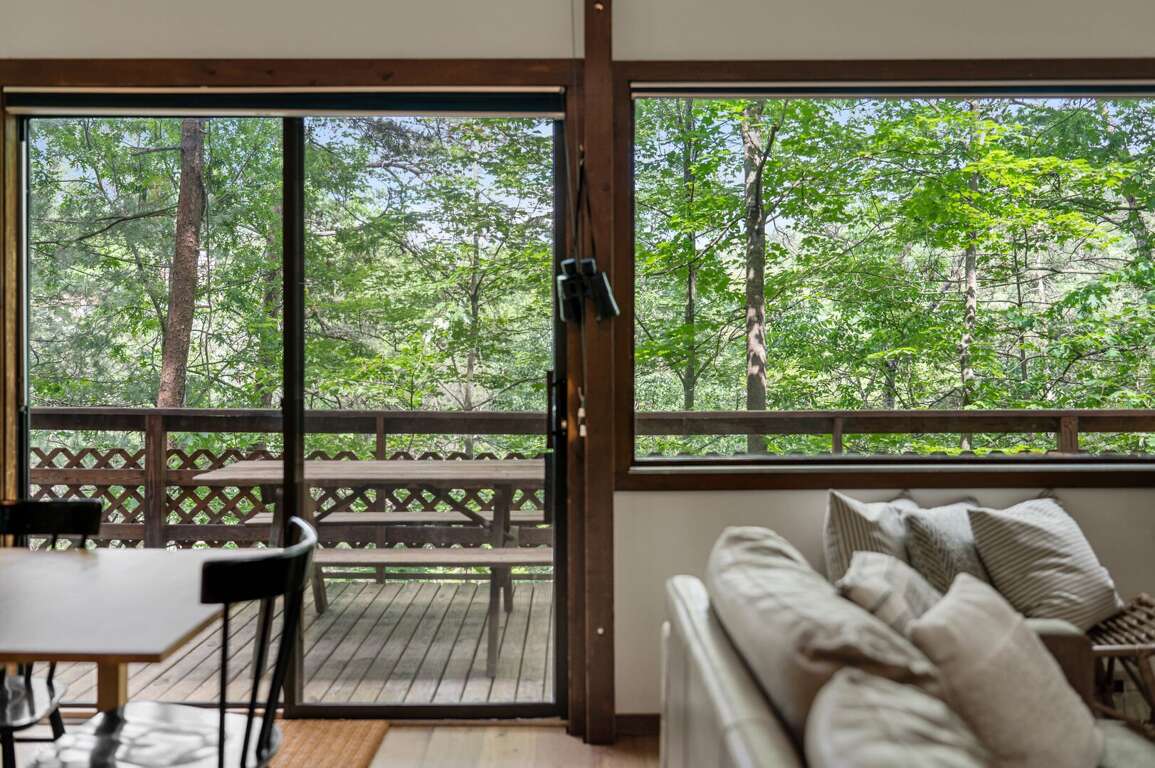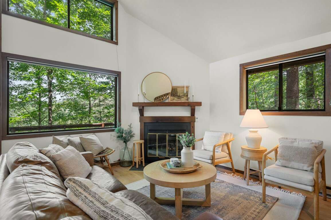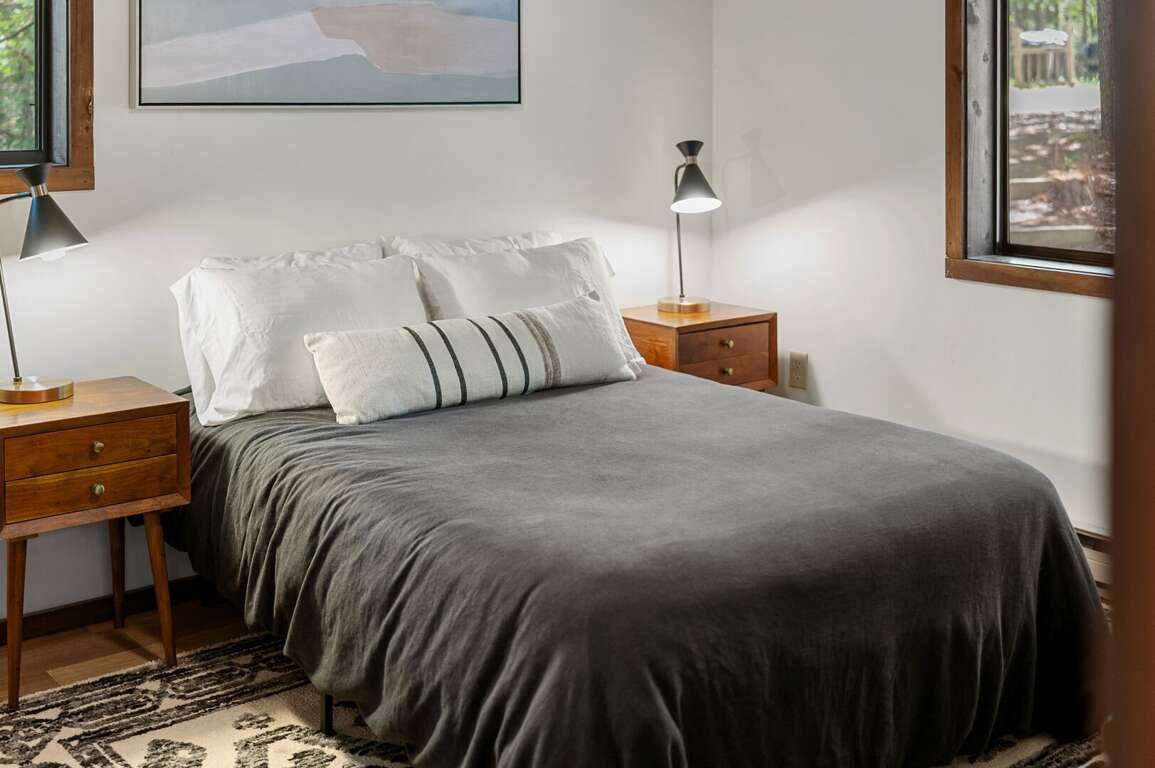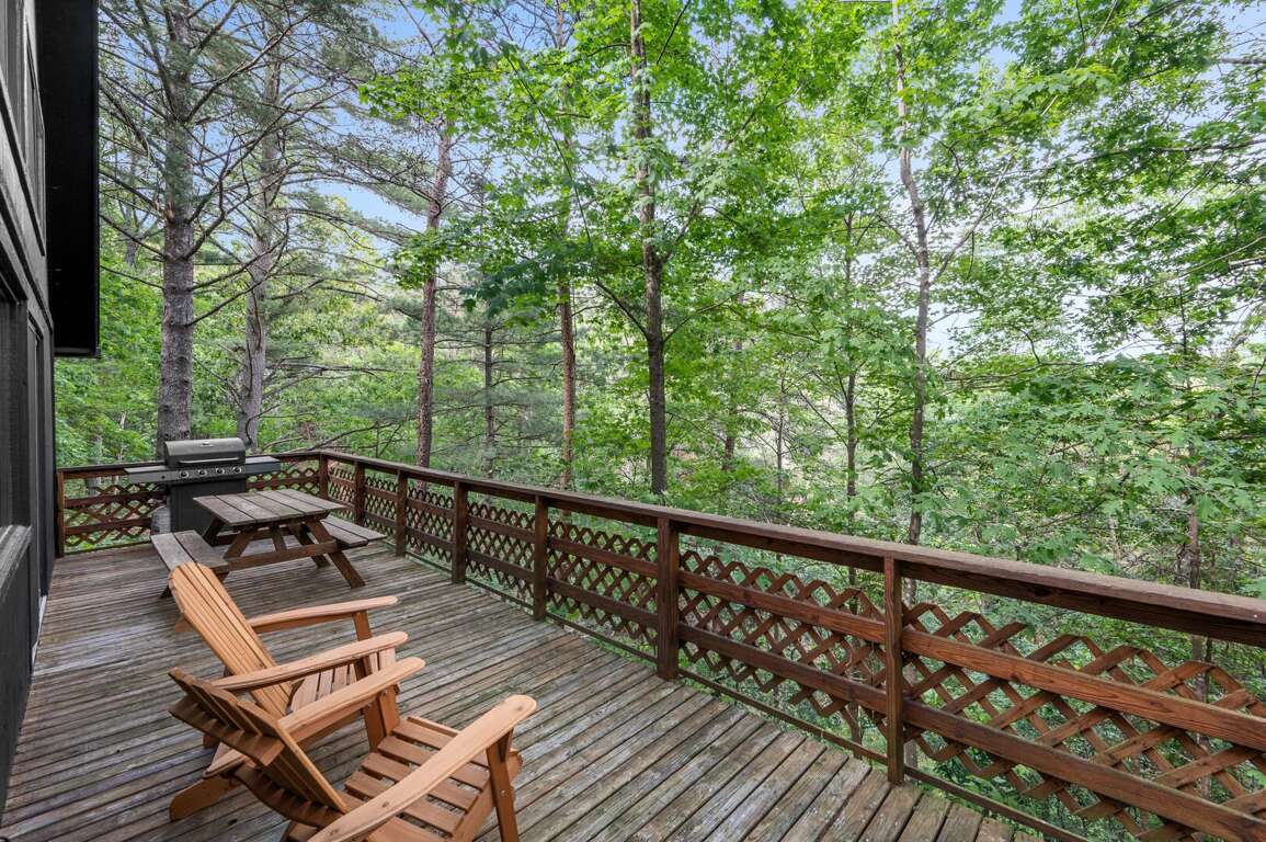 Head down stairs to a large living area with comfy furnishings, more large windows for gazing into the woods, a 50" smart TV, and a game table. For those engrossed in a big game or movie, the mini-fridge and microwave oven mean you won't miss a thing when grabbing a frosty beverage or heating up some snacks. The short hallway off the living area leads to another bedroom with queen bed, a utility room stocked with games and full-size washer & dryer, and another full bathroom. <br />