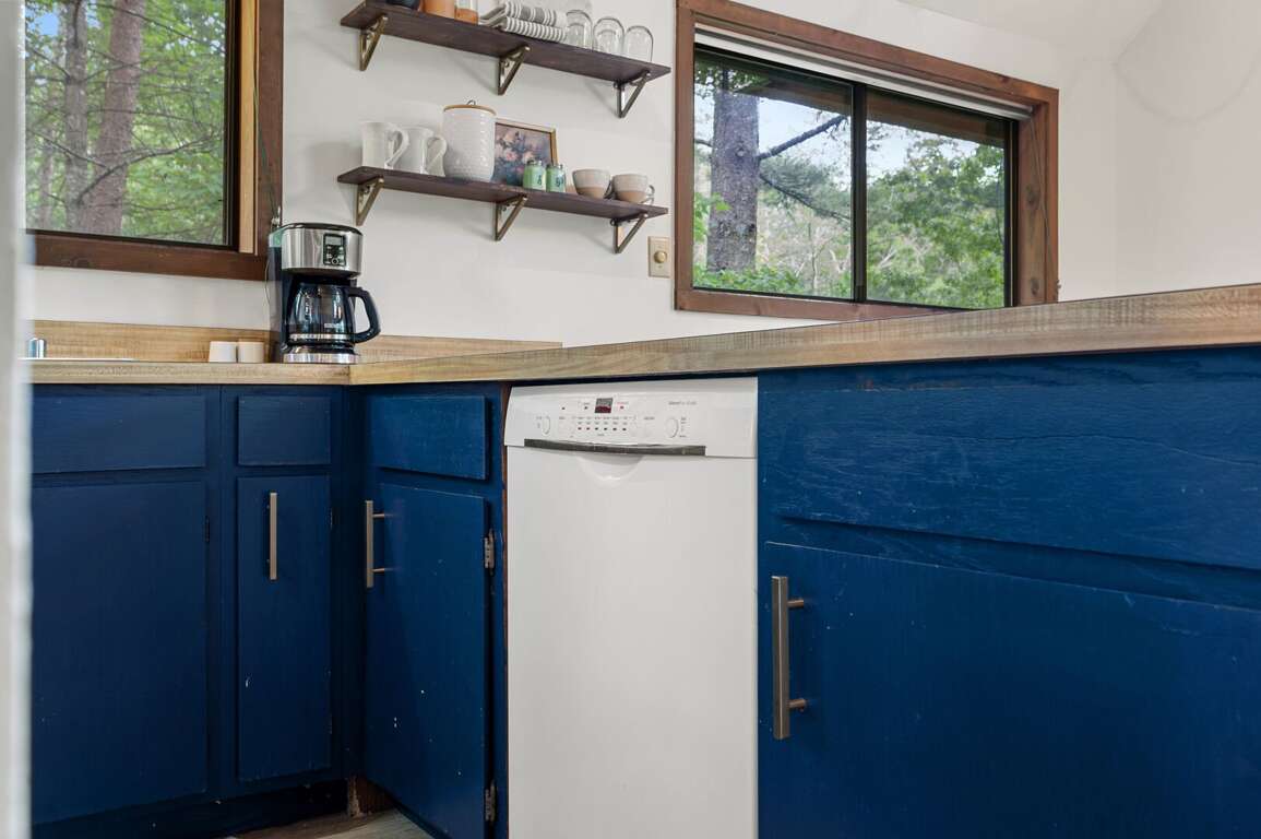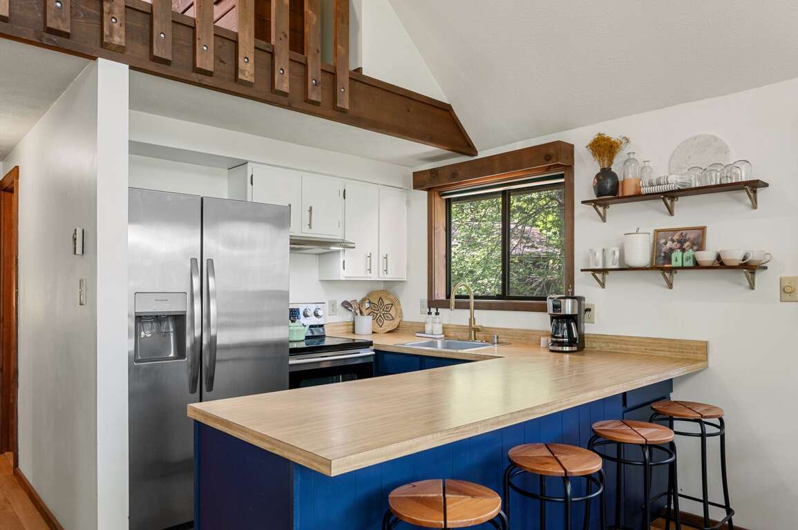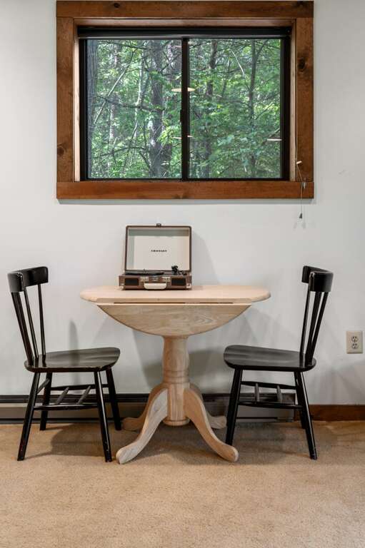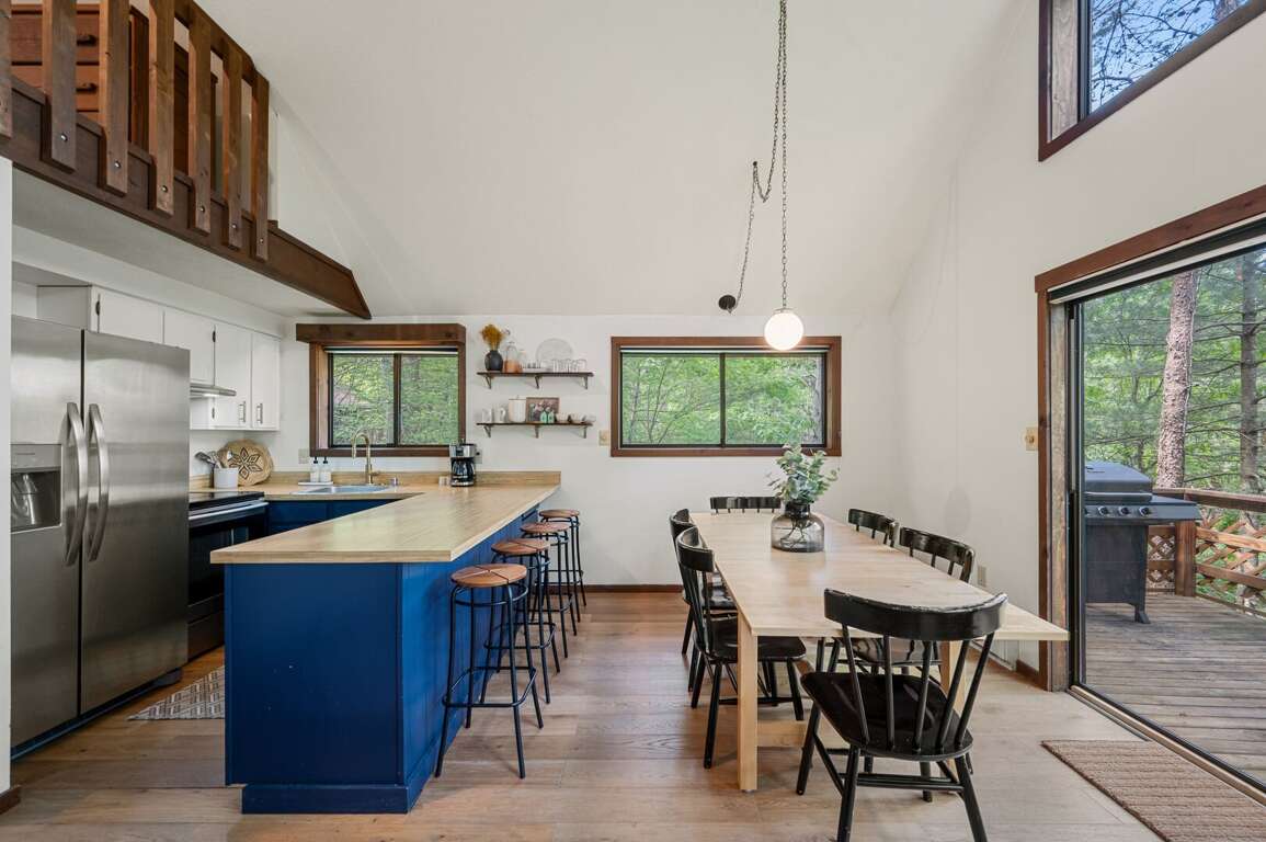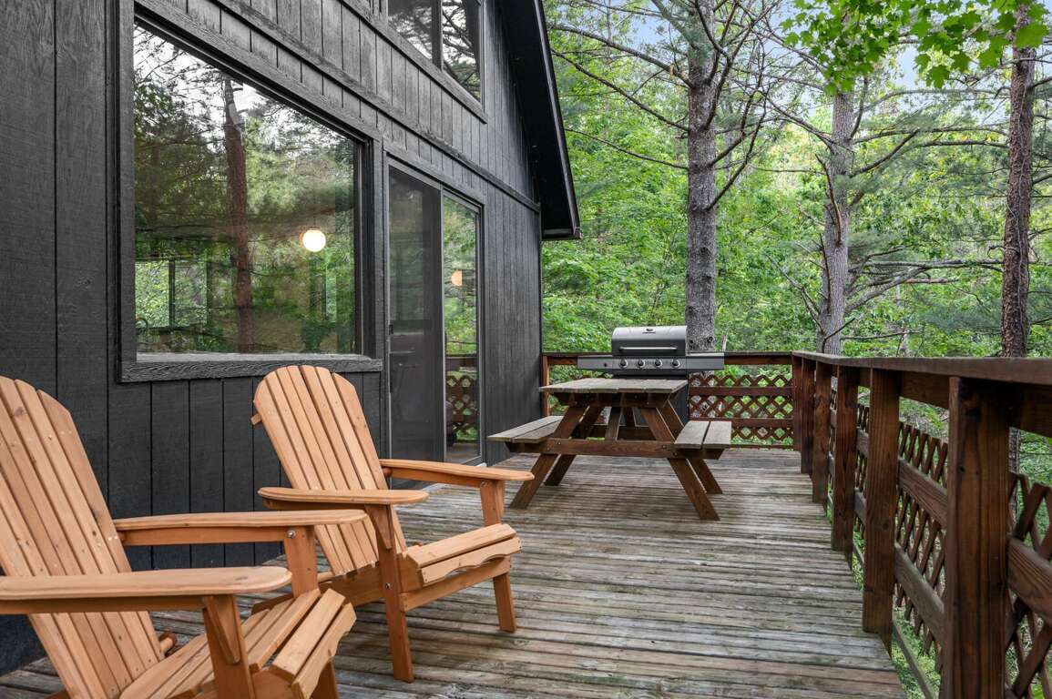 The Chalet's open great room includes a dining area and living room with a gas log fireplace. The patio door opens to a deck in the trees - convenient for fixing dinner on the gas grill and dining at the picnic table. The kitchen, located adjacent to the great room & dining area, includes updated appliances, basic cookware, tableware, a basket-style drip coffee maker (filters provided, but please bring your favorite grind), and a Keurig machine (please bring your favorite K-cups). The dining area seats six at the table and another four at the kitchen bar. The main floor also includes two bedrooms, both with queen beds, and hallway full bathroom. The second bedroom has a desk, lamp, and chair -- just in case work interrupts your getaway. <br />