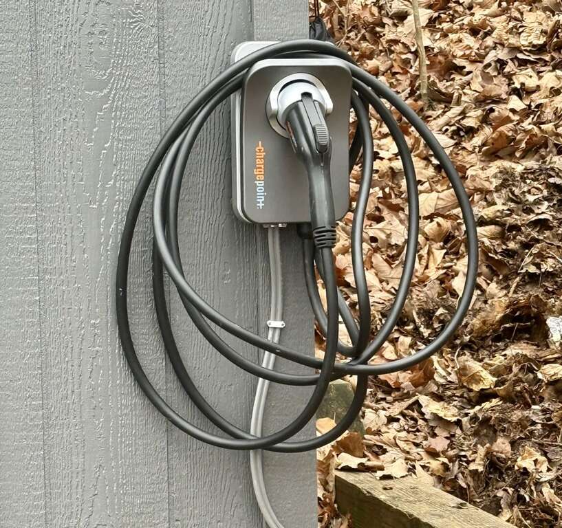 An EV Charger is available for guest use. It's mounted on the shed, with easy access from the driveway.<br />