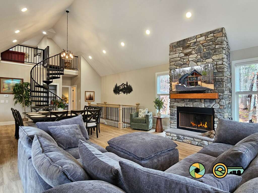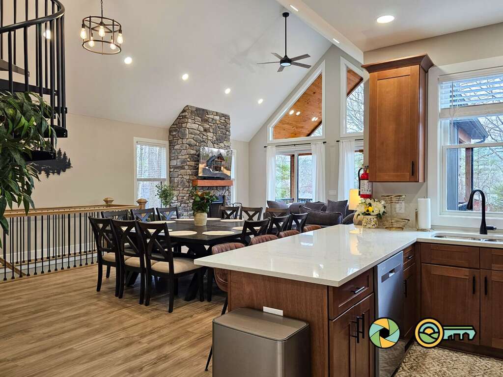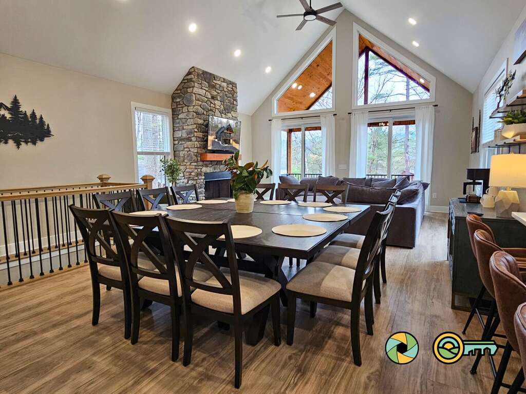 Upon entry on the main level, the foyer opens to a great room with huge vaulted ceilings, a west-facing wall of glass doors and windows, and a large covered deck with comfy seating. The living area includes a huge sectional sofa facing the stone wood-burning fireplace, and a large Smart TV above the mantle. Watch your favorite TV shows and movies with your preferred streaming providers. The kitchen and dining room are also located in the great room. The kitchen includes basic cookware, tableware, stainless steel appliances, and quartz countertops. Next to the kitchen is a coffee bar with a drip coffee maker (reusable gold filter provided, but please bring your favorite ground coffee). The dining area accommodates 12, with additional seating for four at the kitchen bar. The main floor also has a half bath, plus two bedroom suites (one with queen bed, one with king bed), each with its own full bathroom, wall-mounted Smart TV, and ceiling fan.<br />