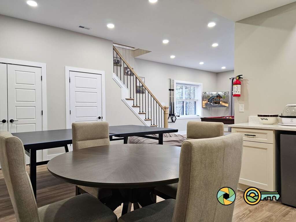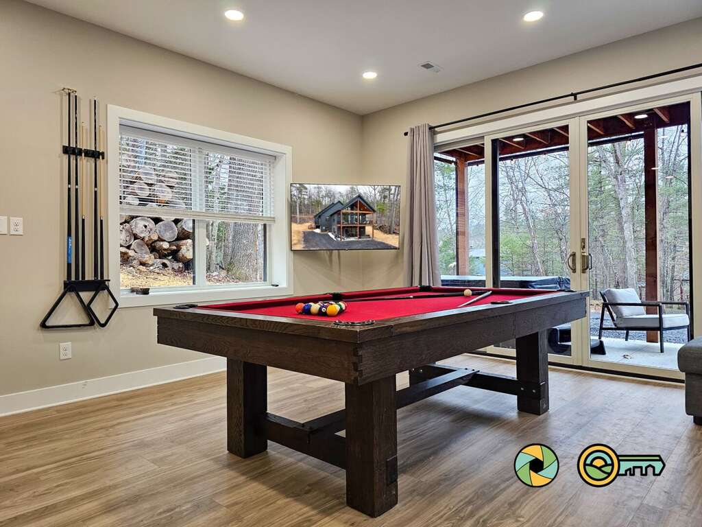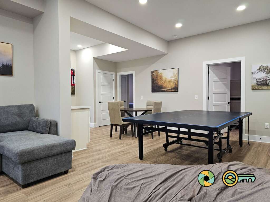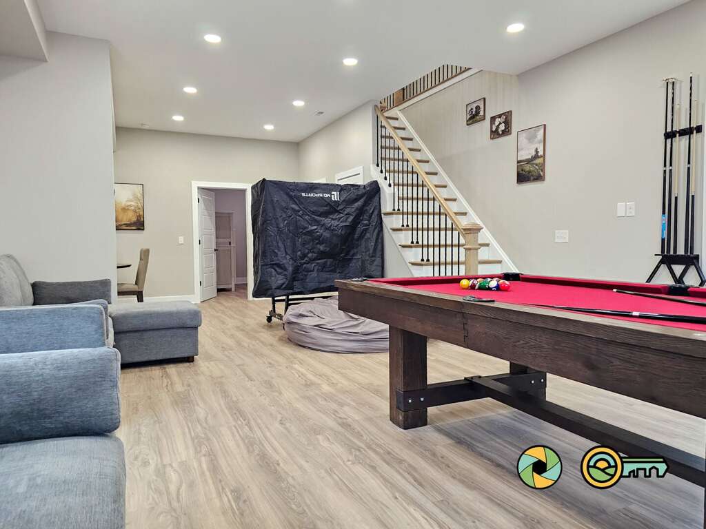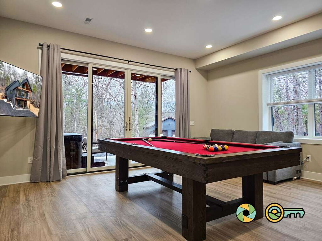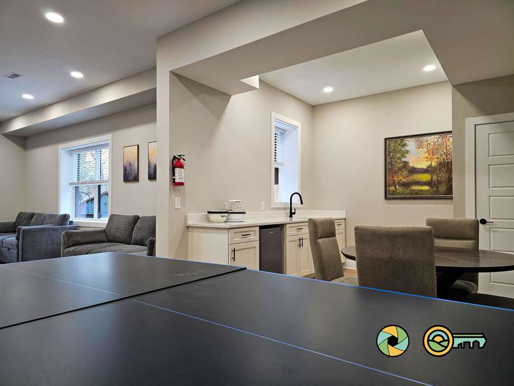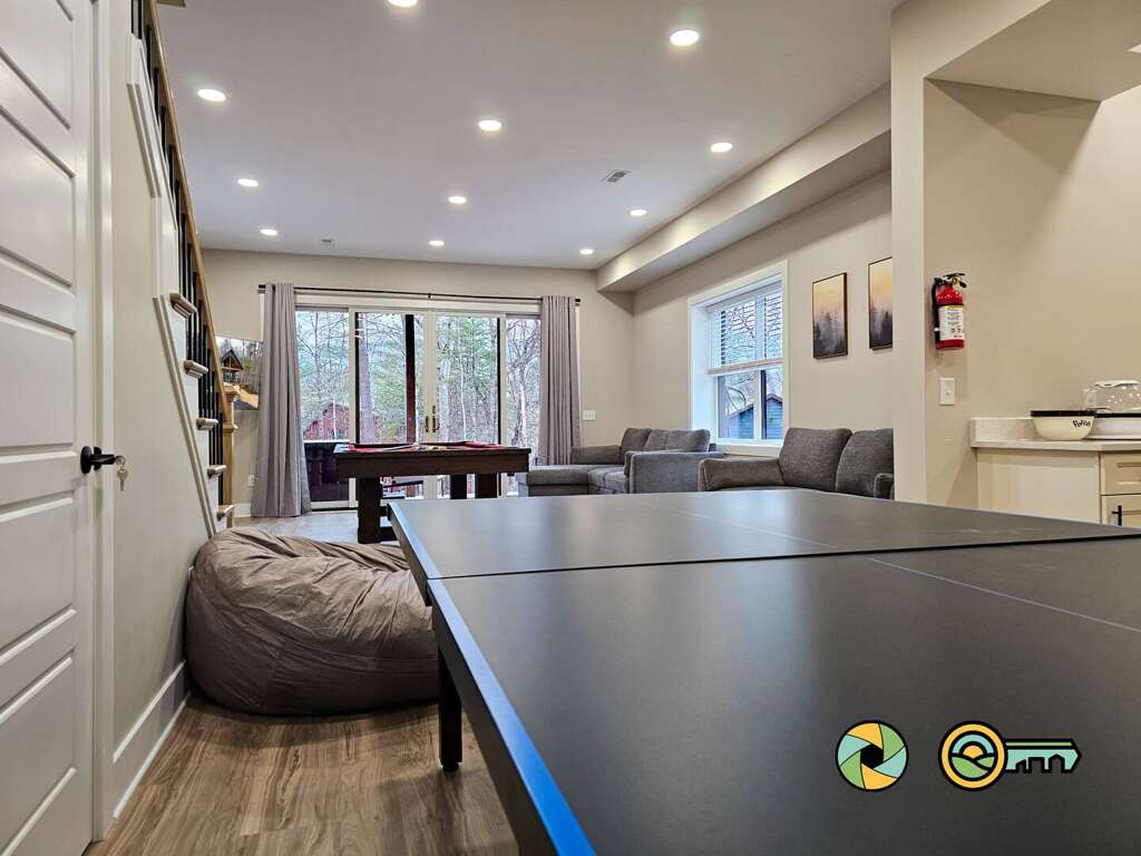 The lower level features a huge recreation room with pool table, full-size ping pong table, large Smart TV, two sofas with built-in ottomans, Big Joe beanbag chair, and generous wet bar with mini-fridge and popcorn maker. A game table for four is perfect for cards, board games, and puzzle building. This epic game room extends out onto the covered lower patio with full size hot tub and additional outdoor seating. Draw down large screens on two sides of the hot tub for extra privacy and to block wind. A full size washer and dryer are available in the laundry closet at the back of the game room, along with two more bedroom suites (one with queen bed, the other with two twin bunk beds), each also with its own full bathroom, wall-mounted Smart TV, and ceiling fan.<br />