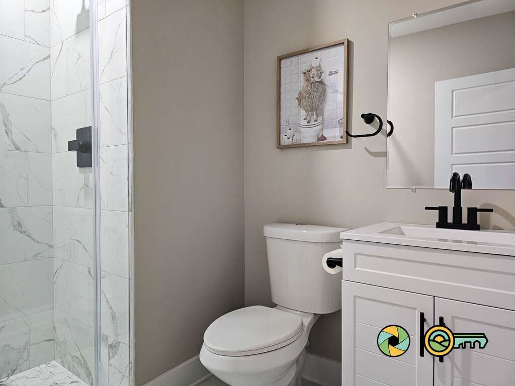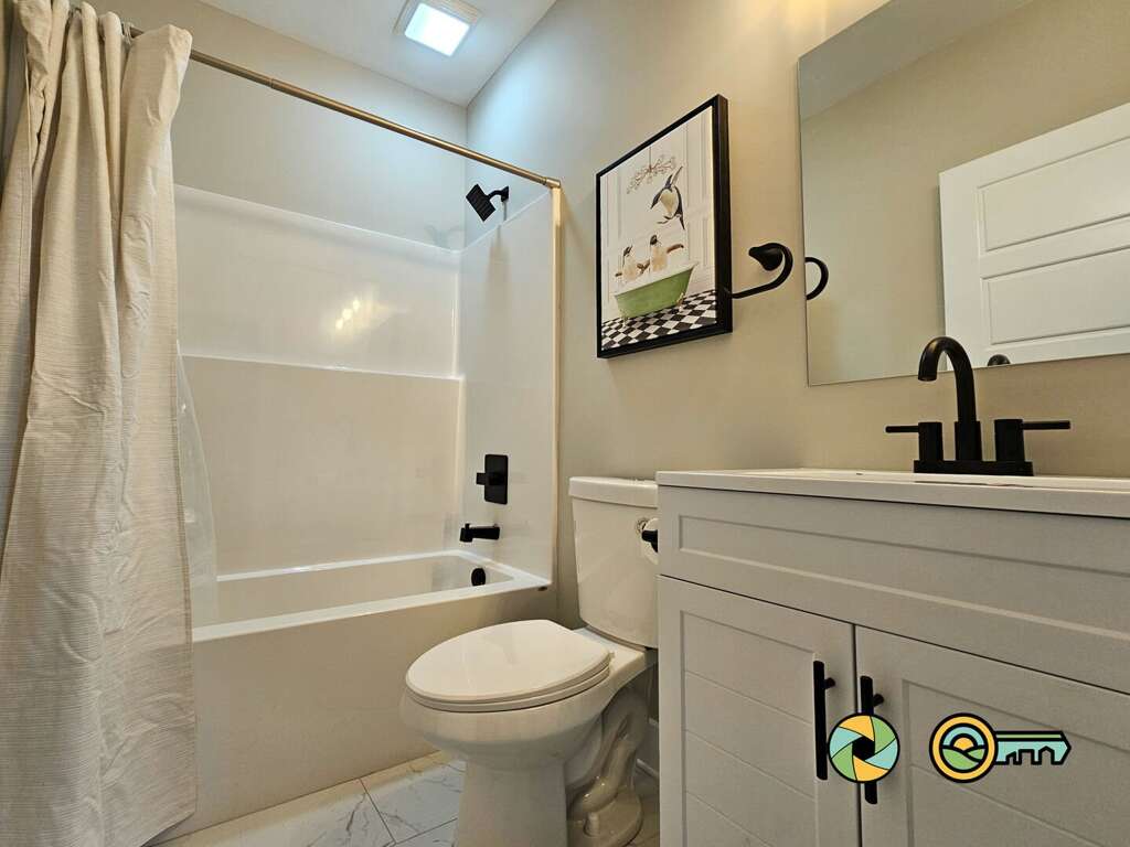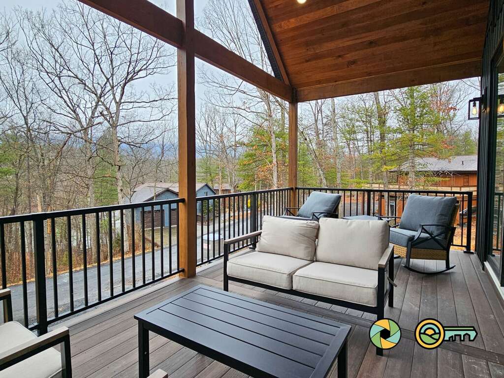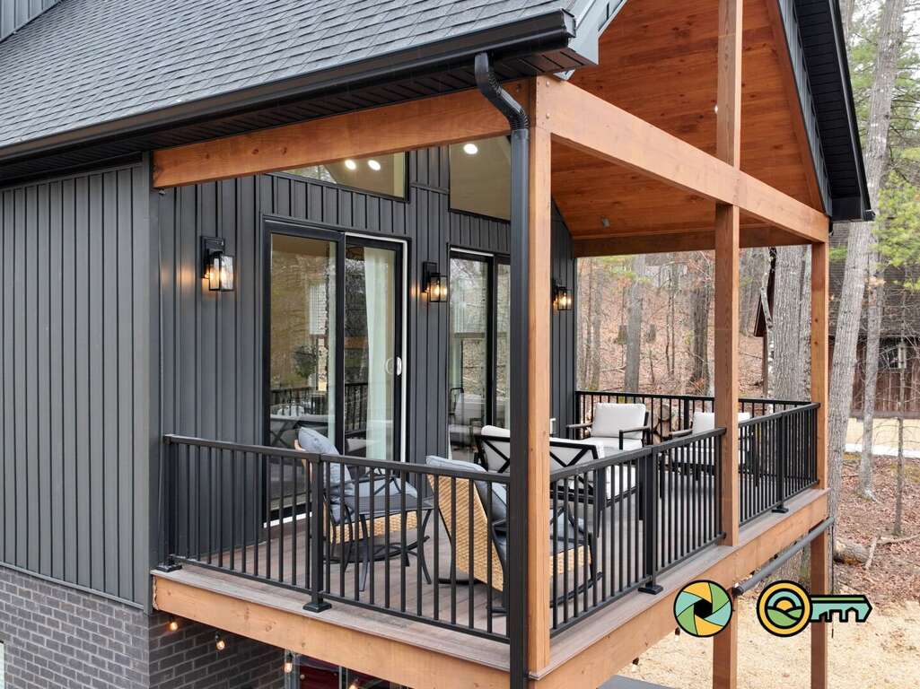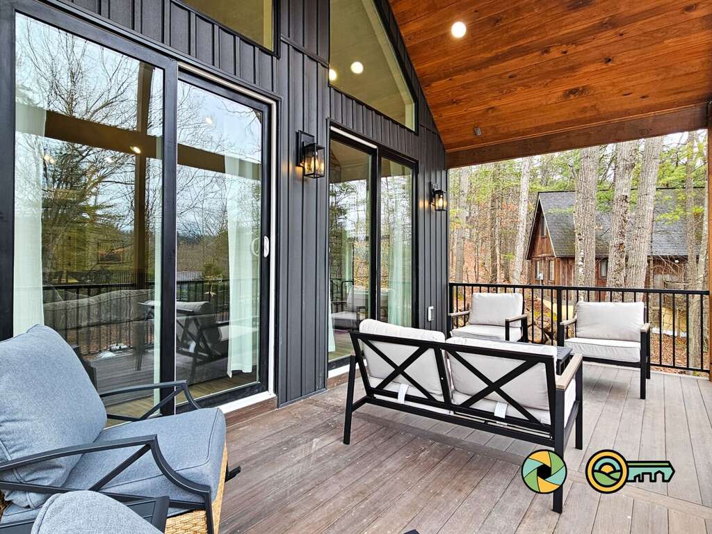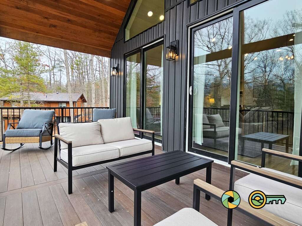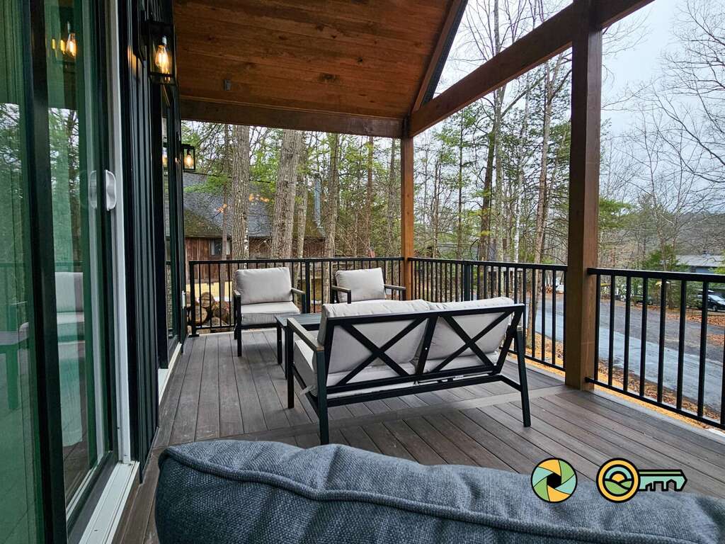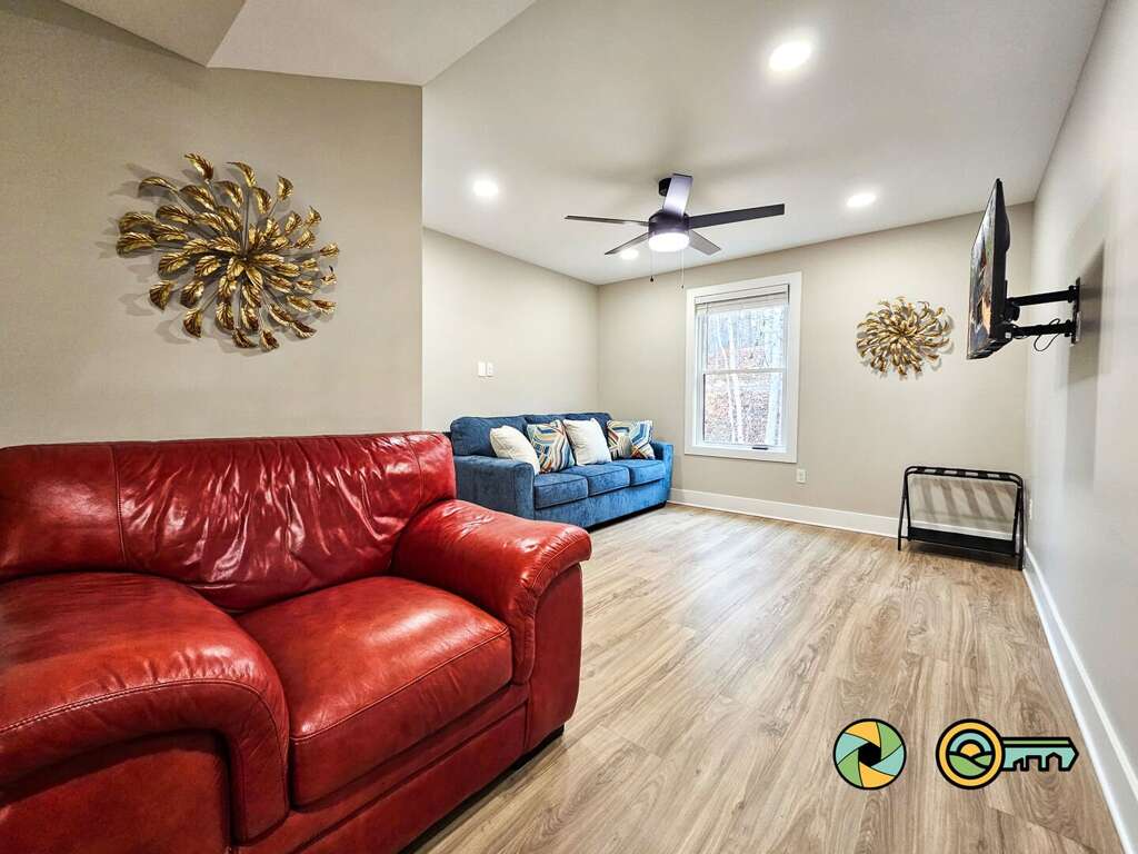 The lower level features a huge recreation room with pool table, full-size ping pong table, large Smart TV, two sofas with built-in ottomans, Big Joe beanbag chair, and generous wet bar with mini-fridge and popcorn maker. A game table for four is perfect for cards, board games, and puzzle building. This epic game room extends out onto the covered lower patio with full size hot tub and additional outdoor seating. Draw down large screens on two sides of the hot tub for extra privacy and to block wind. A full size washer and dryer are available in the laundry closet at the back of the game room, along with two more bedroom suites (one with queen bed, the other with two twin bunk beds), each also with its own full bathroom, wall-mounted Smart TV, and ceiling fan.<br />