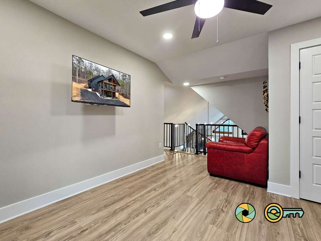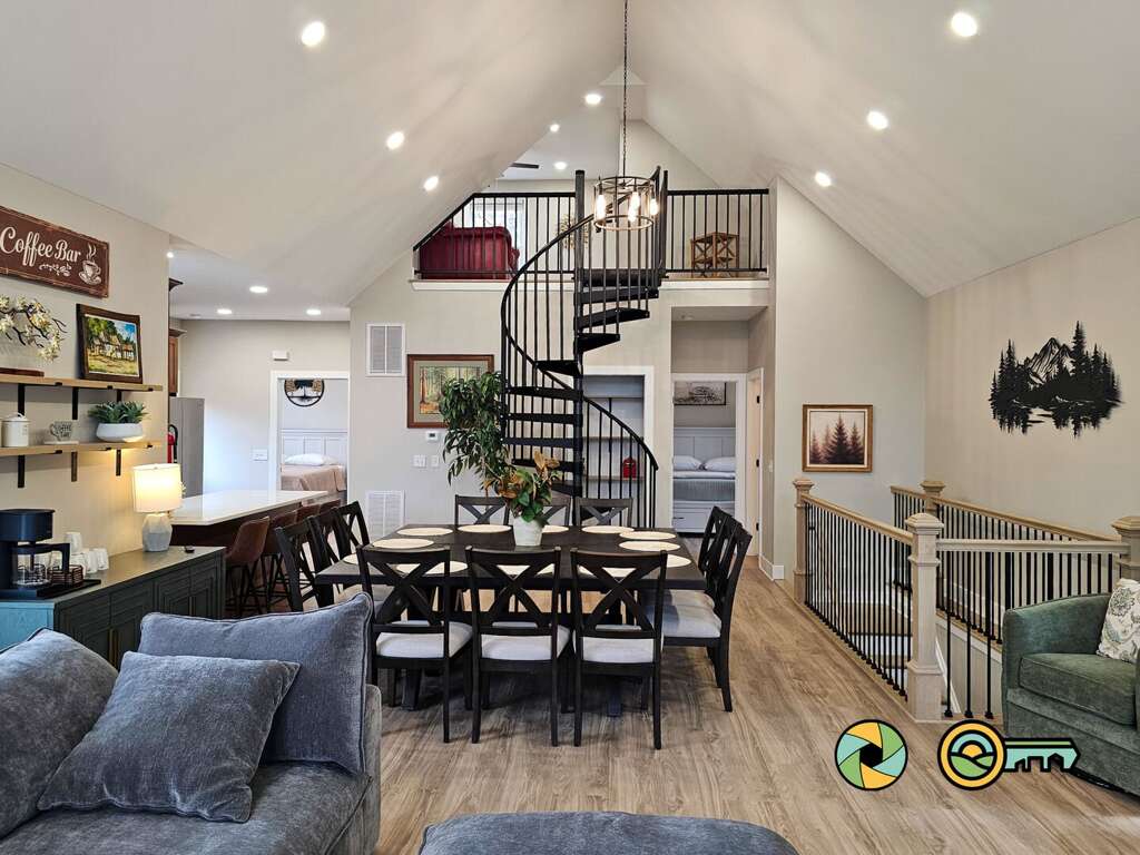 Ascend the spiral staircase to the loft, where you'll find a sofa, oversized chair and Smart TV -- a perfect nook for relaxing, reading a book, watching a movie, or playing video games. The sofa converts to a queen size bed.<br />