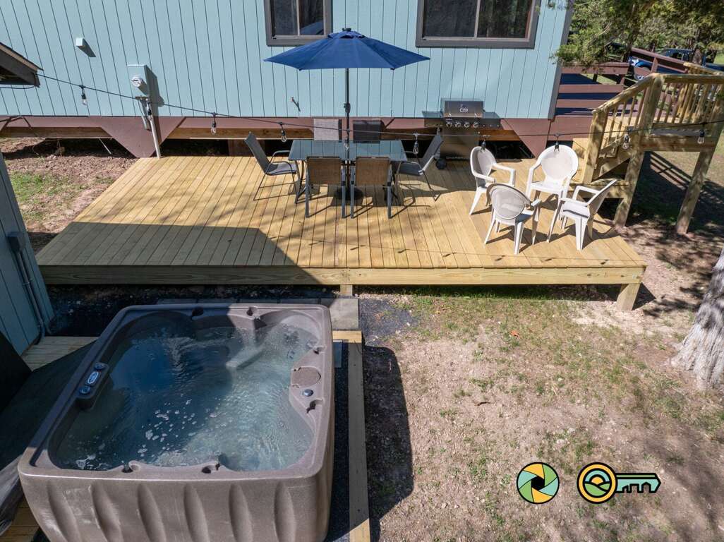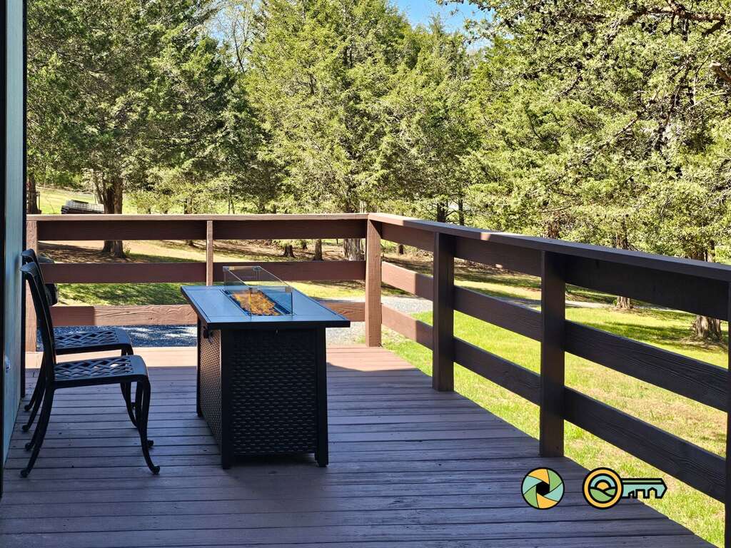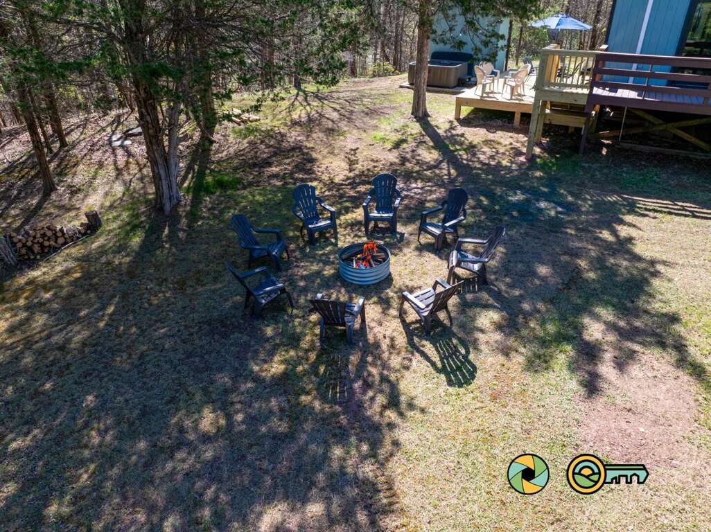 This property has a propane gas grill and hot tub on the side deck, a large fire pit accessible from the side deck, and a propane fire pit/table on the main level deck.<br />
