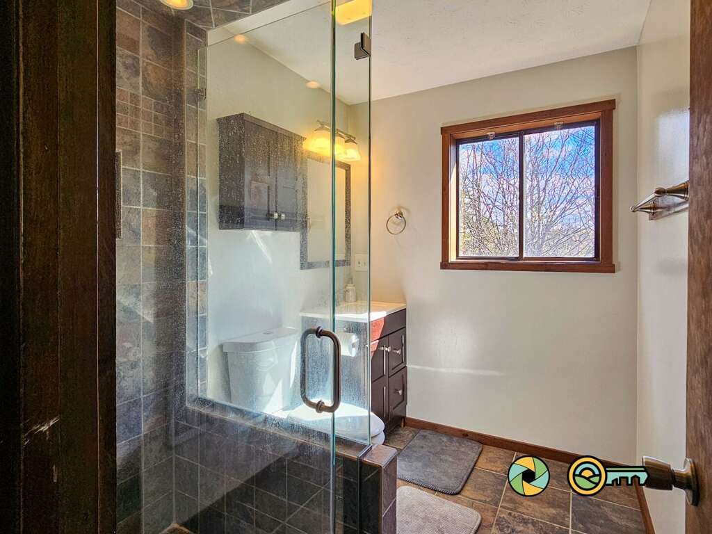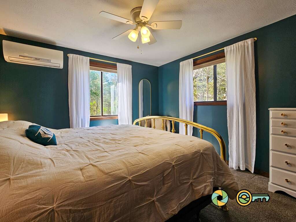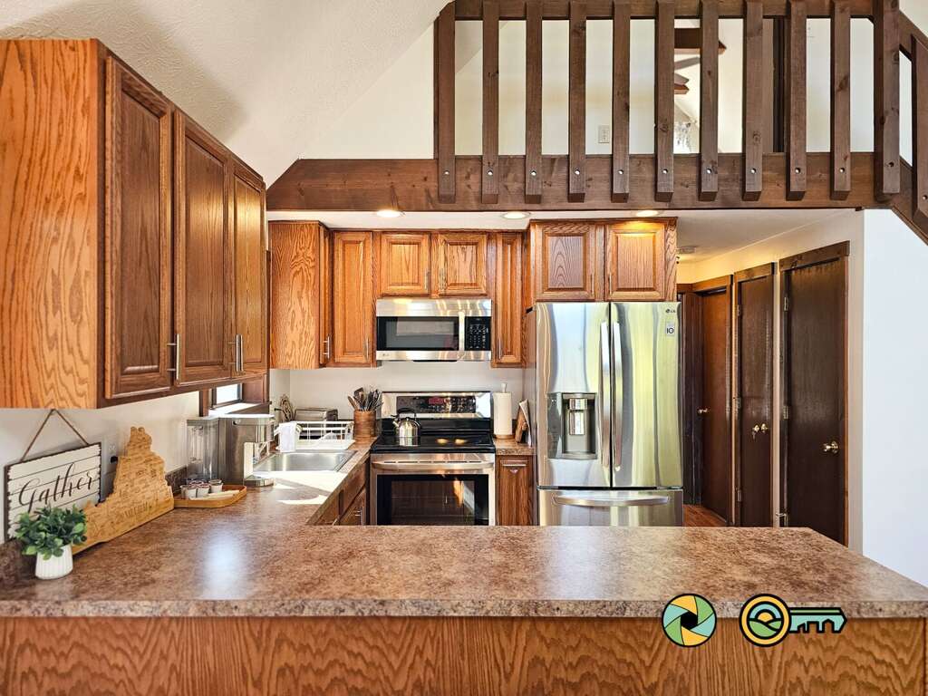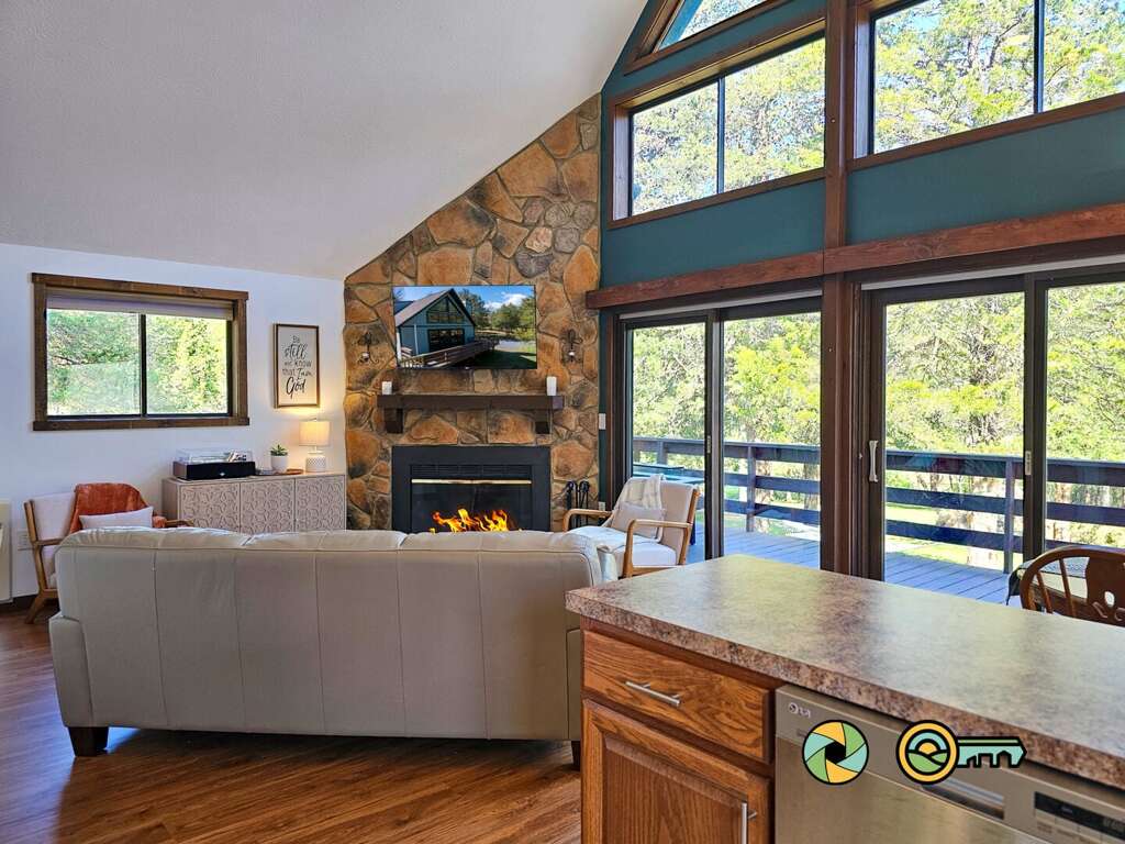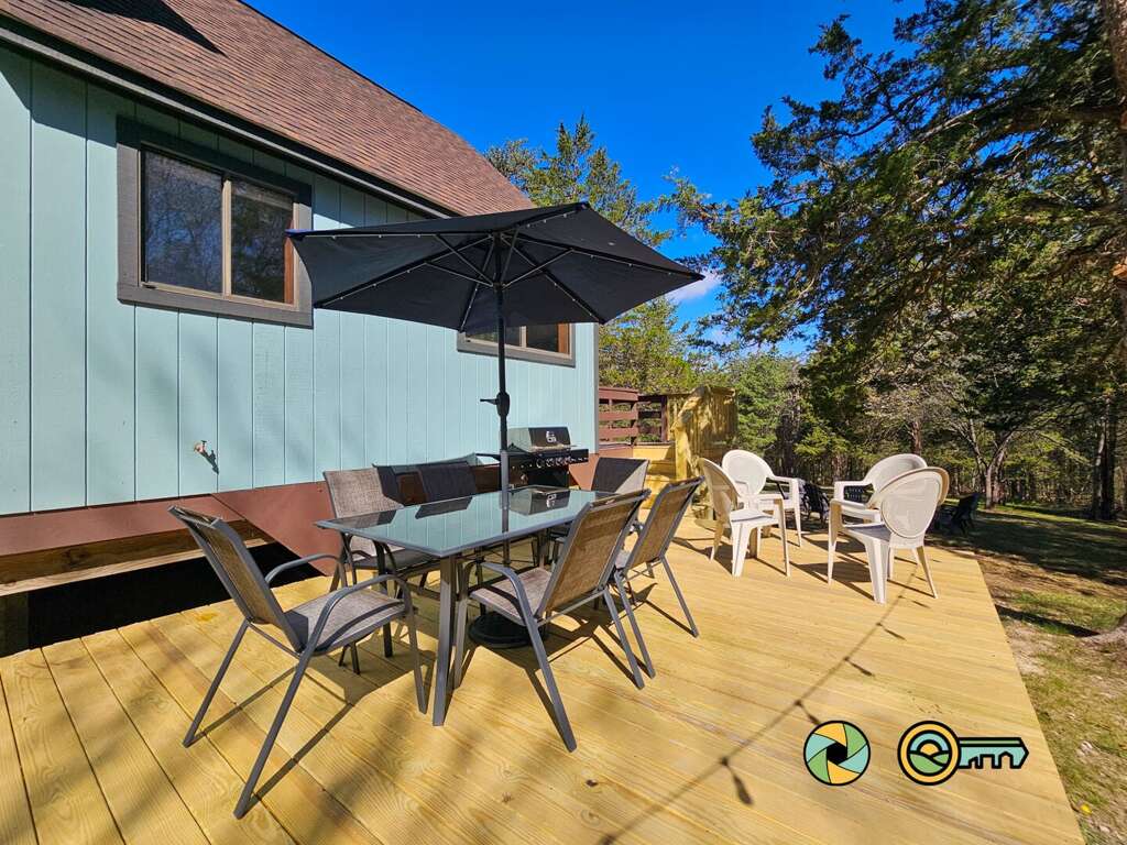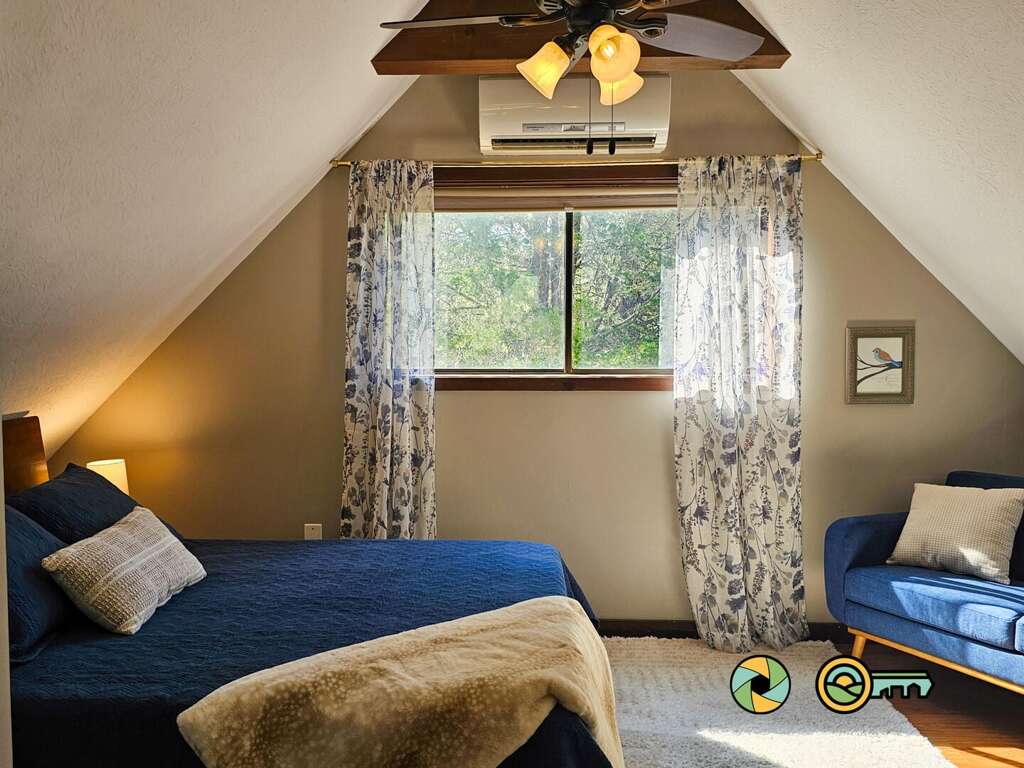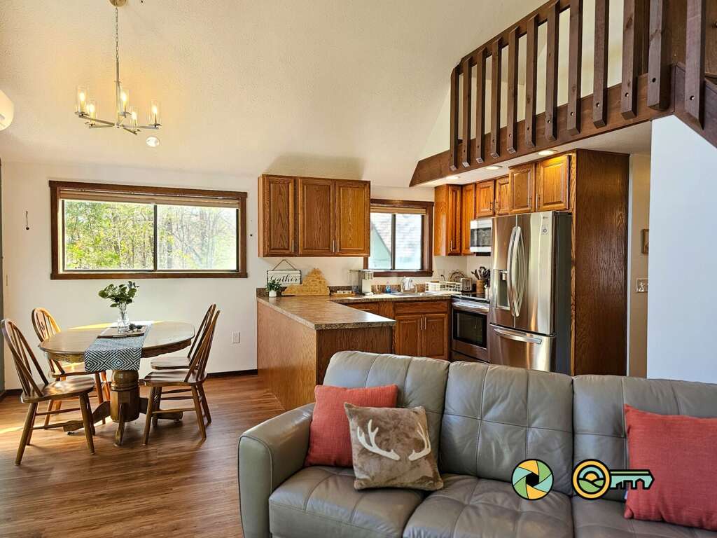 The open, spacious great room includes a dining area and living room with a stone wood-burning fireplace and above-mantle Smart TV. Two large patio doors open to the spacious deck with fire table and chairs overlooking the front lawn and cedar trees. The side deck is for fixing dinner on the gas grill, dining outdoors, and relaxing in the hot tub. The kitchen is adjacent to the great room and dining area and includes updated appliances, basic cookware, tableware, and a Kurig coffee maker (basic K-cups provided, but please bring your own favorites). The dining area seats six. The main floor includes two bedrooms, one with a trundle bed (two twins) and the other with a king bed, and renovated full bathroom. The spacious loft looks out through the great room's huge windows, has one queen bed, and an en suite renovated full bathroom. A full-size stacked washer & dryer unit is in the main floor trundle bedroom. Sleeps six comfortably.<br />