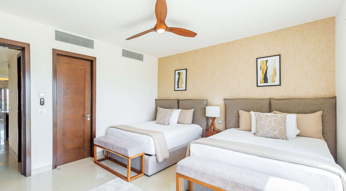 The master suite boasts a plush king-size bed, while the second bedroom is thoughtfully equipped with 2 Queen beds.