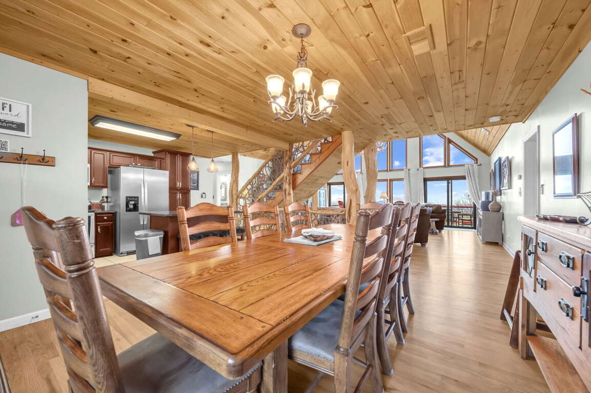 The updated kitchen in the dream vacation house in Seven Devils, NC boasts granite counters, stainless appliances, and ample space for serving a large crowd. Here are some features that make the kitchen and dining area of this house truly exceptional: