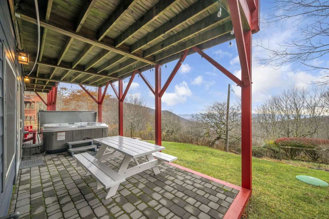 Lower Patio: For ultimate relaxation, guests can soak in the hot tub, gather around the picnic table, or cozy up by the wood-burning fire pit. It's the perfect spot to unwind after a day of outdoor activities.