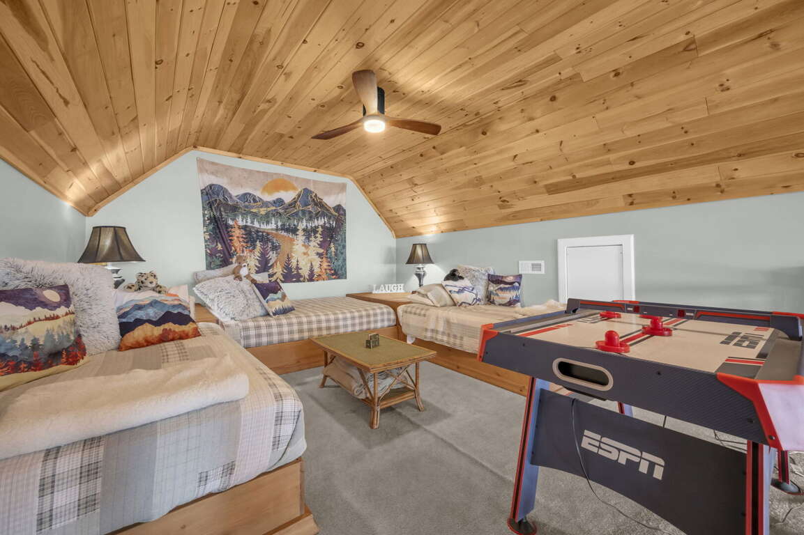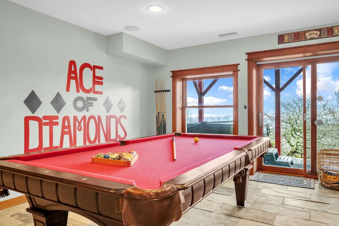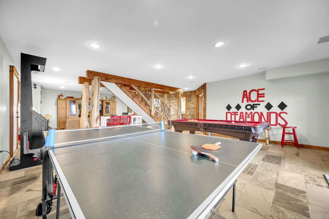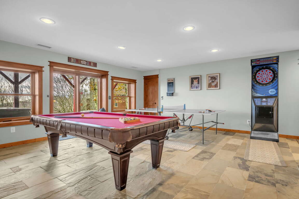 Lower Level Entertainment Area: Guests can enjoy a friendly game of pool on the 8-foot slate pool table, challenge each other in ping pong or air hockey, or test their aim with electronic darts. The sliding glass doors open up to a lower patio, allowing for easy access to outdoor activities.