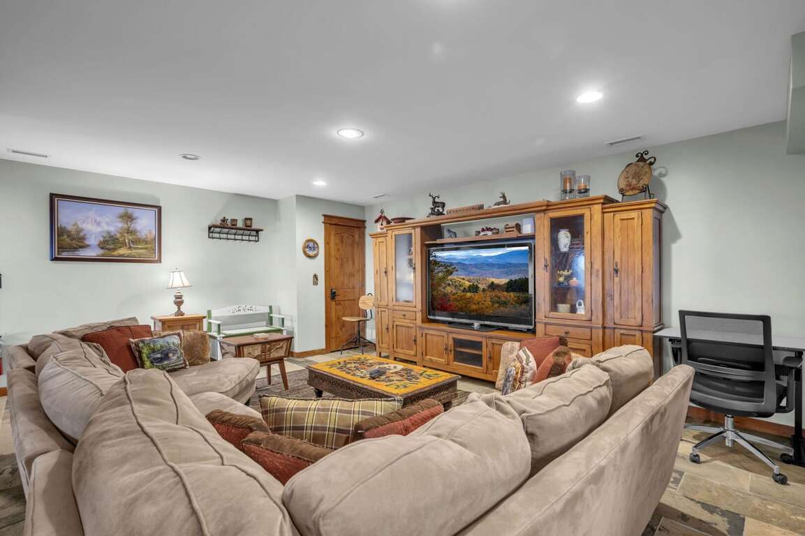 Living Room: The spacious living room features a large HD Smart TV and comfortable furniture, perfect for cozy movie nights or catching up on favorite shows. And with the beautiful long-range view of the mountains, guests can relax and unwind in style.
