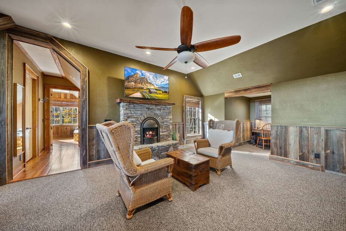 Featuring a spacious living area with leather sofas and a cozy gas log fireplace, the main floor of the Renaissance Lodge offers a comfortable and inviting space for relaxation and gathering with friends and family. Here are the main floor features that make this lodge a perfect vacation destination: