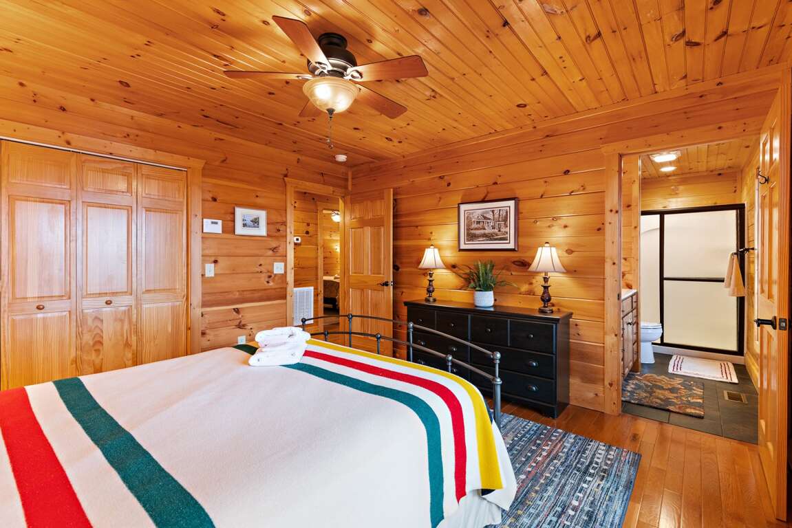 The Perfect View Cabin in Boone, North Carolina offers a rustic and inviting interior that exudes warmth and charm. Step inside this cozy cabin and immediately feel at home with its wood floors and vaulted ceilings. The great room features a comfortable leather sofa and a TV, perfect for relaxing after a day of exploring. The kitchen and dining area are connected to the great room, allowing for easy meal preparation and entertaining. Outside, you can enjoy the panoramic views of the Appalachian Mountains from the covered deck, complete with a porch swing and deck chair. The cabin also has a covered rear deck with a grill, perfect for cooking up a delicious meal. The master bedroom features a queen-sized mattress and an en suite bathroom for added convenience. The large loft upstairs offers four twin beds, an office desk, a TV, and bean bag chairs, providing additional sleeping and lounging space. With its rustic charm and homey atmosphere, the Perfect View Cabin is the ideal retreat for your Boone getaway.