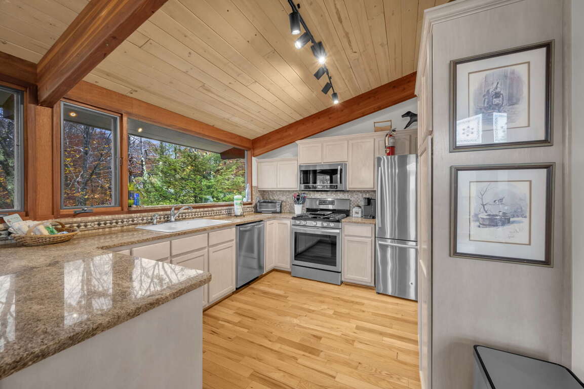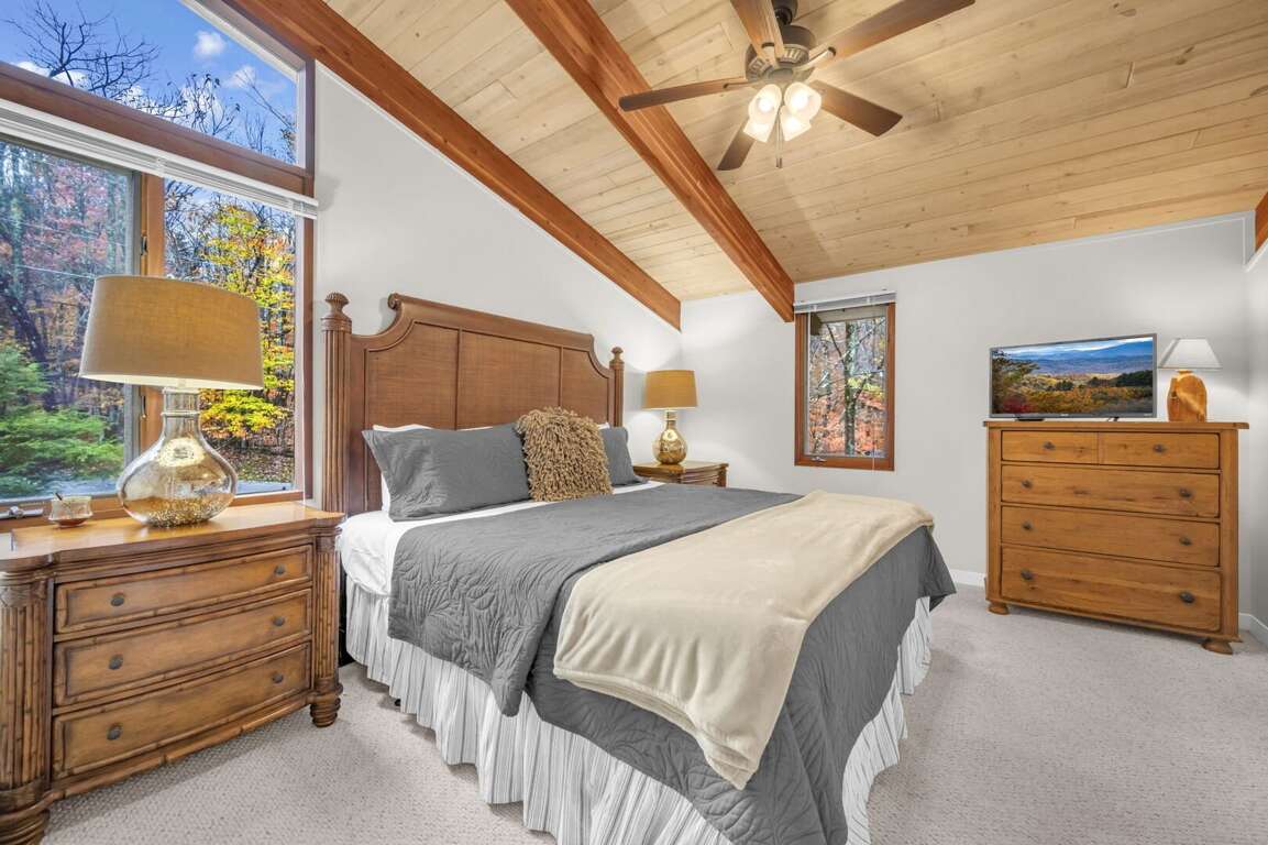 The interior of the vacation home on Pine Ridge Road in Beech Mountain, NC, boasts stunning features that combine rustic charm with modern comfort. The vaulted ceilings create a sense of spaciousness, while the open layout allows for seamless flow between rooms. Here are three notable interior features of the property: