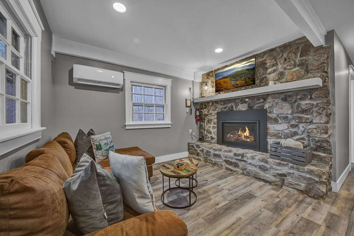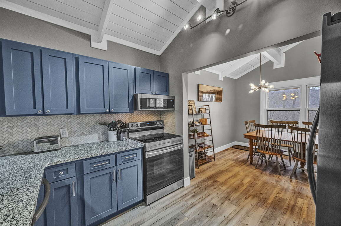 Continuing our exploration of Bluebeary Bungalow, let's now turn our attention to its interior features, where you'll find a warm and inviting mountain retreat that combines rustic charm with modern comforts. The kitchen design of this vacation home is truly impressive, boasting granite countertops and stainless-steel appliances that elevate both the functionality and aesthetic appeal of the space. Whether you're a seasoned chef or just enjoy cooking for your loved ones, this well-equipped kitchen will meet all your needs. Moving on to the living room decor, you'll be greeted by comfortable furniture and a gas fireplace made of stacked stones, creating a cozy atmosphere perfect for relaxing after a day of outdoor activities. The attention to detail in both the kitchen and living room showcases the thoughtfulness and care put into designing this Bluebeary Bungalow.