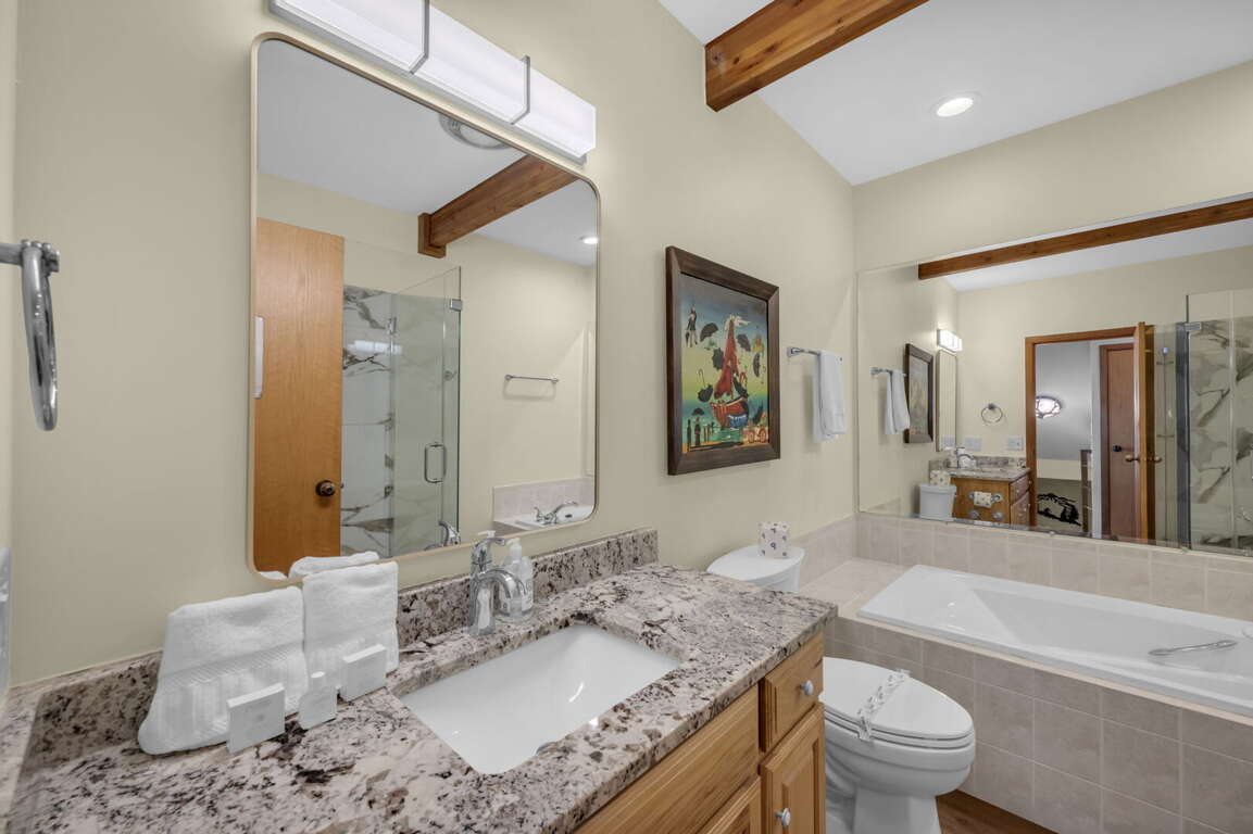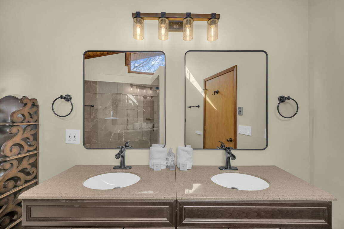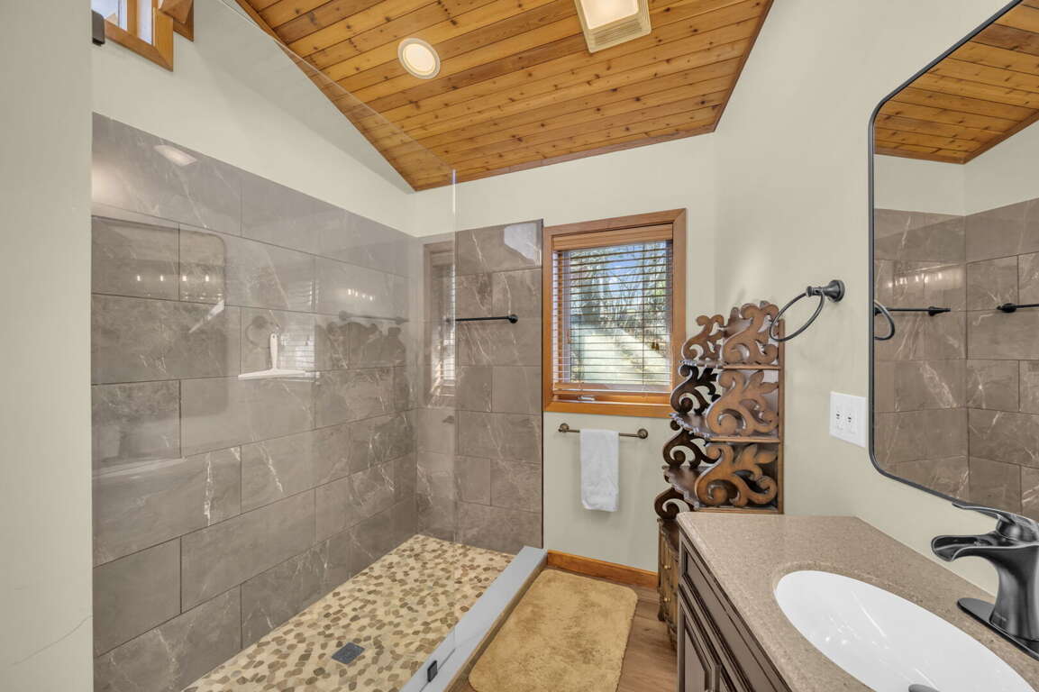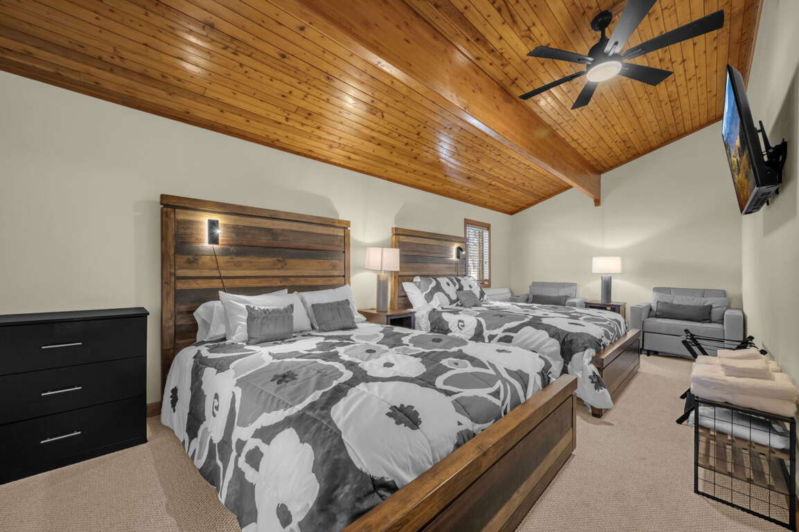 There are six comfortable bedrooms. The main-level master bedroom features a king bed, a twin sleeper chair, a gas fireplace, a TV, and an ensuite bathroom with a huge stone shower and dual vanities. The second king bedroom on the main level has an ensuite bathroom, and the third king bedroom is also on the main level. There is a spacious hallway bathroom with a step-in shower and a jetted tub. Upstairs, the queen bedroom has two queen beds, two sleeper chairs, and the twin bedroom has two twin beds. They share a hallway bathroom with a step-in shower and jetted tub. There is another king bedroom with a full bathroom on the lower level, and there are two sleeper chairs in the game room–extra sleeping spots for the children.