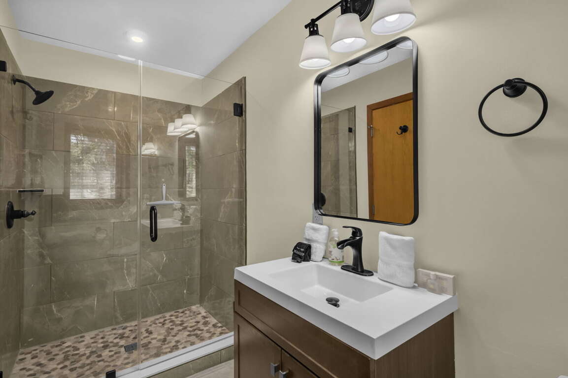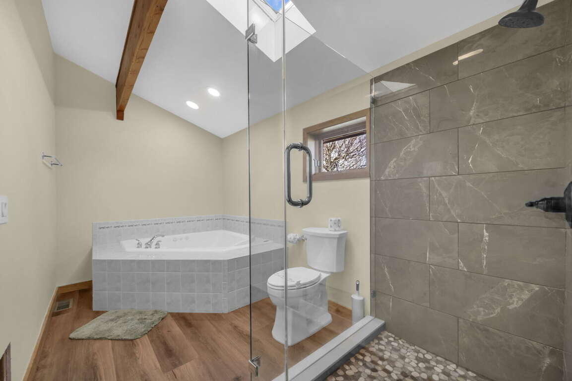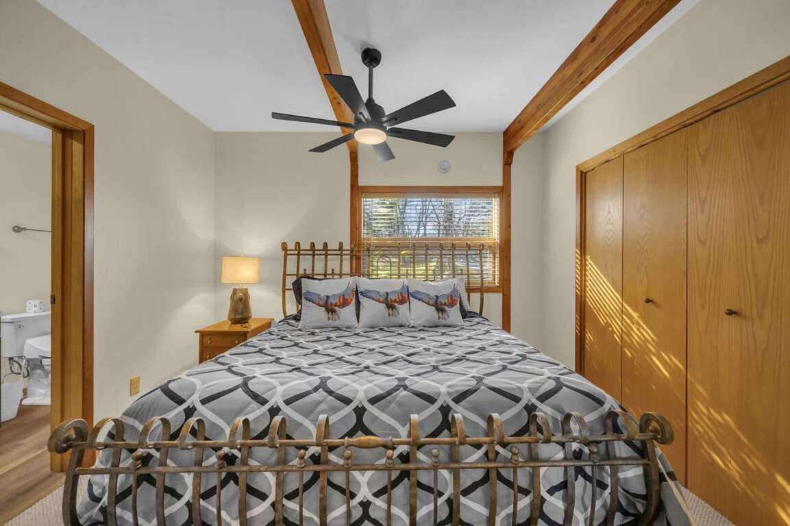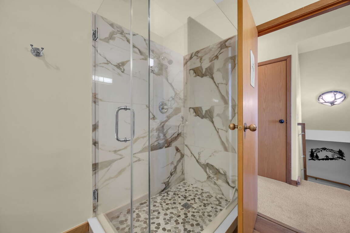 There are six comfortable bedrooms. The main-level master bedroom features a king bed, a twin sleeper chair, a gas fireplace, a TV, and an ensuite bathroom with a huge stone shower and dual vanities. The second king bedroom on the main level has an ensuite bathroom, and the third king bedroom is also on the main level. There is a spacious hallway bathroom with a step-in shower and a jetted tub. Upstairs, the queen bedroom has two queen beds, two sleeper chairs, and the twin bedroom has two twin beds. They share a hallway bathroom with a step-in shower and jetted tub. There is another king bedroom with a full bathroom on the lower level, and there are two sleeper chairs in the game room–extra sleeping spots for the children.