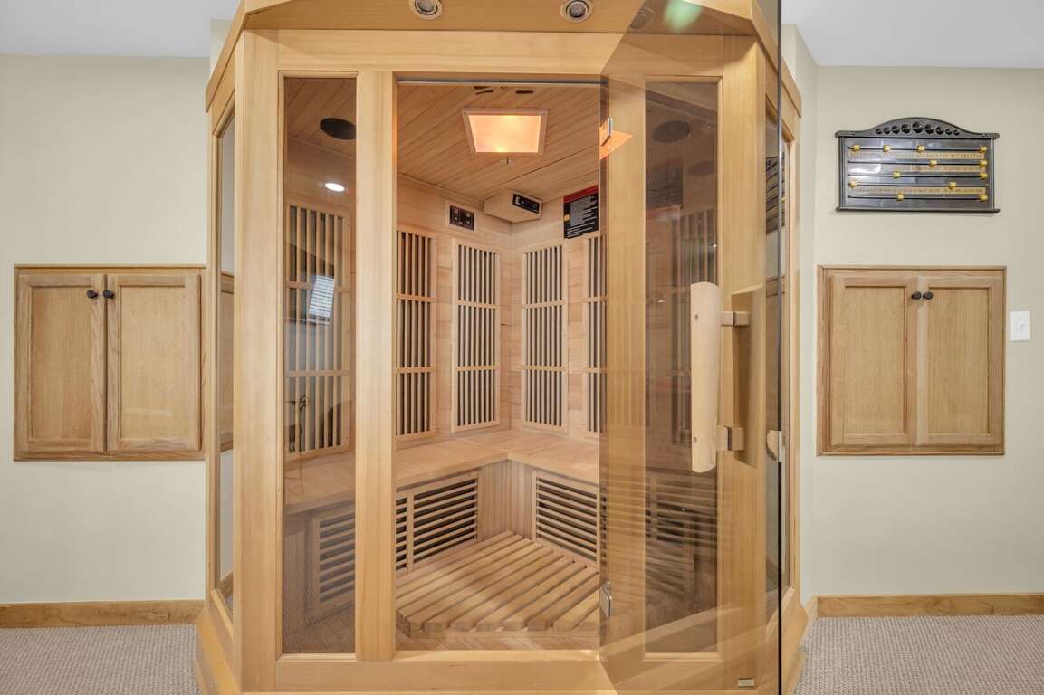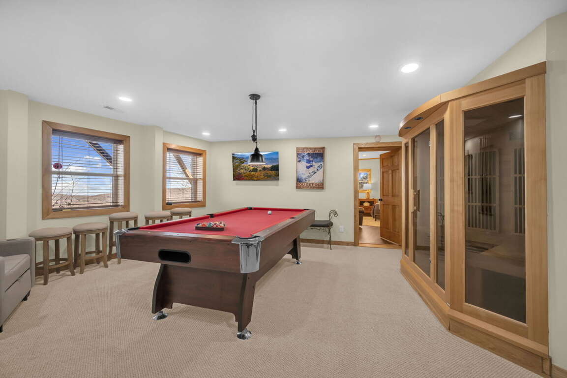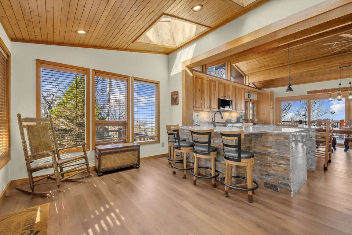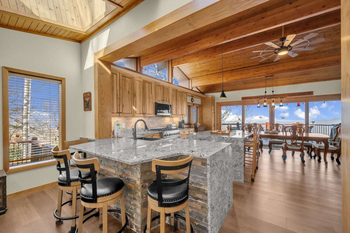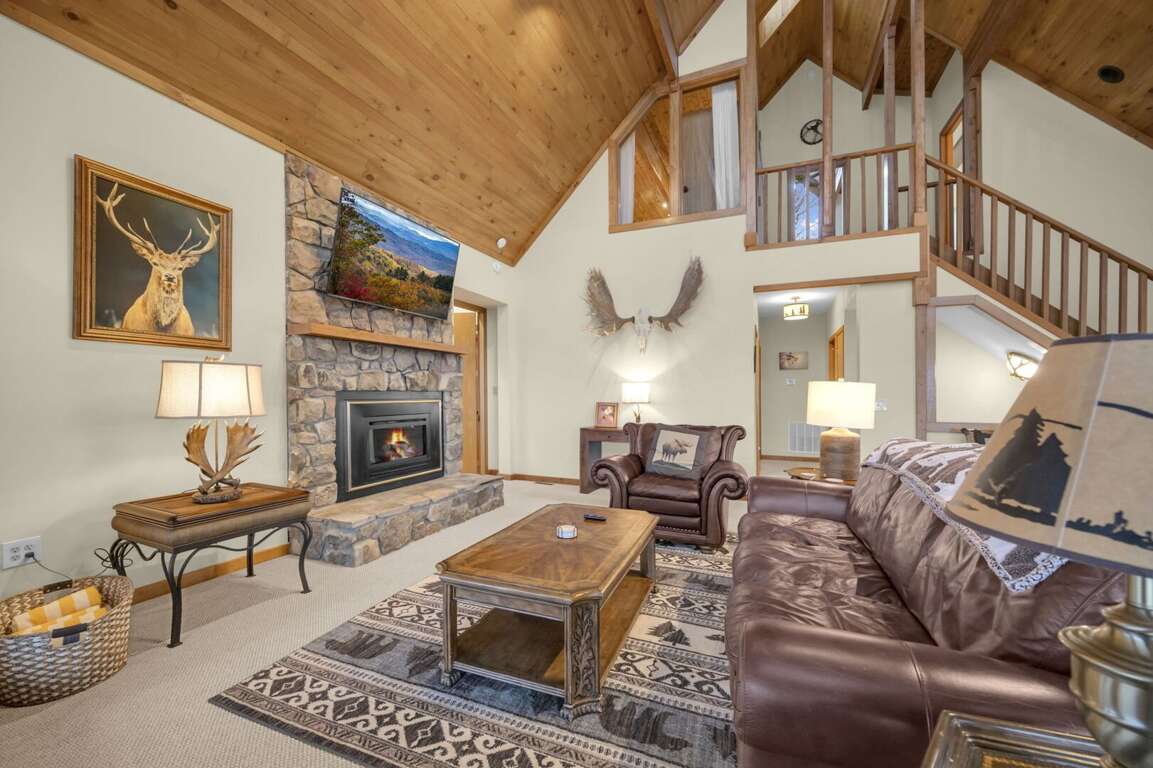 Soaring Eagles View comfortably accommodates 18 guests and offers plenty of space to enjoy. A wall of windows offers views from the main floor living room, kitchen, and dining area, and a large covered deck overlooks the Blue Ridge Mountains. Step into luxury at Soaring Eagles View. The living room features leather sofas around the stacked-stone gas fireplace and TV. Guests will enjoy gathering for games at the card table or entertaining in the gourmet kitchen, which offers plenty of seating. The deck features outdoor dining, a gas grill, a gas fire table, and a hot tub with panoramic mountain views. The lower-level game room features a large dry sauna, a pool table, and a TV.