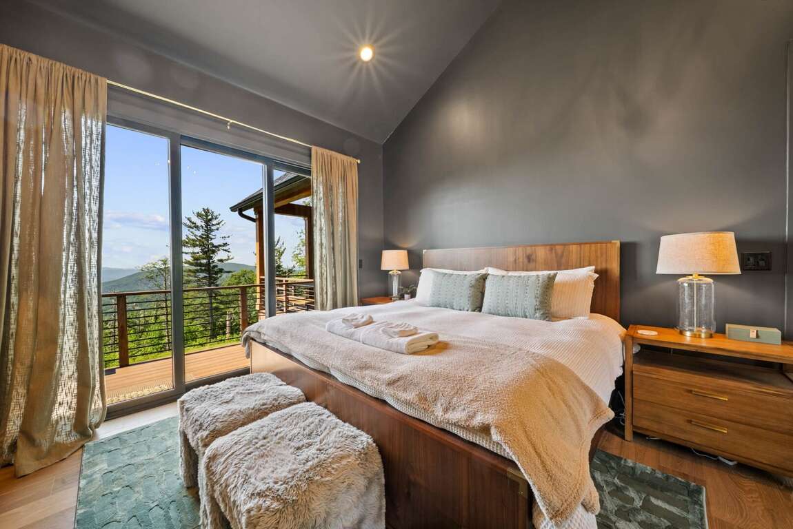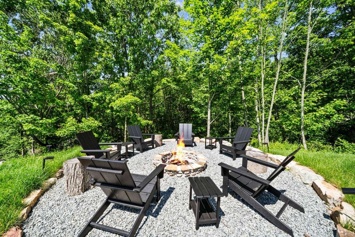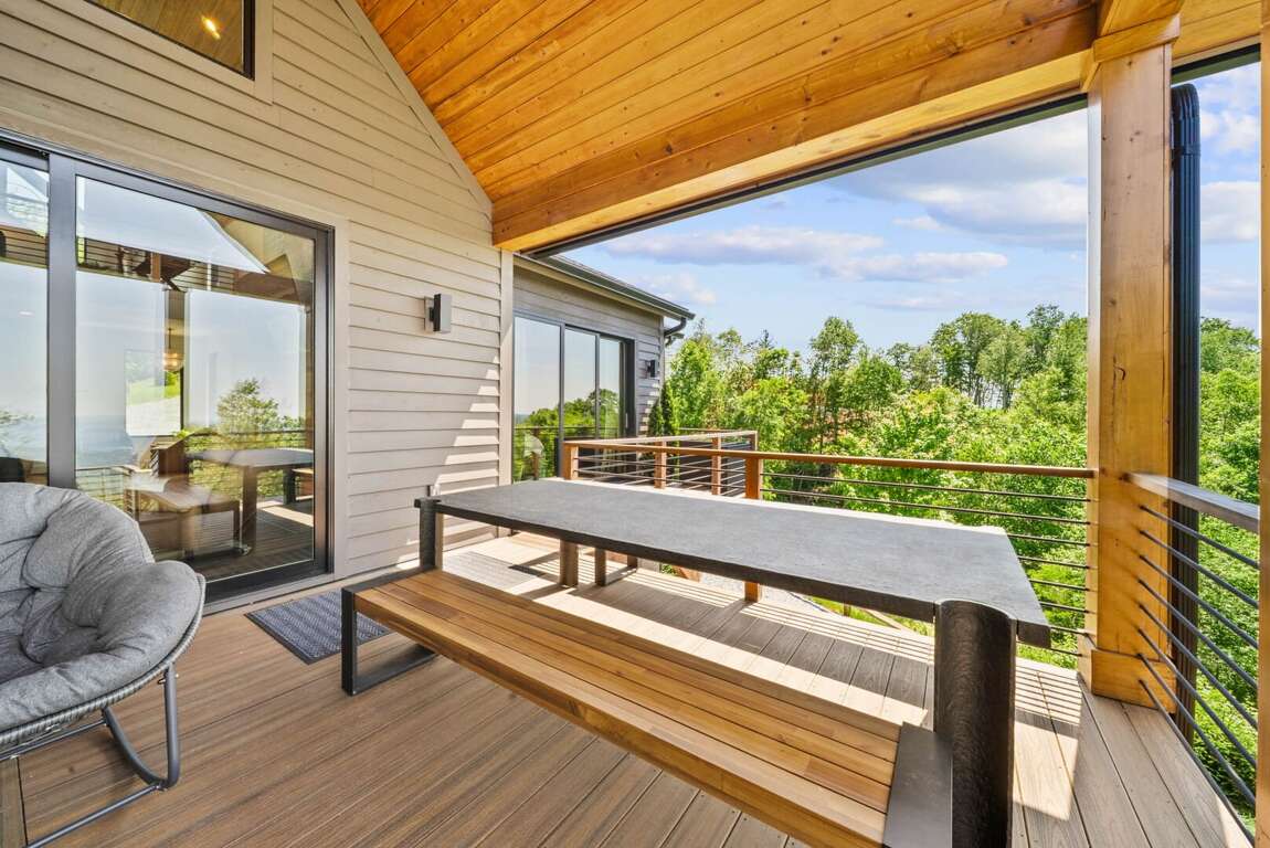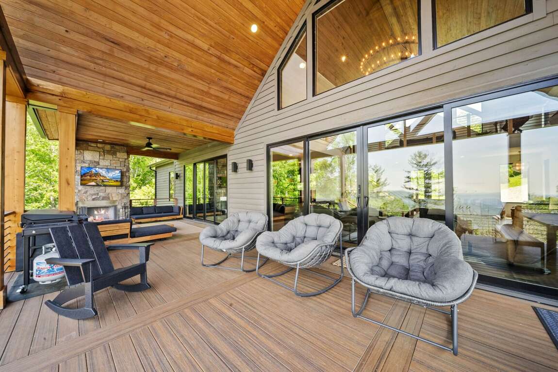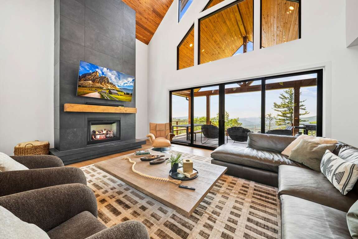 Step onto the expansive three-tiered deck and prepare to be wowed. Start your morning on the sunning platform or with coffee in the covered outdoor living room, where sleek, low-profile wood couches with plush cushions surround a stunning wood-burning fireplace and mounted TV. To the side, a group of cushioned rockers offers the perfect spot to unwind and watch the breeze move through the trees. Grill out and dine alfresco at the outdoor dining table, then soak in the private hot tub as stars emerge over the mountains. Later, follow the stone path to the fire pit in the yard — the perfect place for evening conversations and stargazing.