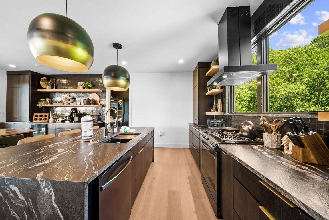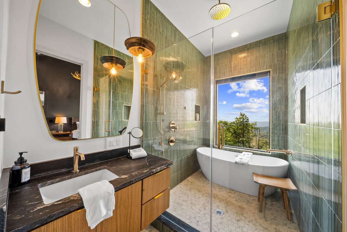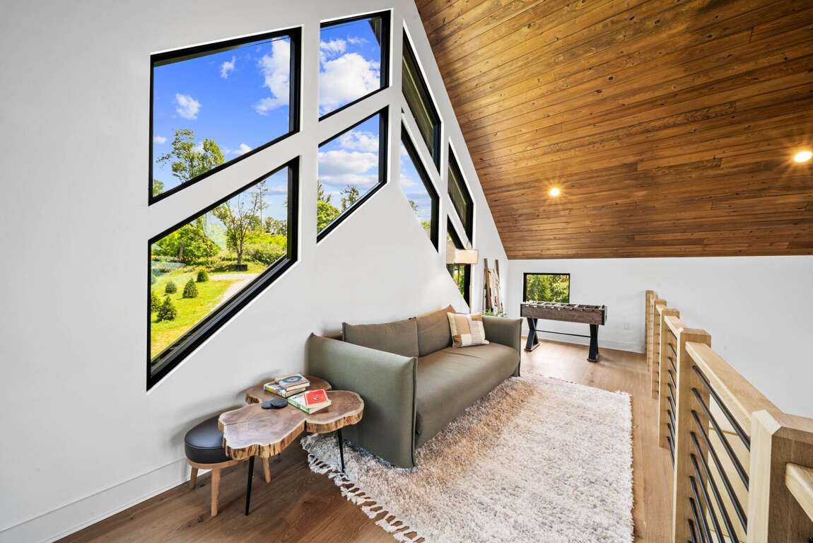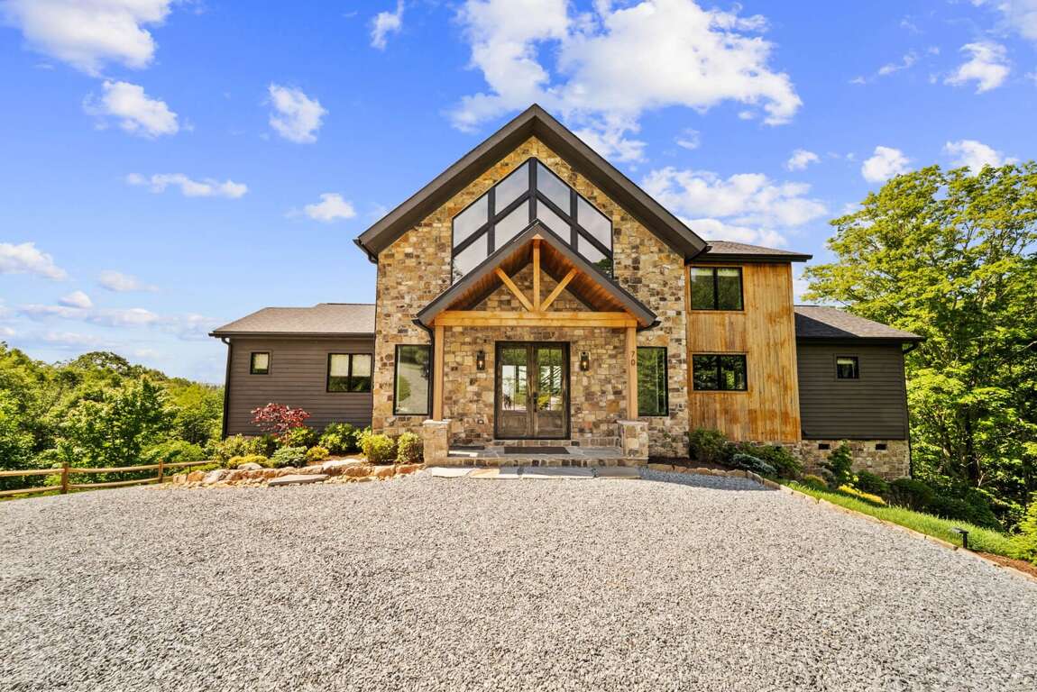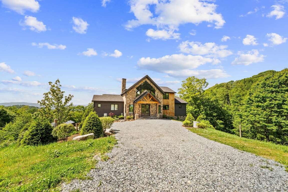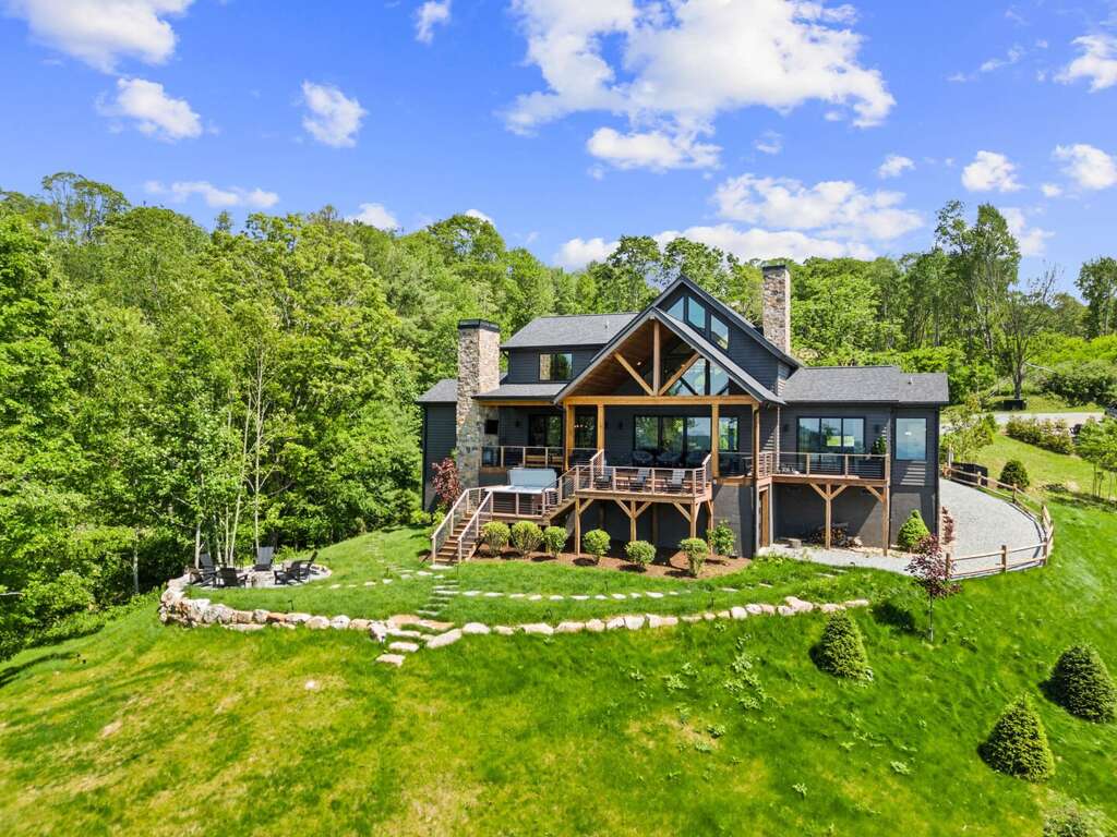 Step onto the expansive three-tiered deck and prepare to be wowed. Start your morning on the sunning platform or with coffee in the covered outdoor living room, where sleek, low-profile wood couches with plush cushions surround a stunning wood-burning fireplace and mounted TV. To the side, a group of cushioned rockers offers the perfect spot to unwind and watch the breeze move through the trees. Grill out and dine alfresco at the outdoor dining table, then soak in the private hot tub as stars emerge over the mountains. Later, follow the stone path to the fire pit in the yard — the perfect place for evening conversations and stargazing.