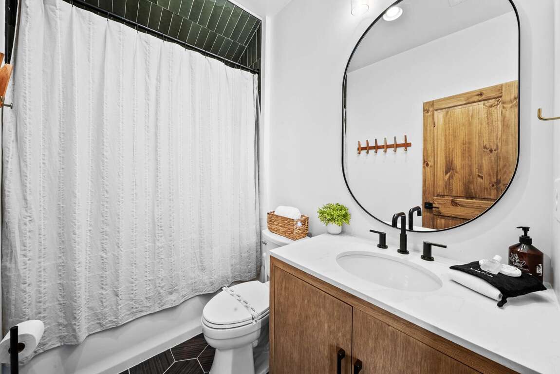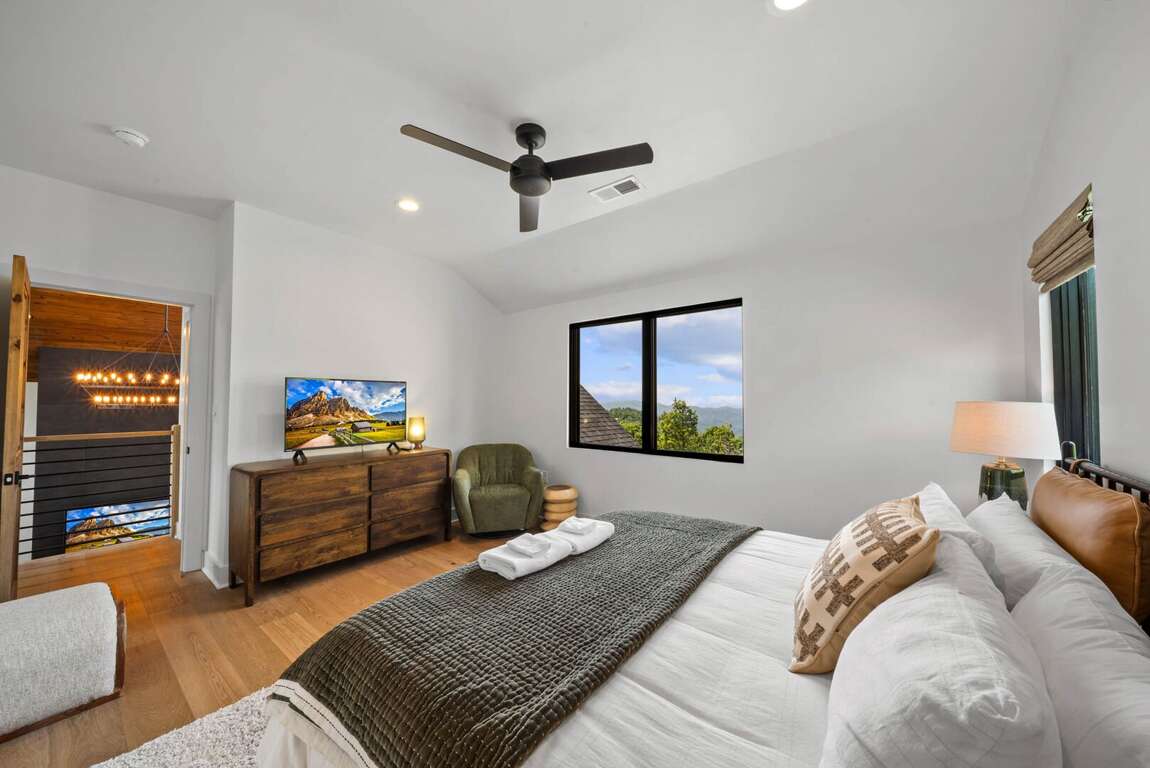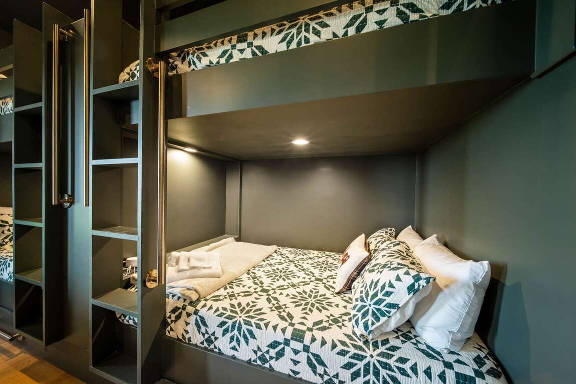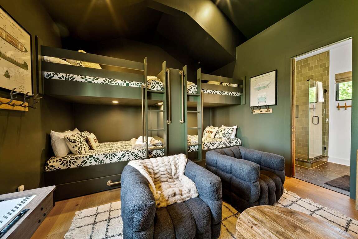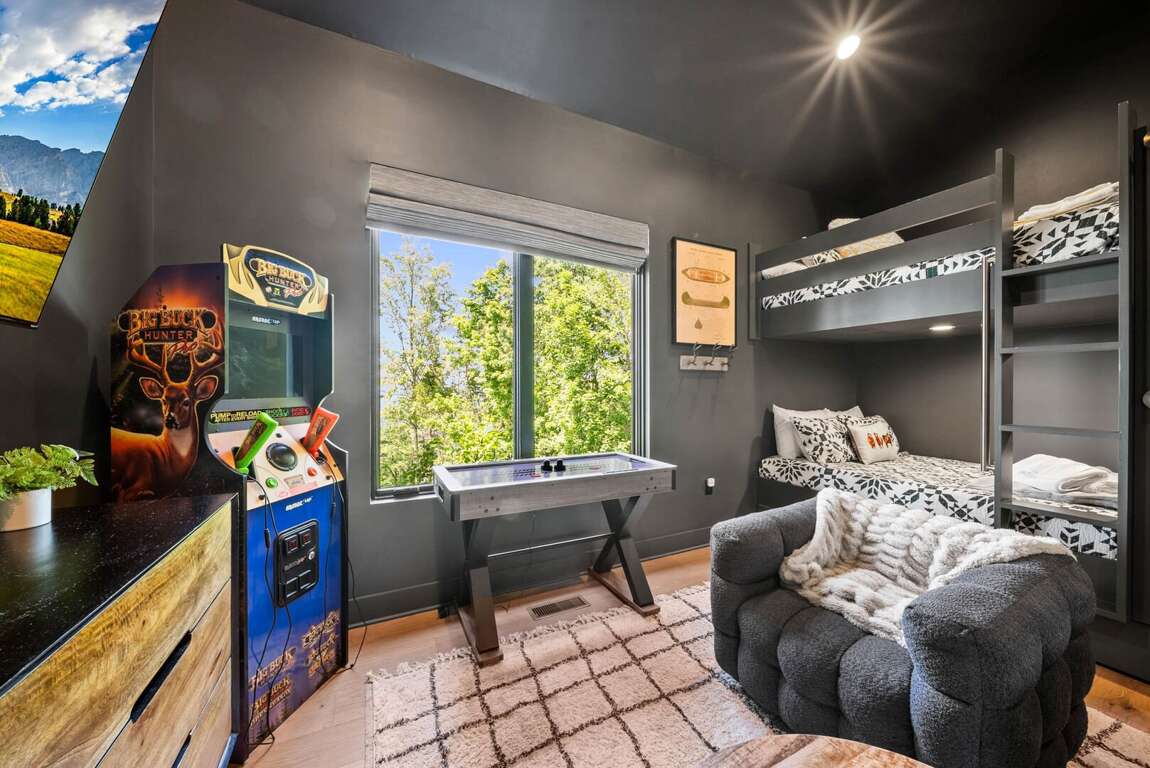 The main-level master suite is a serene retreat with a king bed, private deck access, long-range views, and a spa-style ensuite that includes a massive tiled shower with a soaking tub inside. The bunk room on the main level is custom-designed with double-over-double bunks (each with twin trundles), a cozy hangout space with TV, Buck Shot arcade, and air hockey table — a kid and teen favorite. Upstairs, the open loft overlooks the great room and includes a comfy couch that converts to a queen sleeper and a foosball table. Two beautifully furnished bedrooms — one with a king bed and one with a queen — share a full bathroom, offering additional space and privacy for guests.