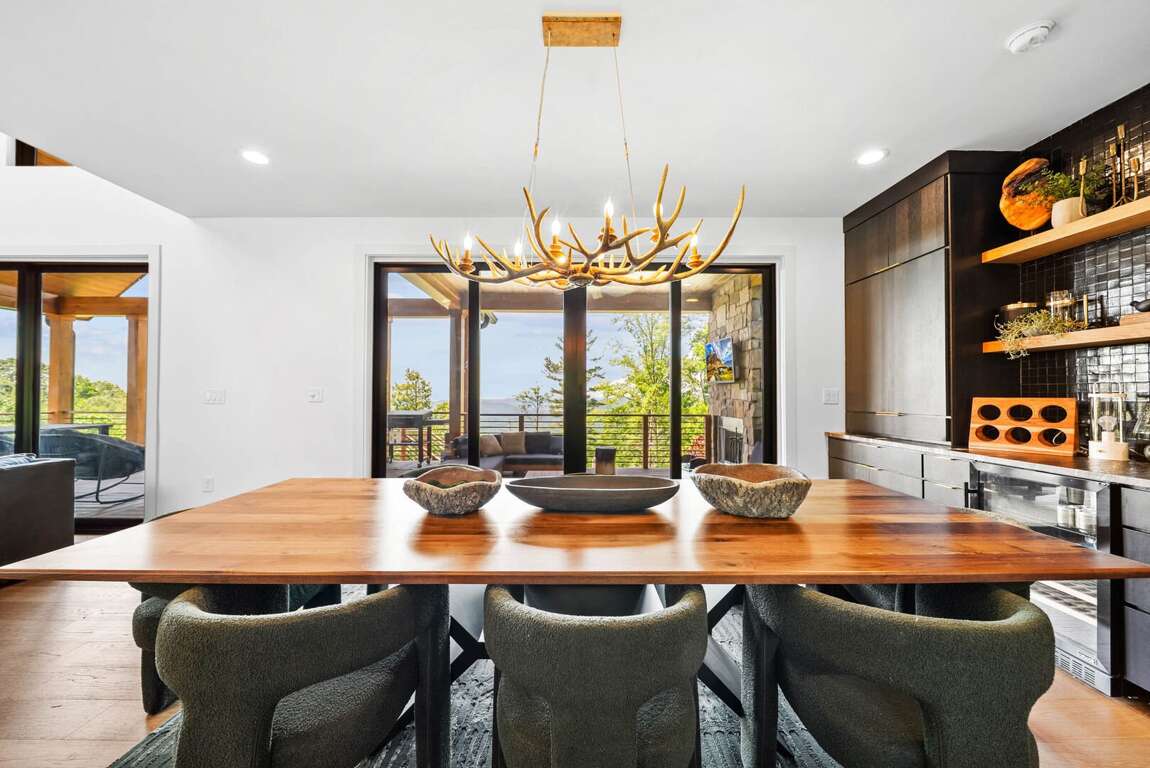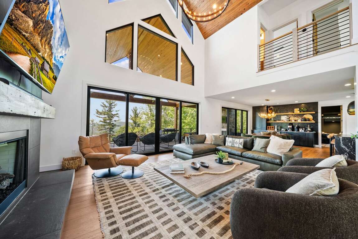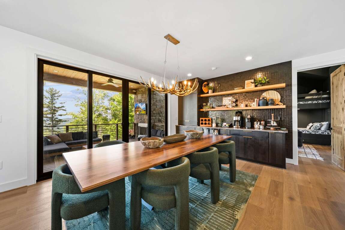 Inside, soaring vaulted ceilings and a wall of windows flood the great room with natural light and frame sweeping mountain views. Fine finishes, warm wood accents, and curated decor blend rustic charm with modern luxury. The open-concept main floor features a gourmet kitchen with everything you need to cook and gather, a coffee bar, a wood dining table, and a cozy living space anchored by a gas fireplace and smart TV.