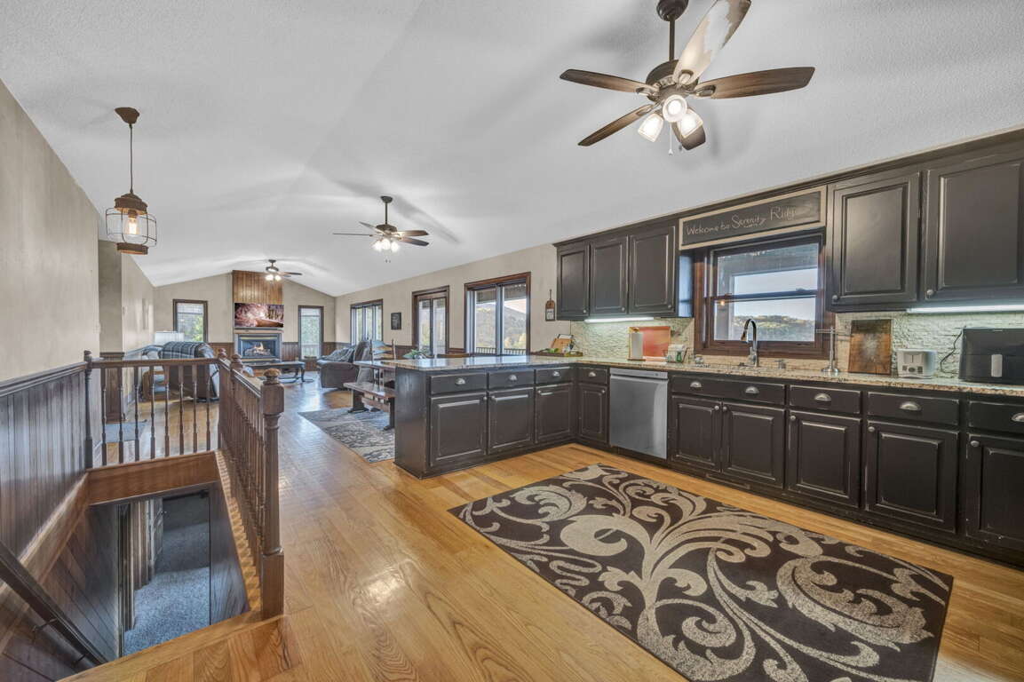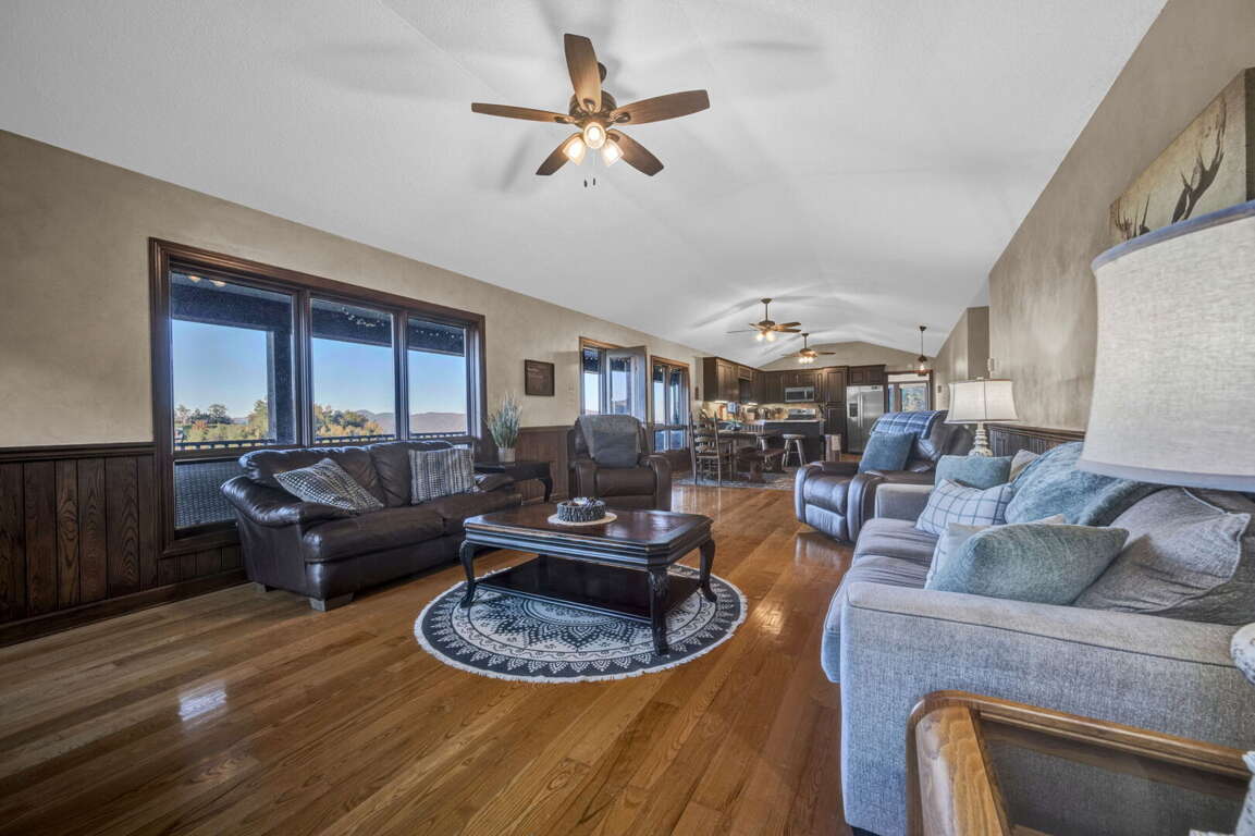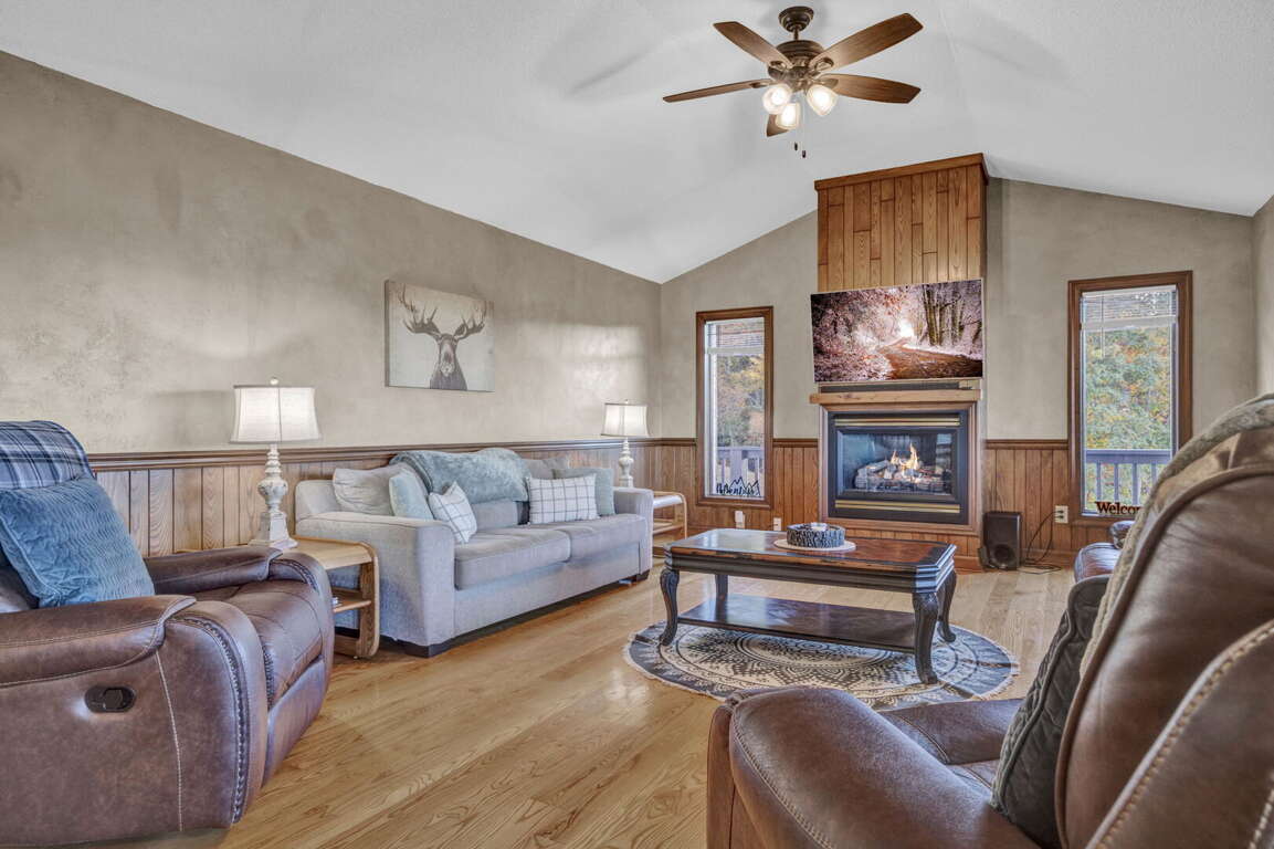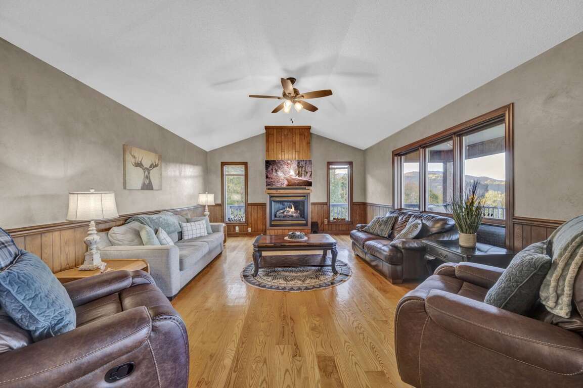 Inside, the main level is open and filled with natural light, with large windows that frame the surrounding landscape. The living room centers around a cozy gas fireplace and flat-screen TV, with plush seating for family and friends to gather.
