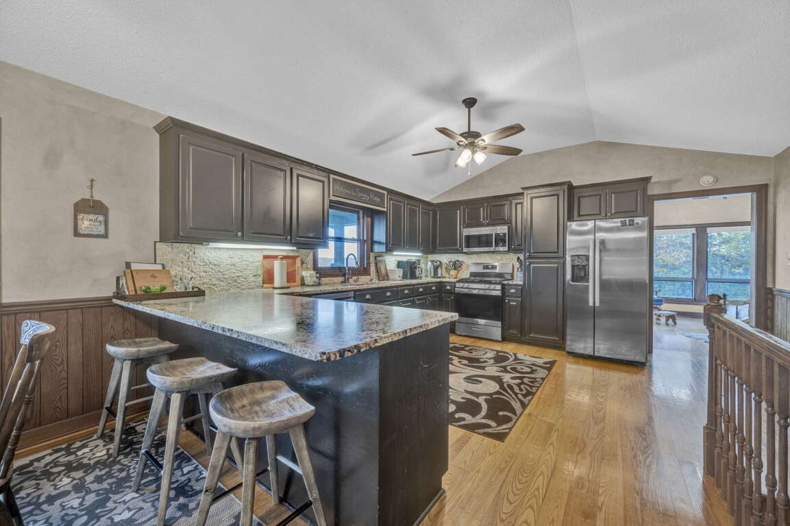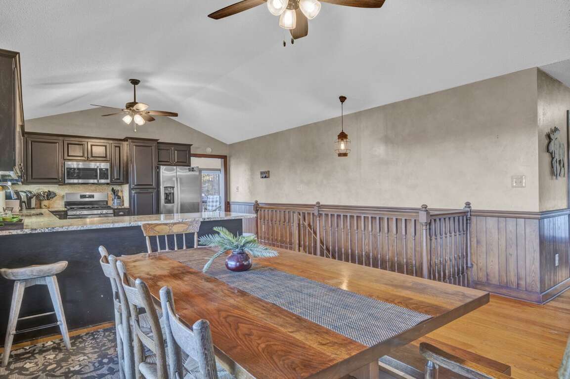 The well-appointed kitchen features granite countertops and a bar with seating for three, flowing seamlessly into the dining area with seating for eight. Also on this level is the primary suite, complete with a king bed and en suite bath with dual vanities and a tub/shower combo. A second queen bedroom with its own en suite bathroom is also on the main floor.
