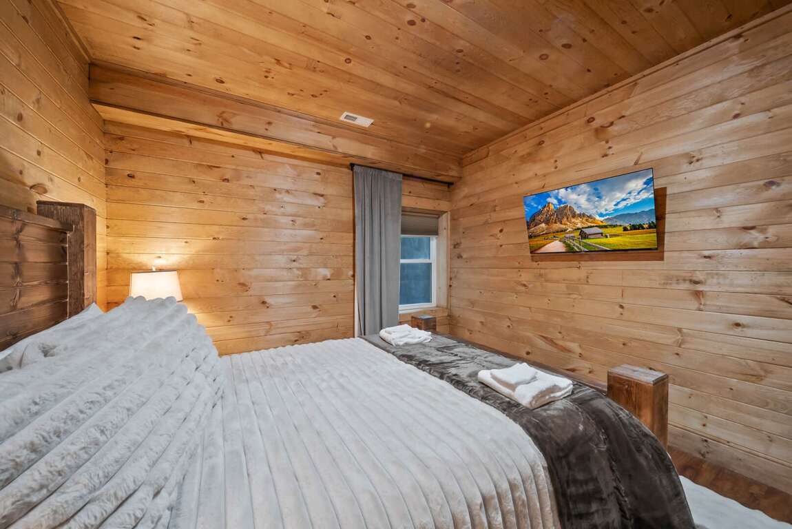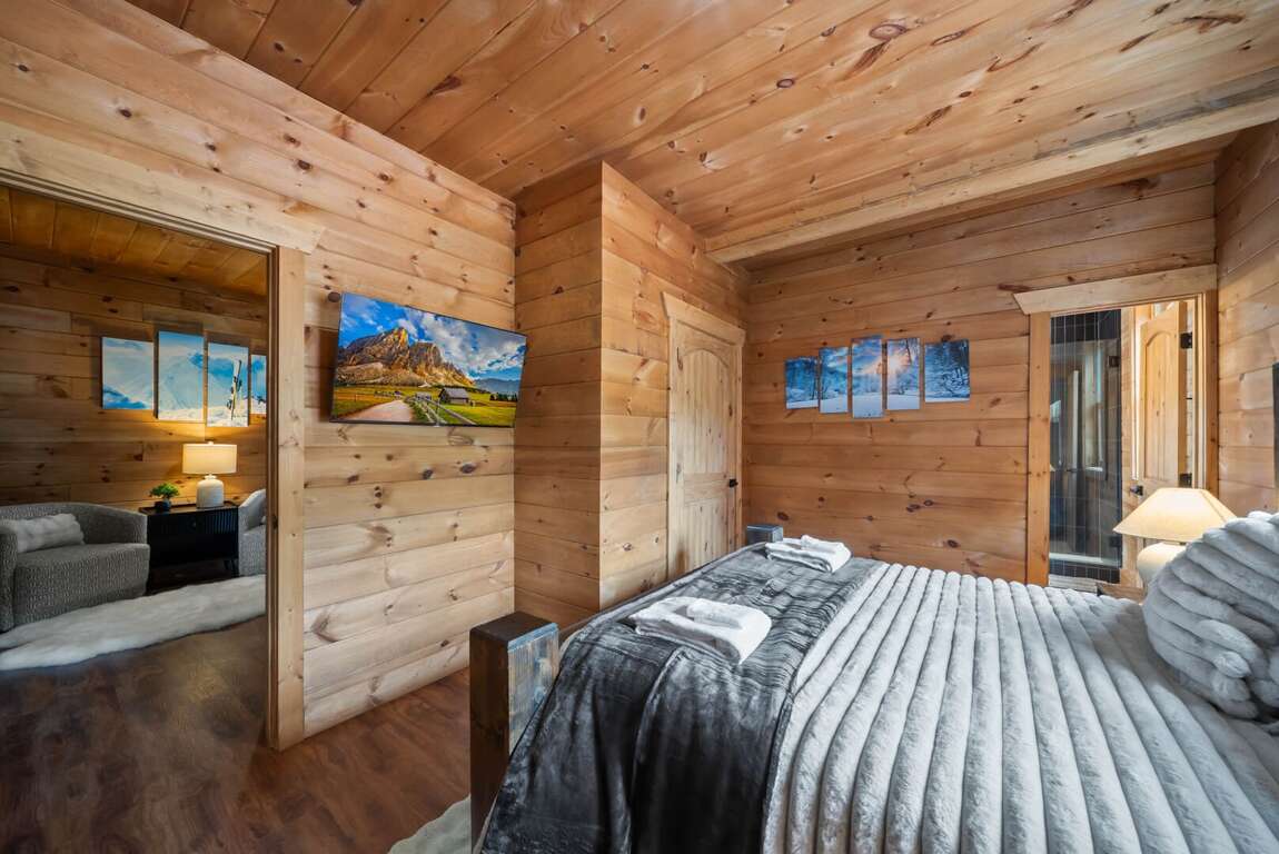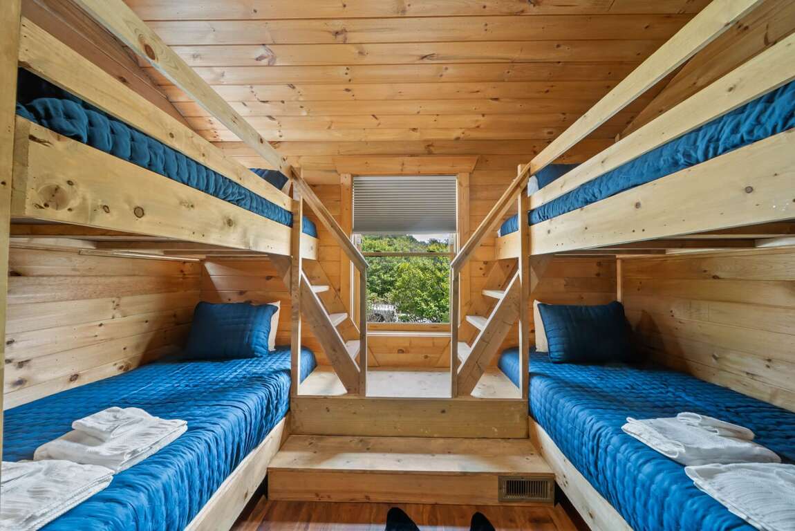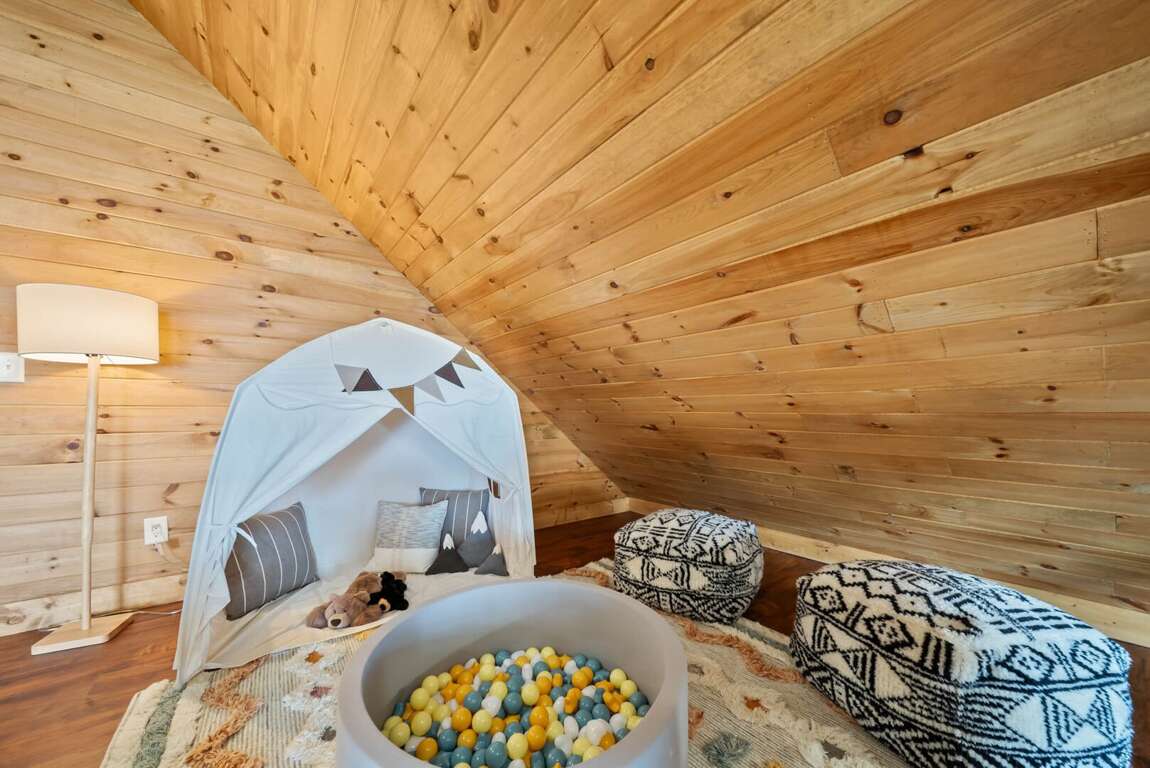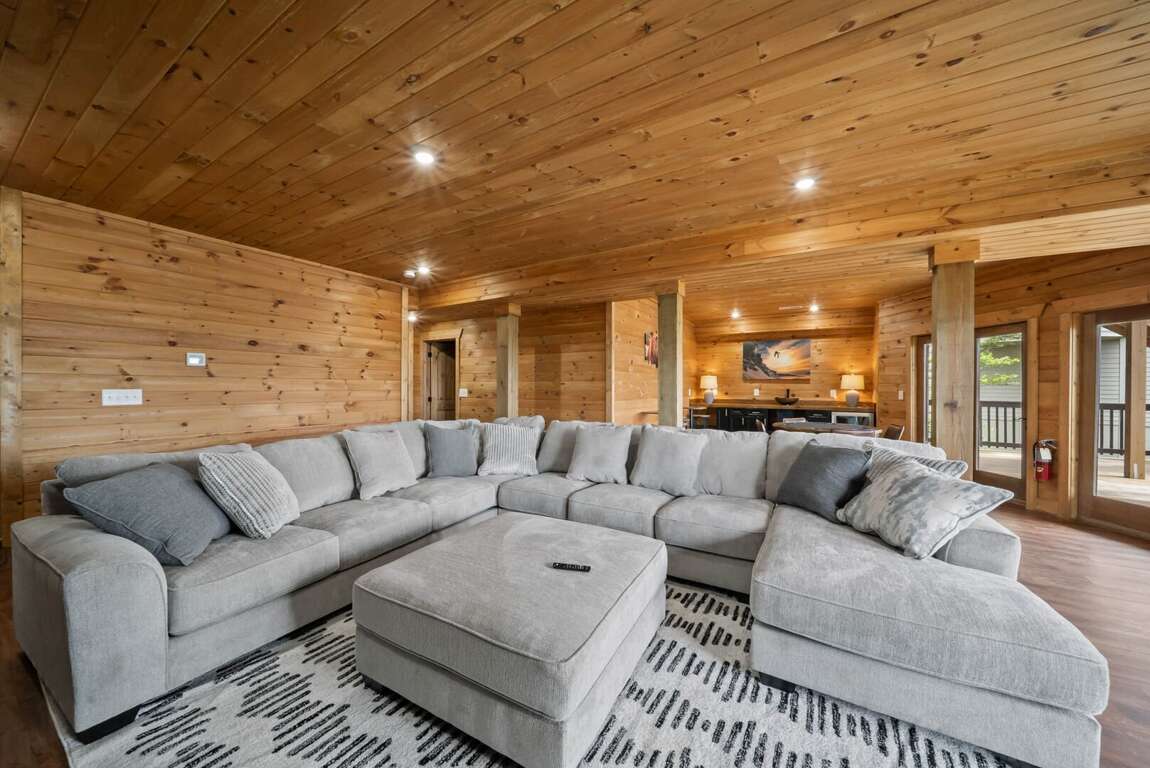 Sleeping arrangements are designed for comfort and flexibility. The main-level master suite includes a king bed, a spa-like bathroom with a custom-tiled shower, soaking tub, and private water room. A queen wing on the same floor offers two queen bedrooms, each with its own ensuite bathroom and a shared sitting area. Upstairs, a loft overlooking the great room serves as a kid-friendly play space with games, a play tent, and bean bag chairs, along with two bunk rooms—each with two custom-built twin-over-twin bunks accommodating up to eight children. On the lower level, two additional queen bedrooms share a full bathroom, and the laundry room is equipped with two modern washer/dryer combos for convenience.