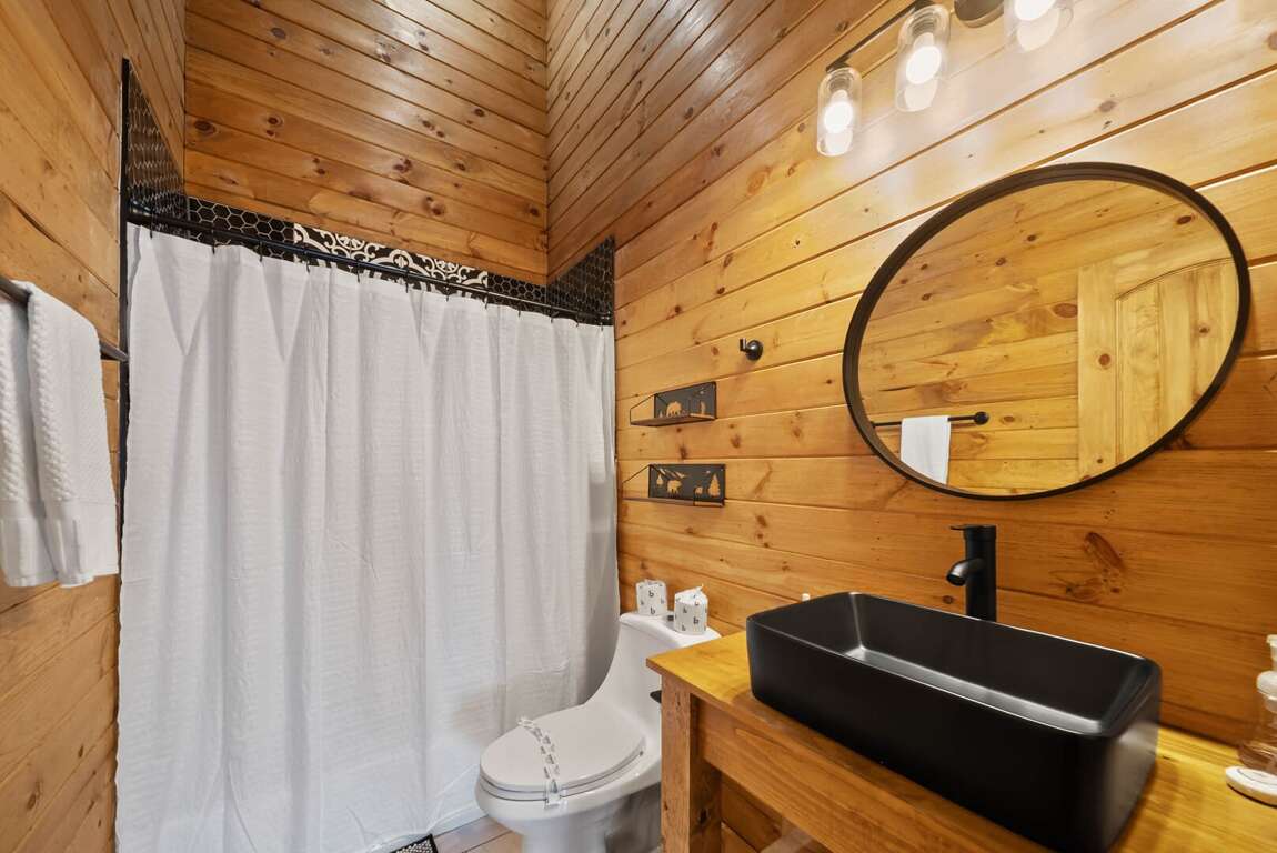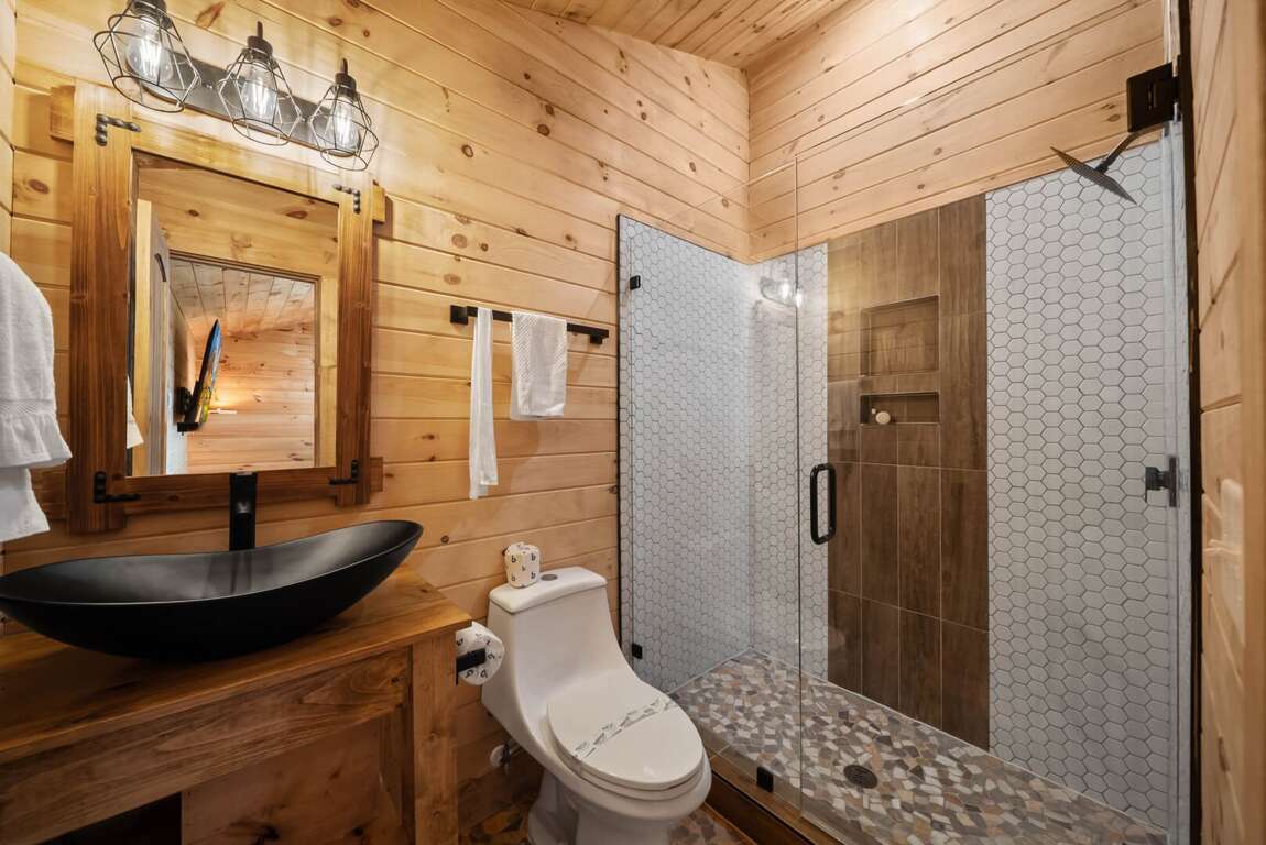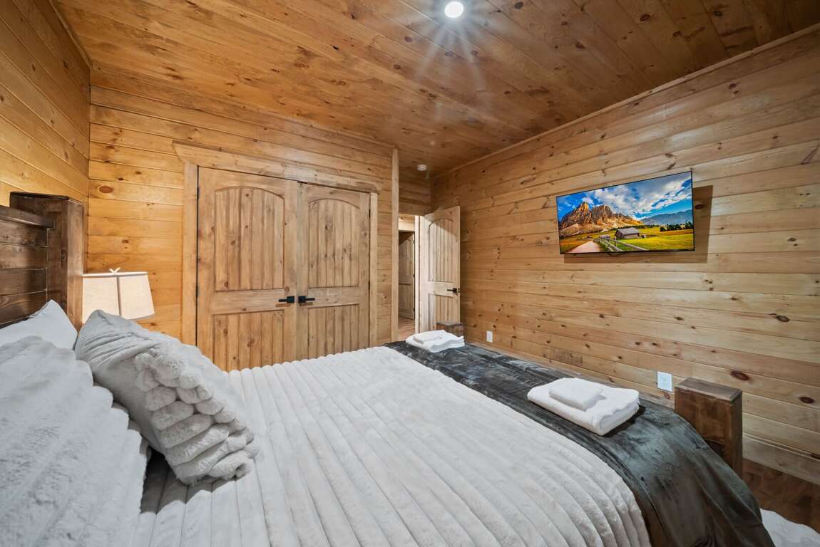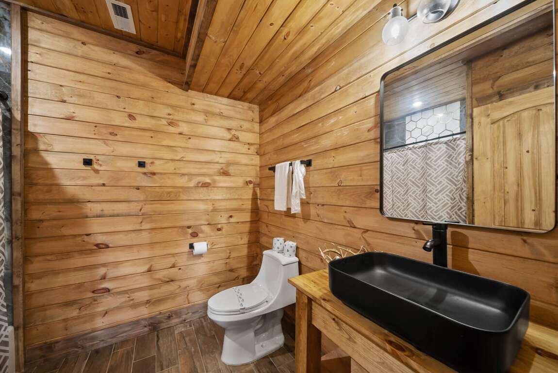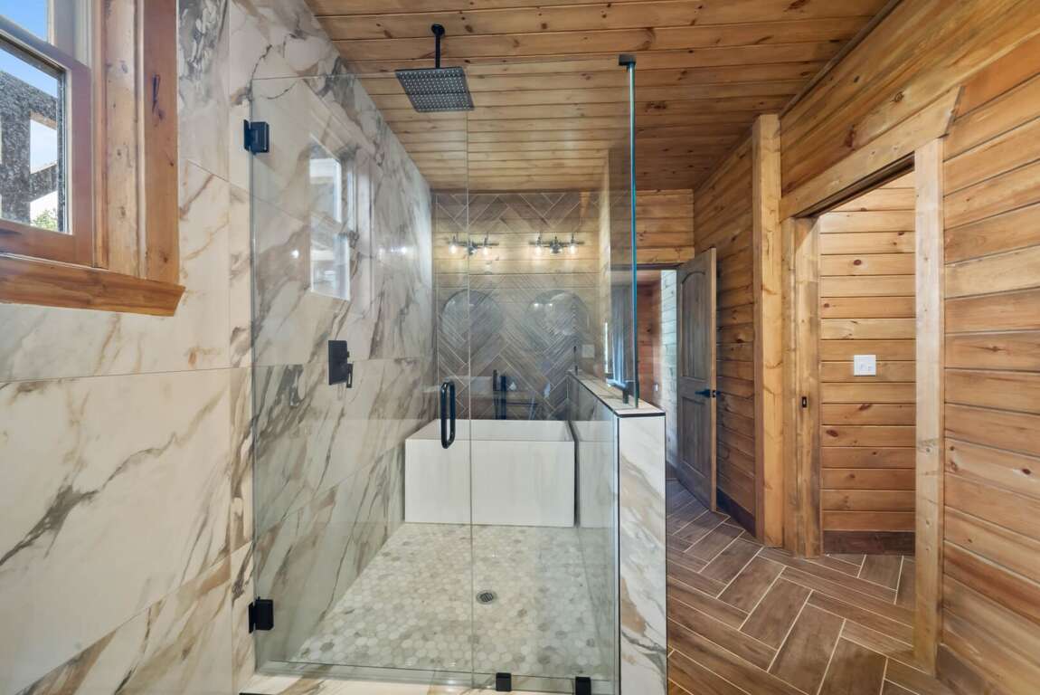 Sleeping arrangements are designed for comfort and flexibility. The main-level master suite includes a king bed, a spa-like bathroom with a custom-tiled shower, soaking tub, and private water room. A queen wing on the same floor offers two queen bedrooms, each with its own ensuite bathroom and a shared sitting area. Upstairs, a loft overlooking the great room serves as a kid-friendly play space with games, a play tent, and bean bag chairs, along with two bunk rooms—each with two custom-built twin-over-twin bunks accommodating up to eight children. On the lower level, two additional queen bedrooms share a full bathroom, and the laundry room is equipped with two modern washer/dryer combos for convenience.