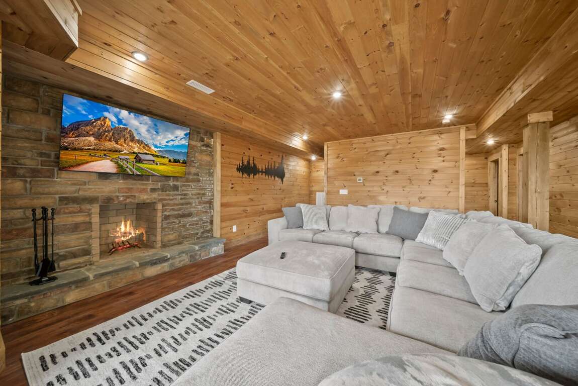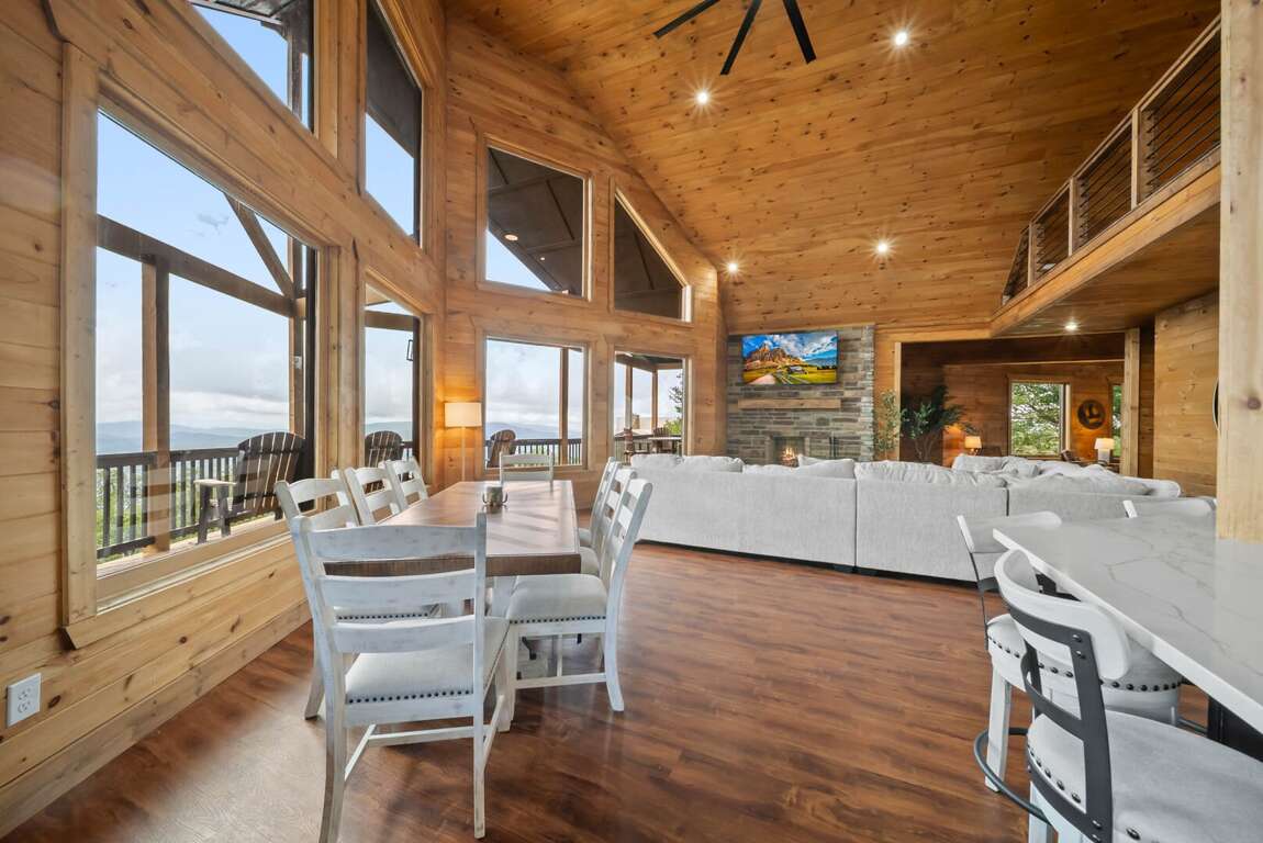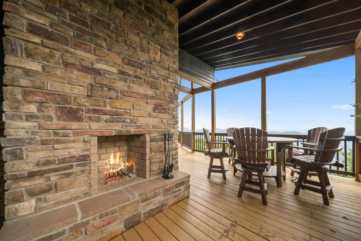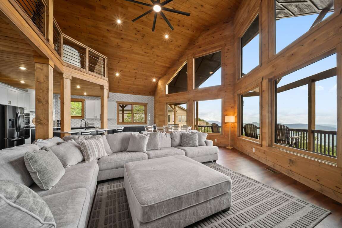 The main level’s open floor plan welcomes you with soaring ceilings, a wall of windows framing the panoramic view, and a stacked-stone wood-burning fireplace as the centerpiece. A sprawling sectional invites relaxation, while the state-of-the-art kitchen—complete with a gas stove, premium appliances, and generous counter space—makes hosting effortless. Step onto the deck to savor morning coffee or evening cocktails against a breathtaking backdrop.