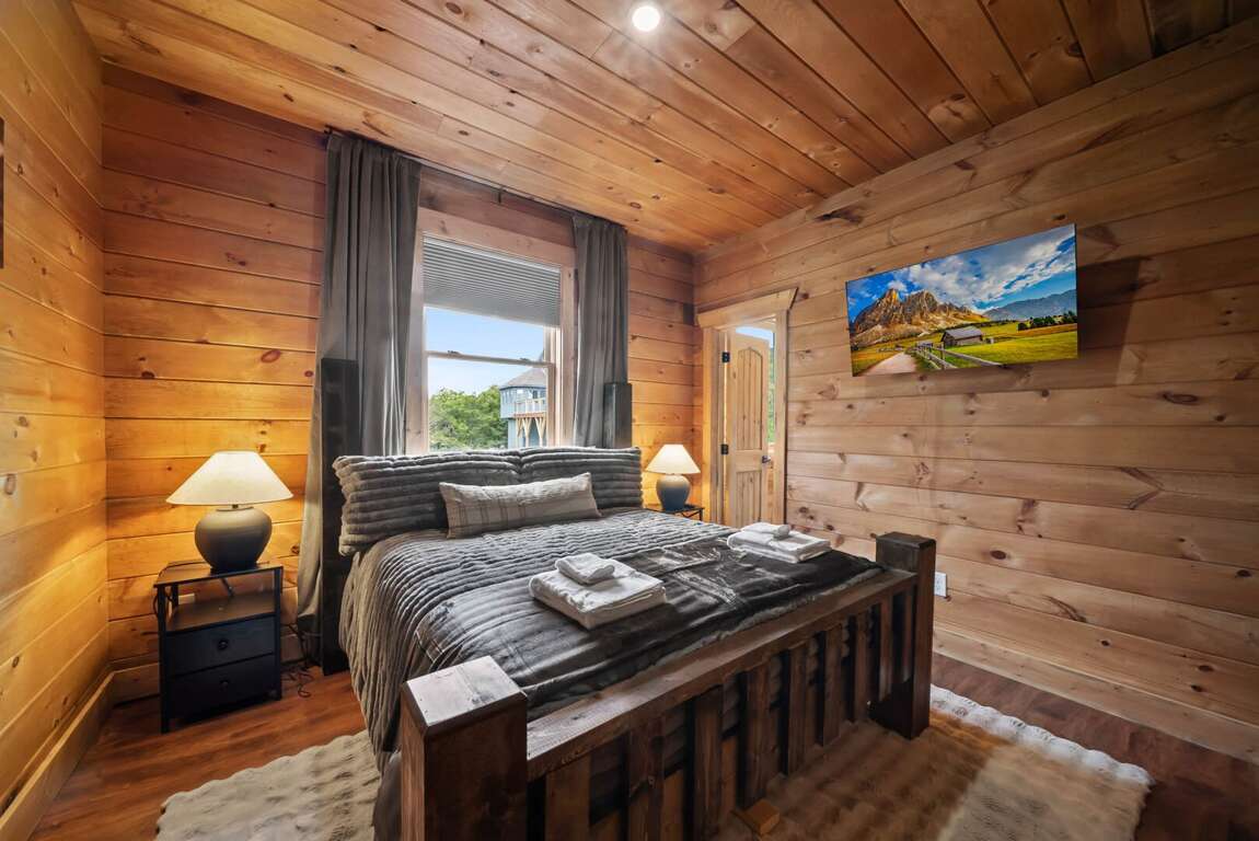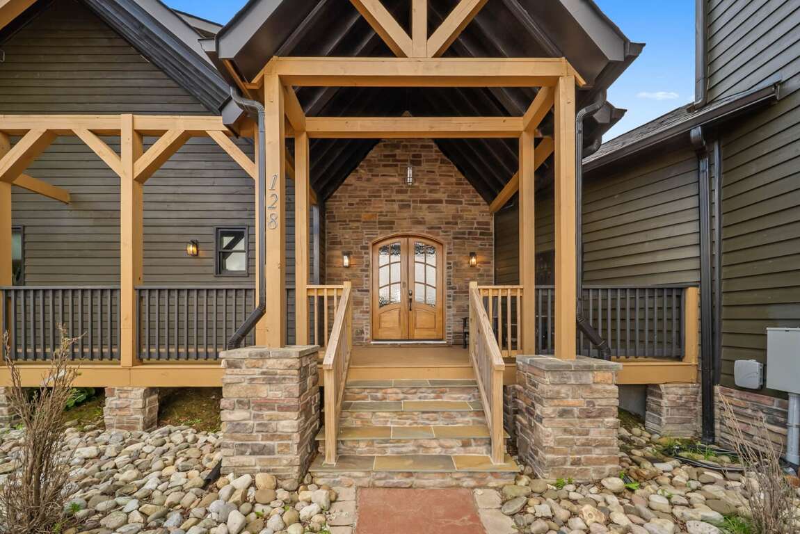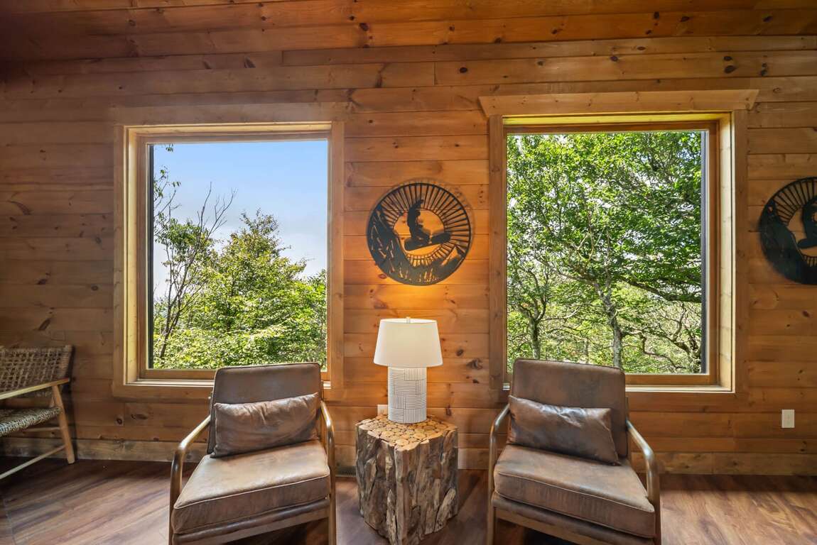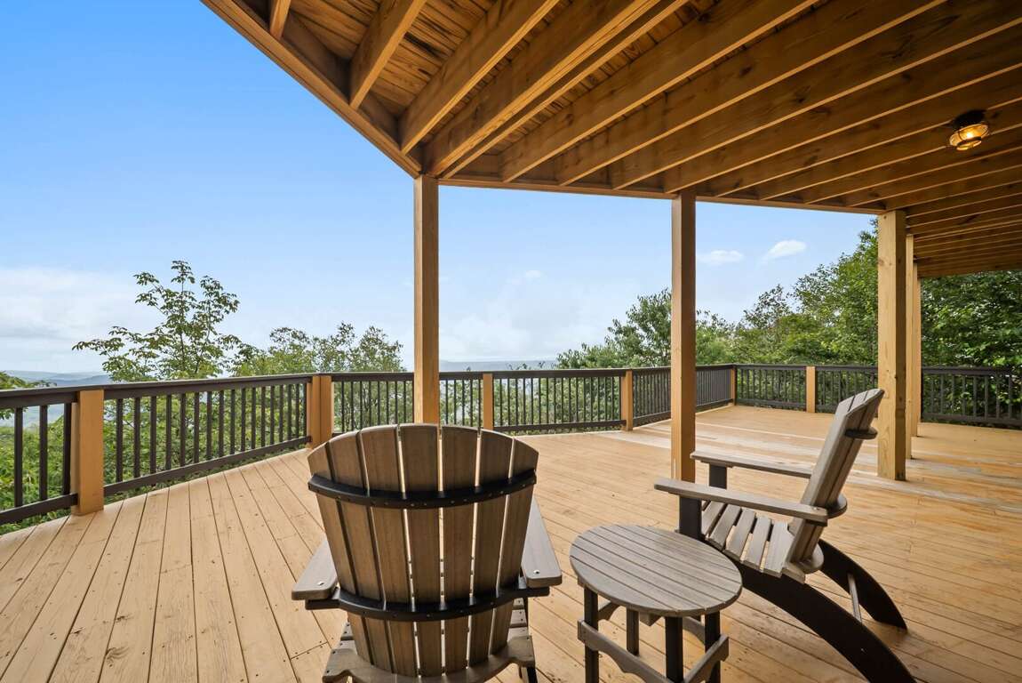 The main level’s open floor plan welcomes you with soaring ceilings, a wall of windows framing the panoramic view, and a stacked-stone wood-burning fireplace as the centerpiece. A sprawling sectional invites relaxation, while the state-of-the-art kitchen—complete with a gas stove, premium appliances, and generous counter space—makes hosting effortless. Step onto the deck to savor morning coffee or evening cocktails against a breathtaking backdrop.