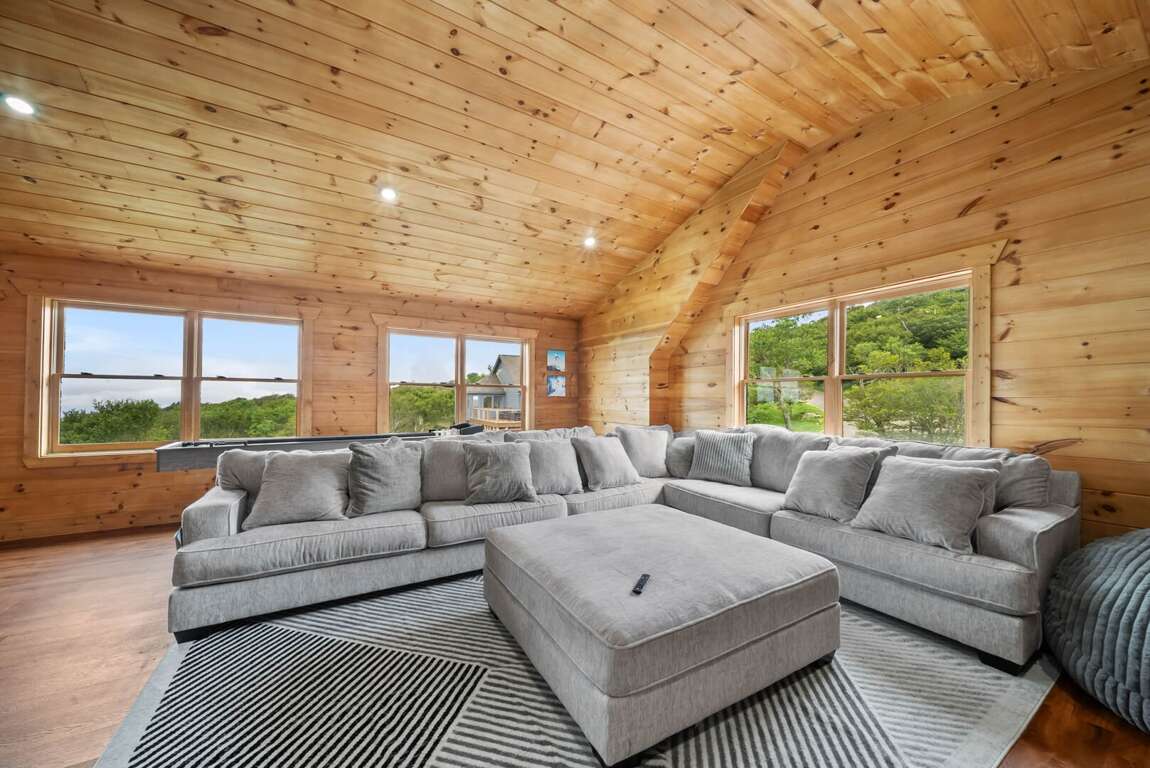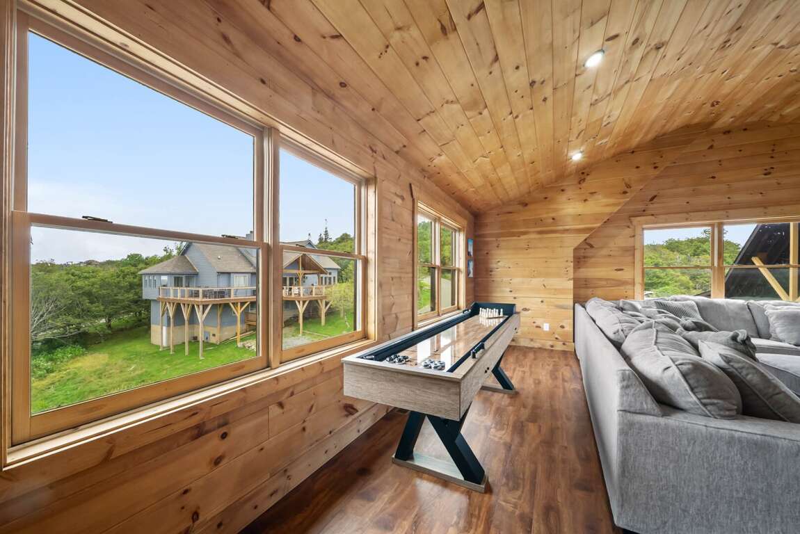 For entertainment, the upper-level Rec Room includes a huge sectional sofa, a TV, beverage chiller, and a shuffleboard table—perfect for après-ski fun. The Rec Room also includes 4 full-size inflatable air mattresses providing flexible sleeping for up to 4 guests. Downstairs, the lower-level family room provides another gathering space with a sectional sofa, wood-burning fireplace, mini wet bar, poker table, and access to a second deck. This lower deck features outdoor seating and a cozy wood-burning fireplace nook, all with the mountain view as a backdrop.