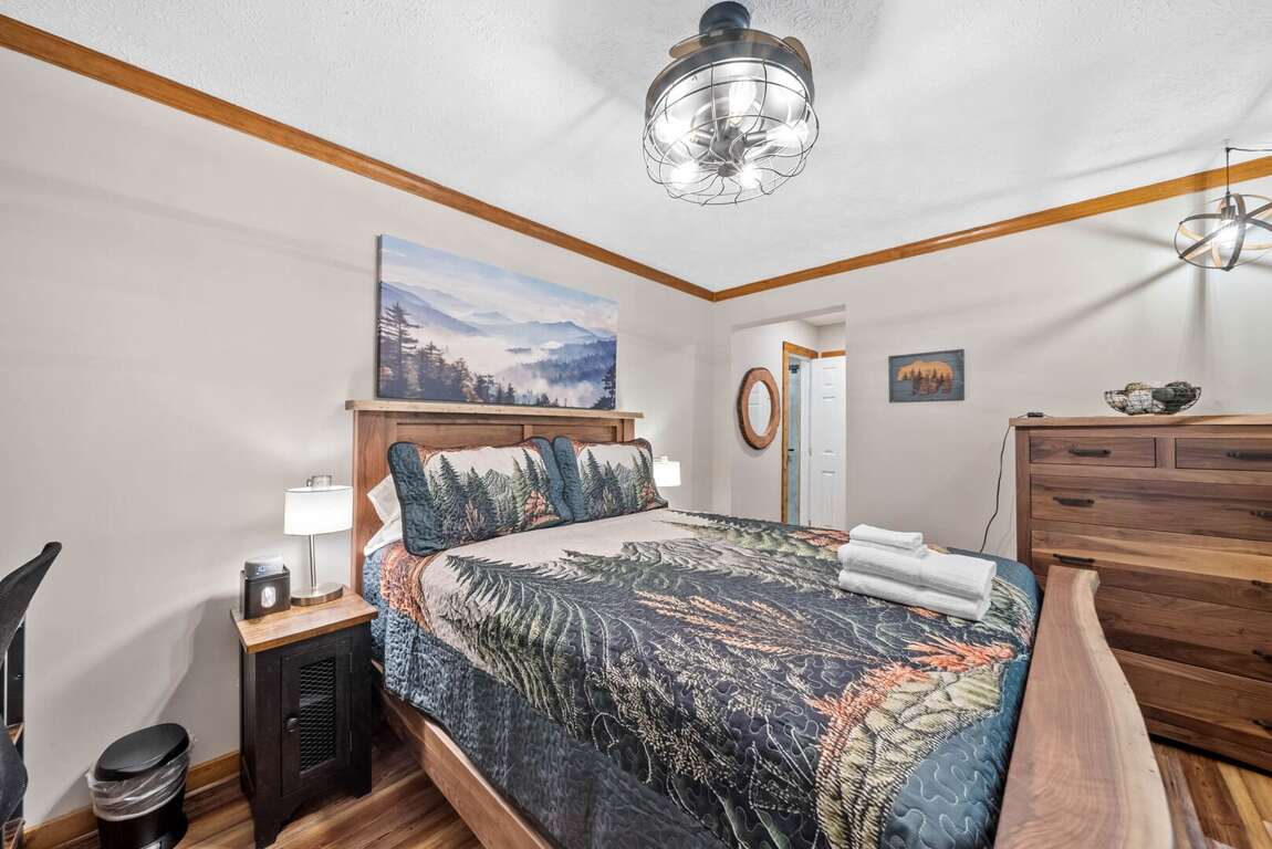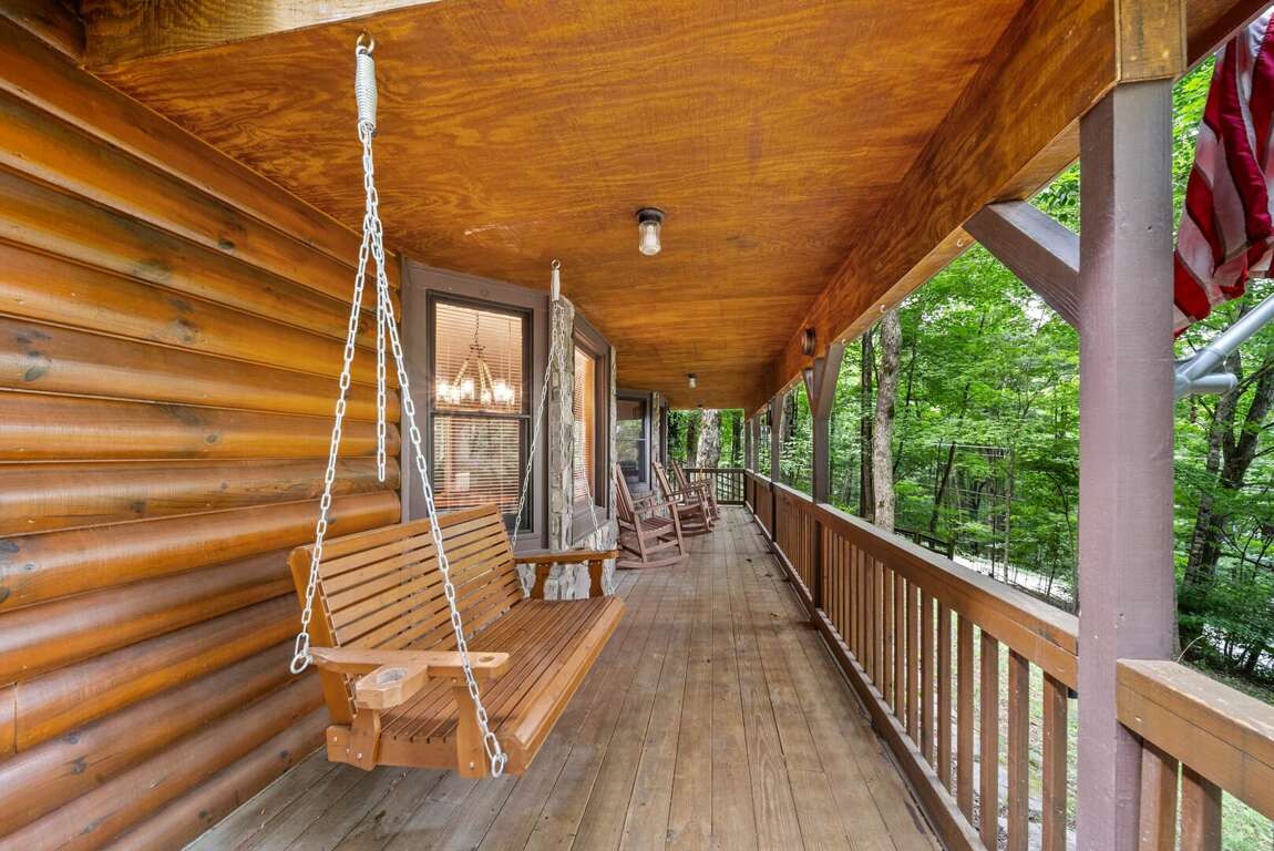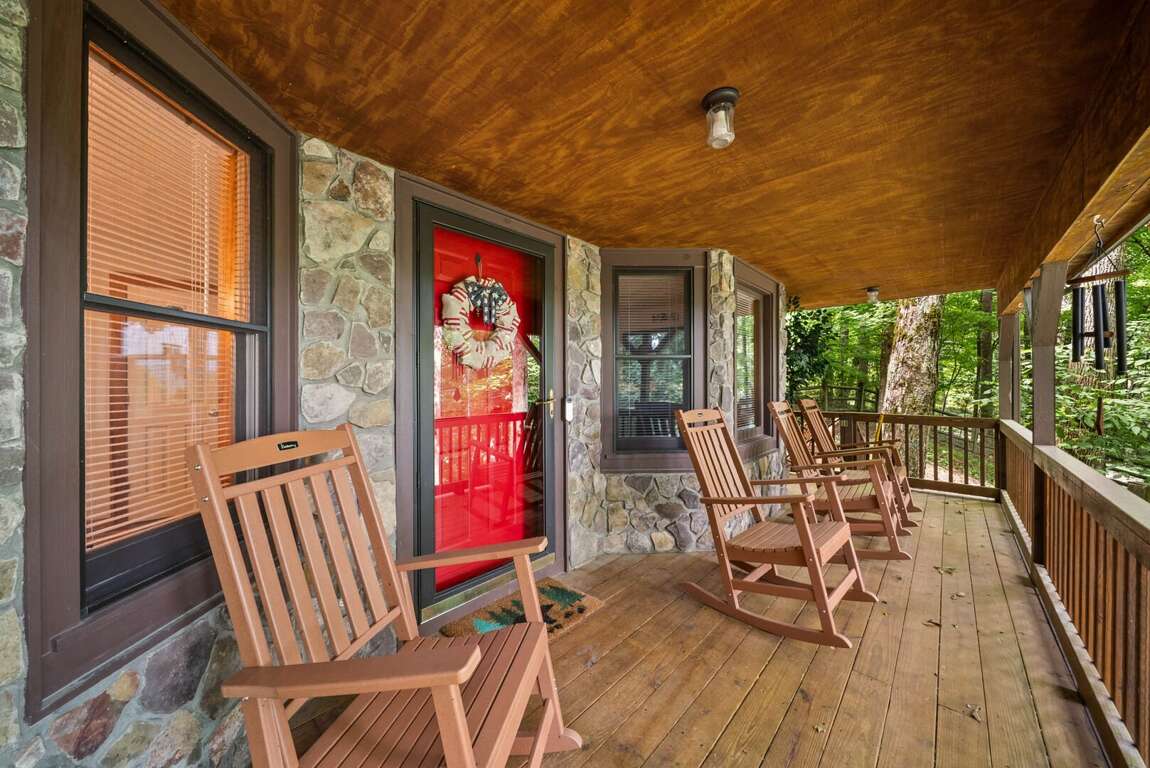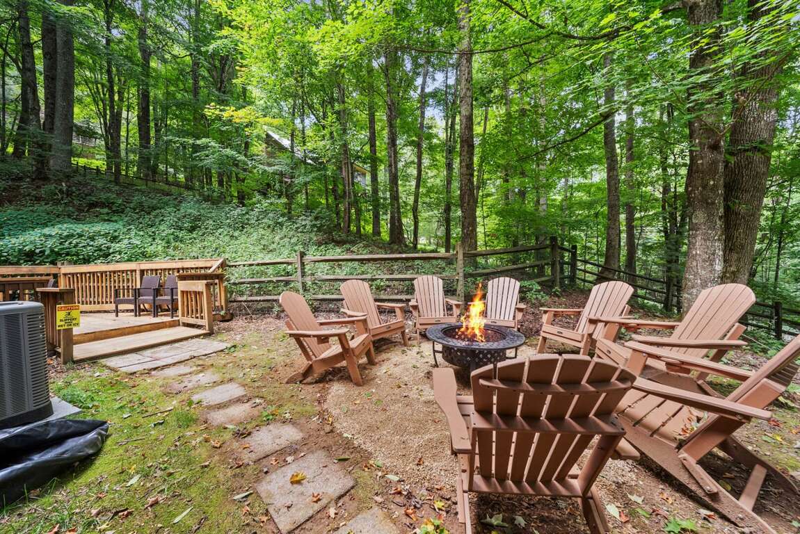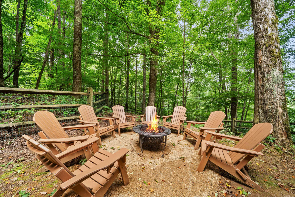 The cabin’s outdoor spaces are just as inviting. A covered front porch with a swing and rocking chairs overlooks the wooded setting, while two separate fire pits with Adirondack seating—one just off the back deck and another farther up the driveway—offer plenty of room for making s’mores under the stars. After a day of mountain adventures, unwind in the private hot tub.